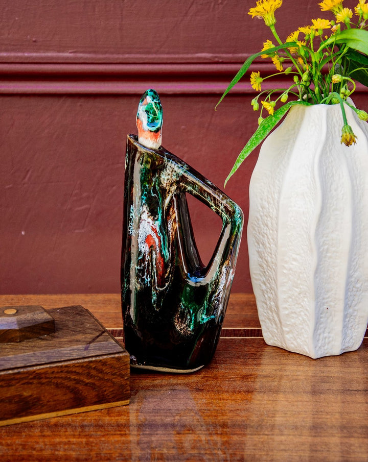 Découvrez ce magnifique petit pichet en céramique vintage Fat Lava, signé Vallauris, témoin du savoir-faire français des années 60. Sa silhouette moderne associée à un bouchon intérieur en liège lui confère un charme singulier, entre fonctionnalité et esthétisme. Anciennement associé à un service à liqueur, il se réinvente aujourd’hui comme une pièce forte de votre décoration ou pour sublimer vos décantations. Un bel objet au caractère rétro, parfait pour les amoureux de pièces uniques et chargées d’histoire.