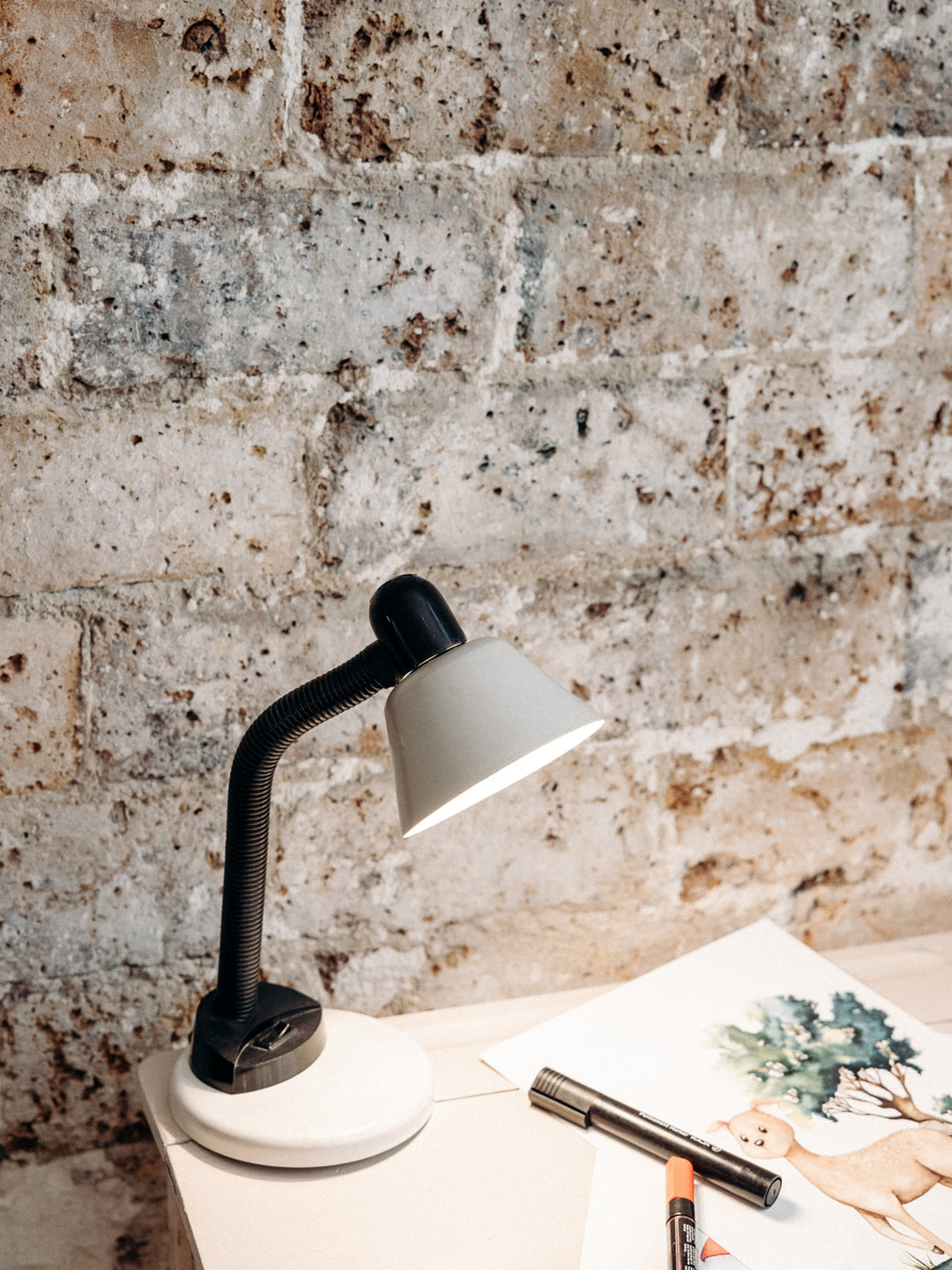 Cette jolie lampe de bureau en métal bleu, jaune et rouge des années 90 est dotée d'un mécanisme articulé offrant une flexibilité pour orienter la lumière selon vos besoins. Le bouton poussoir a été placé sur le pied. Le compagnon de travail parfait pour aménager votre bureau ou celui de votre enfant !
