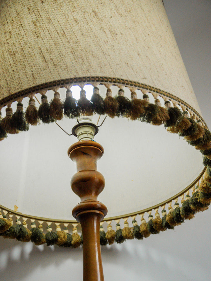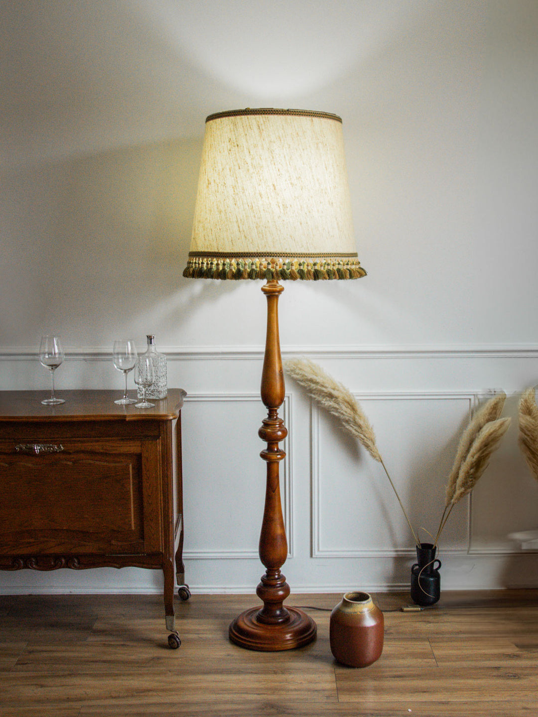Apportez une touche d'élégance à votre intérieur avec ce lampadaire en bois verni, alliant esthétisme et fonctionnalité. Son liseré finement tissé, présente un léger accroc, il diffuse une lumière agréable et chaleureuse. Parfait pour embellir un coin lecture ou mettre en valeur un espace de vie, ce lampadaire s’intègre harmonieusement dans tous les styles de décoration. Un choix idéal pour ceux qui recherchent un éclairage chic et une ambiance chaude.