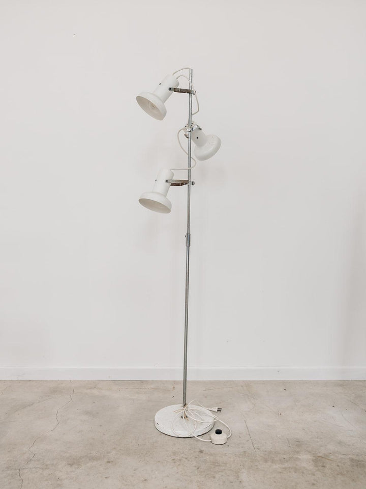 Julien, c'est notre nouveau lampadaire seventies ! Ce lampadaire de style industriel en métal blanc et métal chromé est composé de trois projecteurs orientables. Il comporte de légers éclats témoignant de son ancienne vie. Julien prend place dans le salon ou dans la chambre et illumine l'espace avec style.