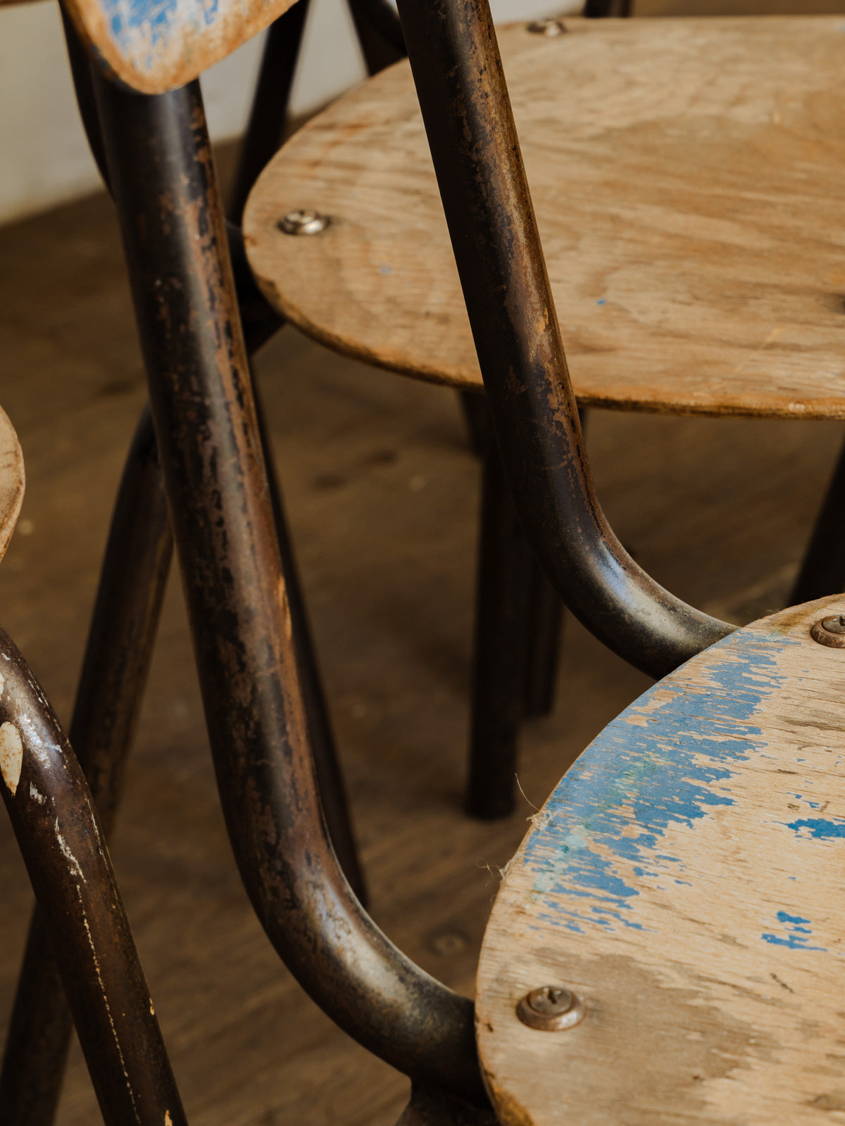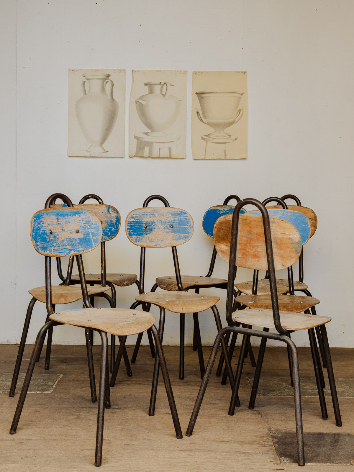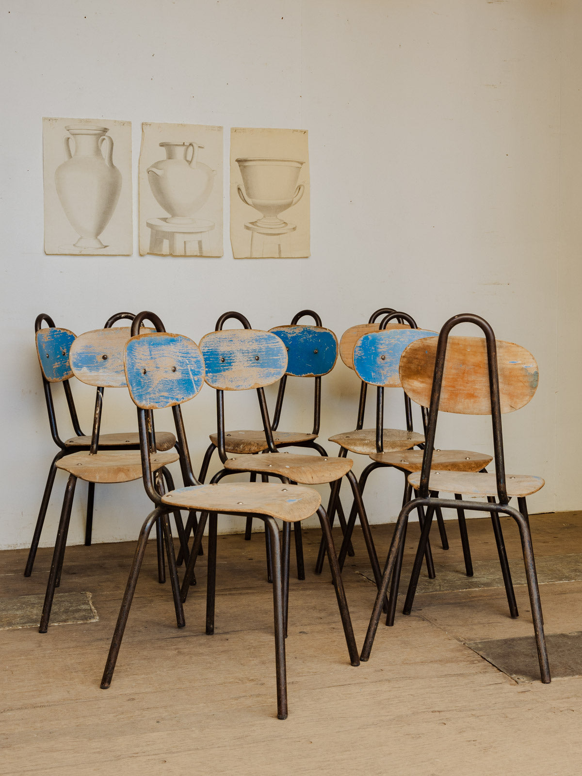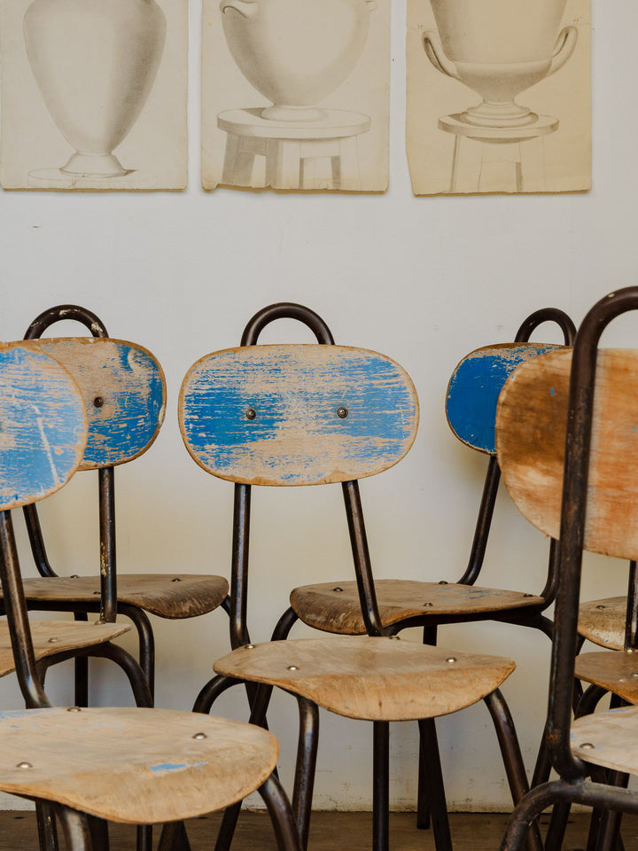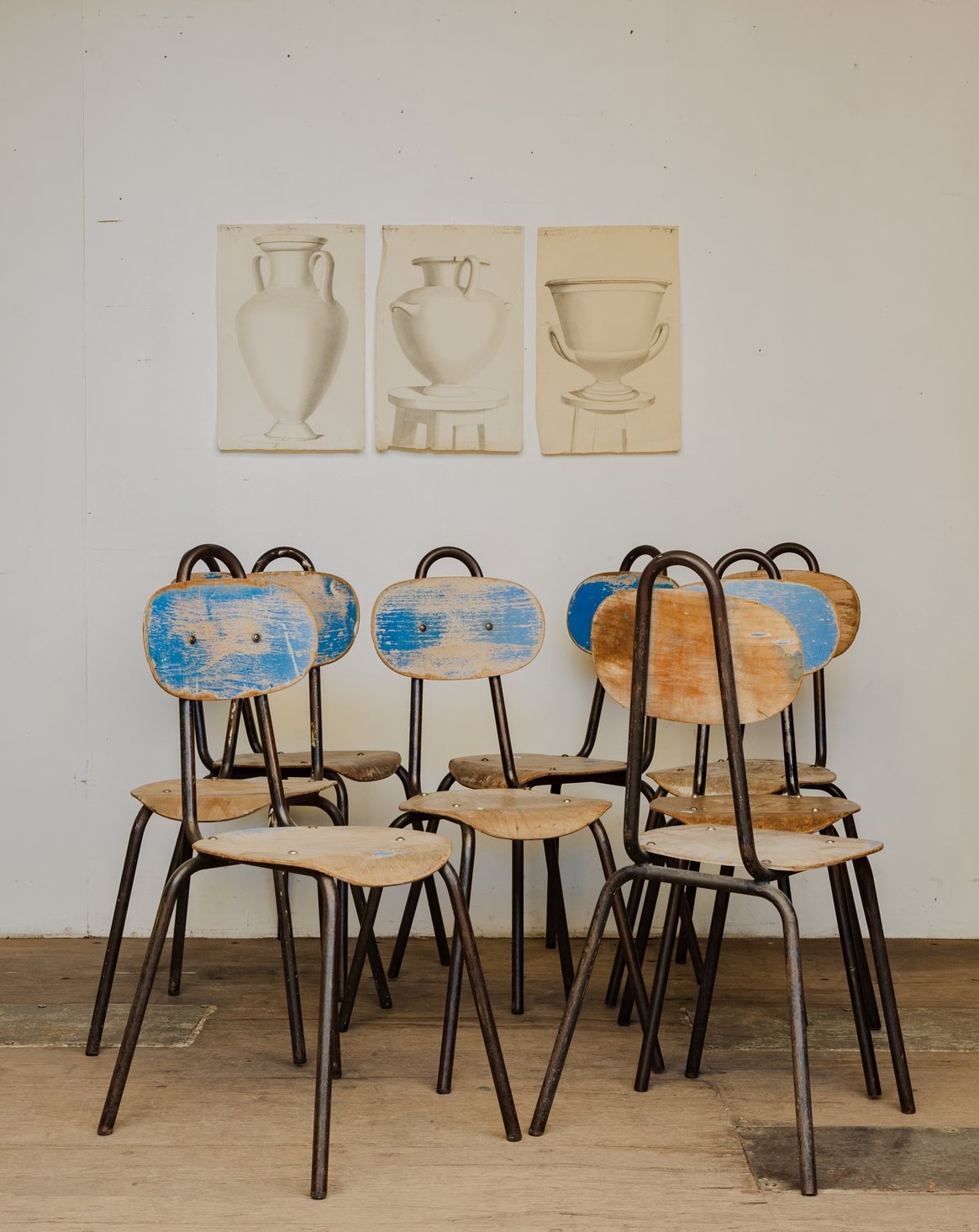 Découvrez notre lot de 8 chaises des années 50, alliant élégance rétro et confort moderne. Avec leur structure en métal patinée, ces chaises se distinguent par leurs assises et dossiers en bois, habillés d'un bleu passé. Parfaites pour apporter une touche vintage à votre intérieur, elles s'intégreront harmonieusement dans une cuisine, une salle à manger ou un bureau. Un choix idéal pour allier style et praticité dans votre décoration.