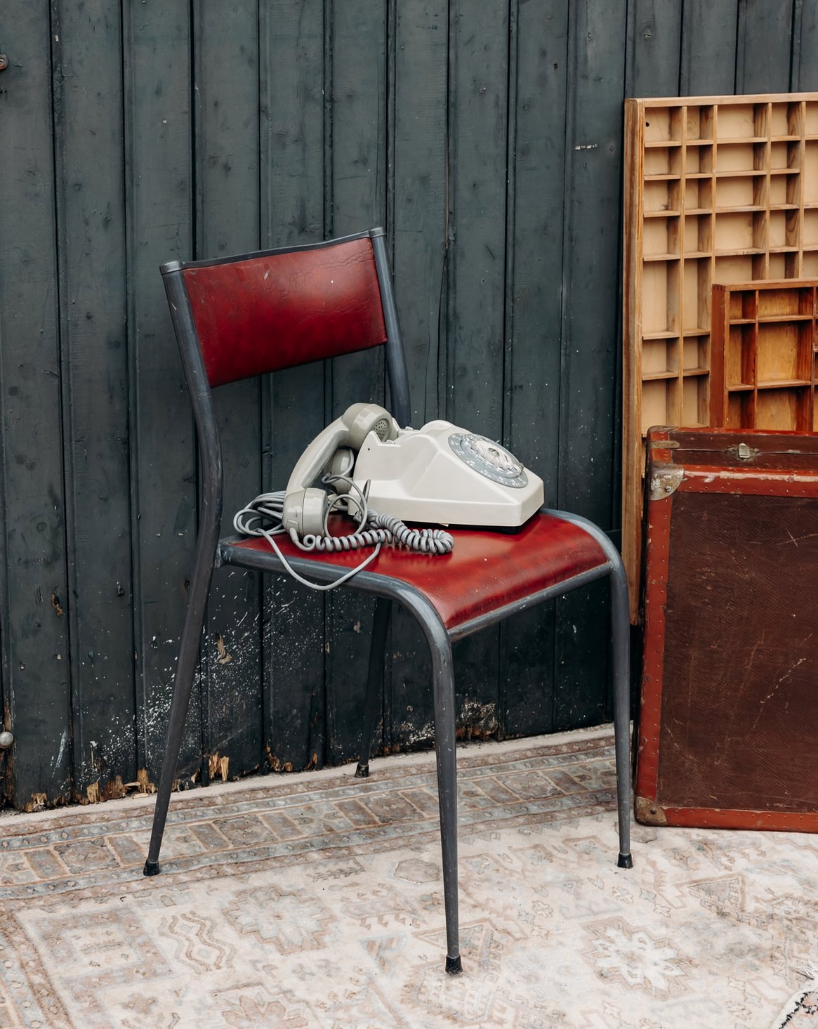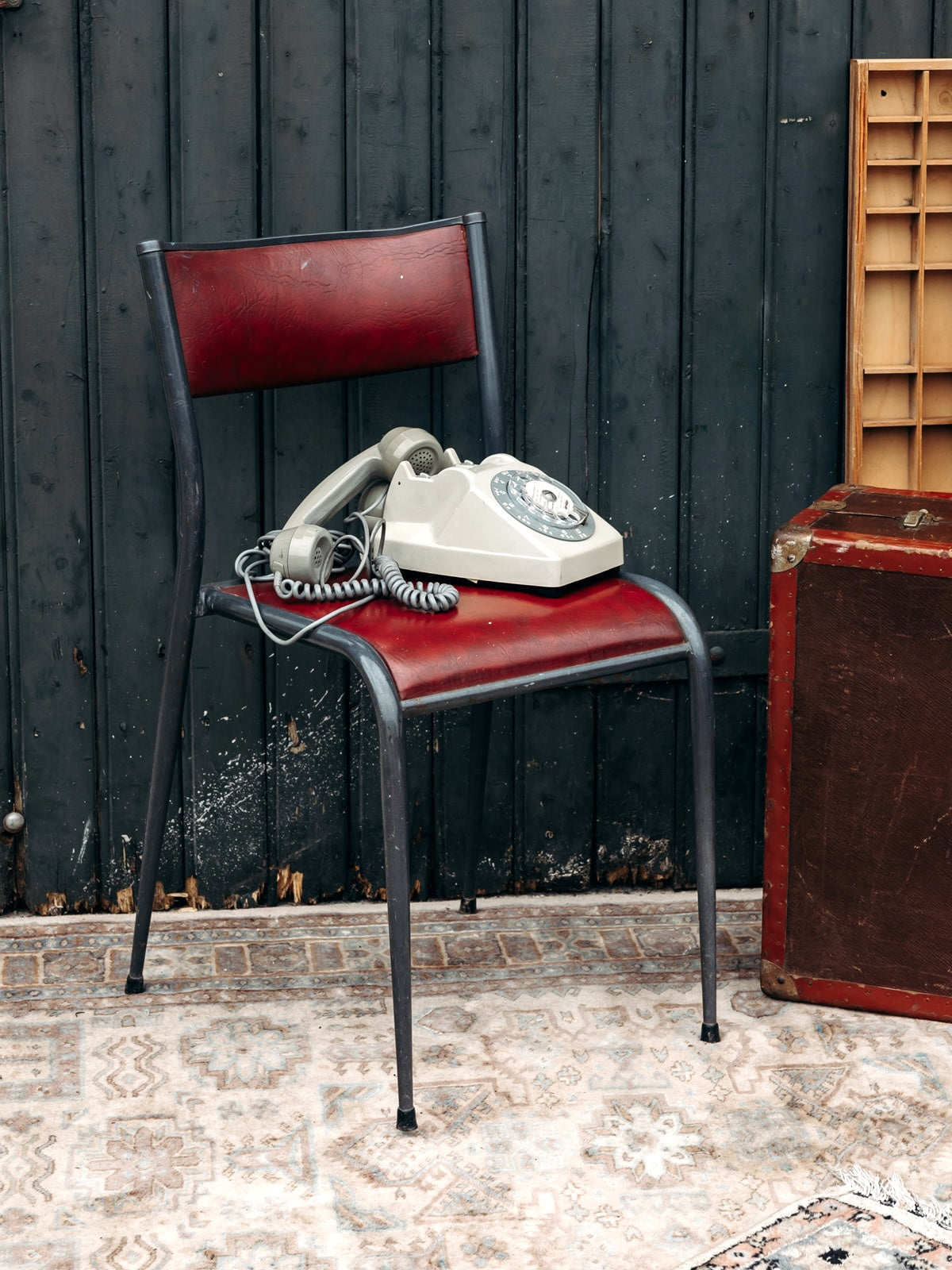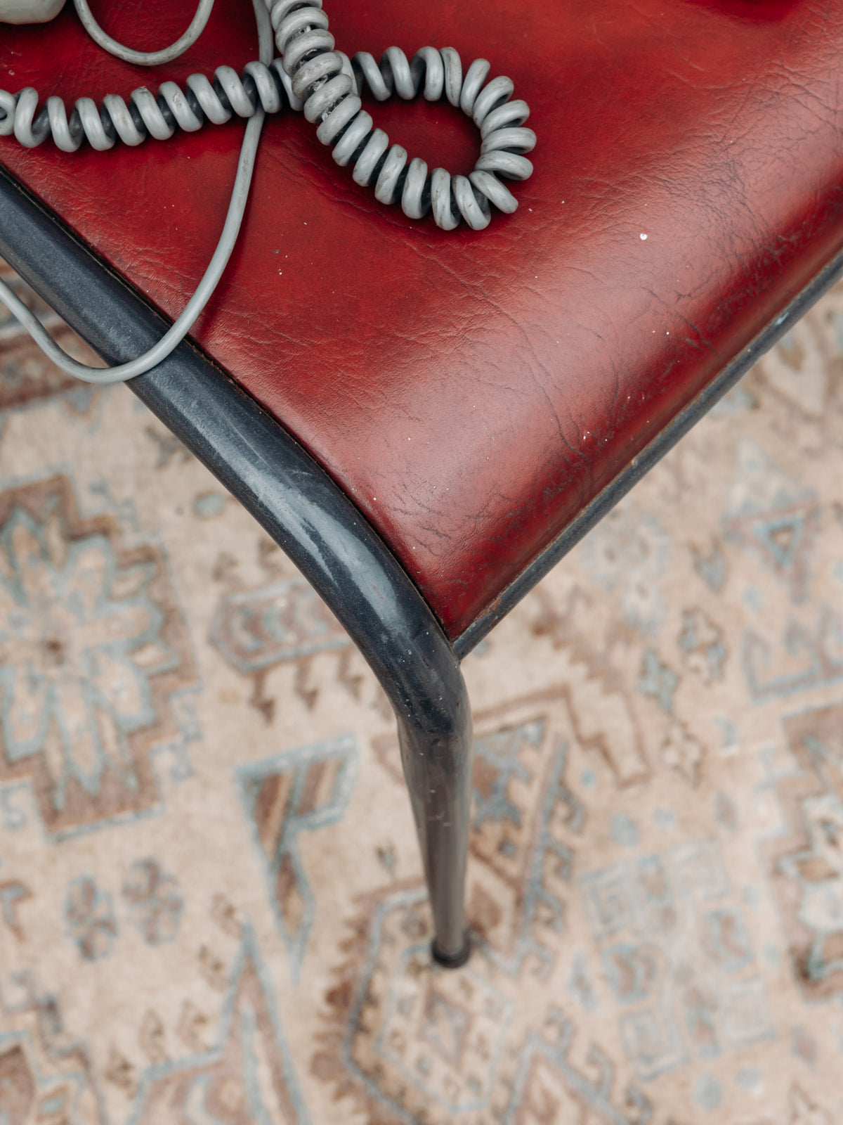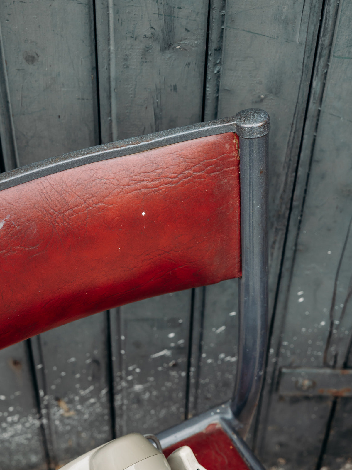Découvrez cette chaise en métal, alliant robustesse et style. Son assise et son dossier en simili cuir bordeaux apportent une touche chaleureuse et colorée à votre intérieur. Chaque marque du temps raconte une histoire unique, faisant de cette chaise une pièce pleine de caractère, à la fois confortable et esthétique.