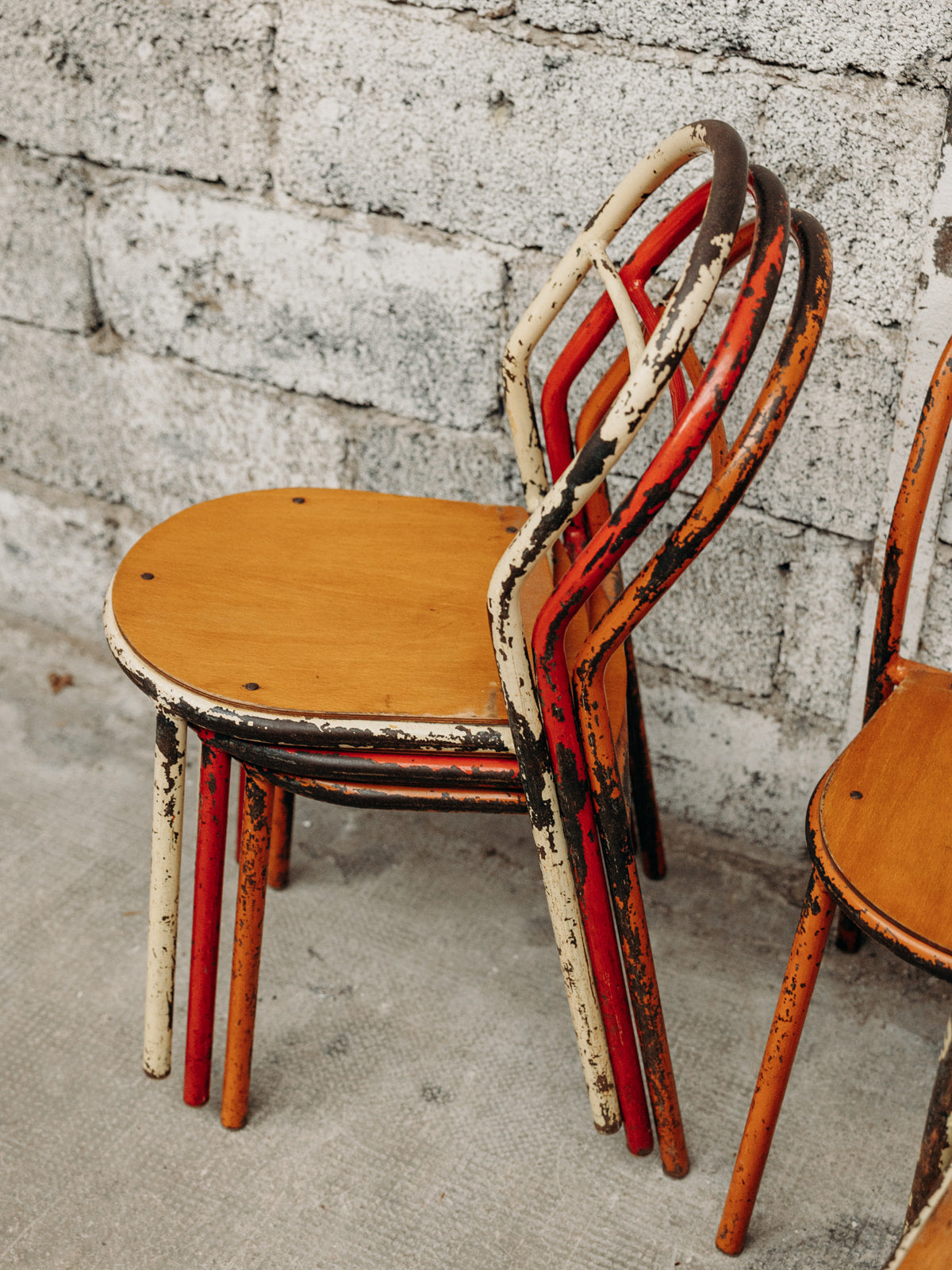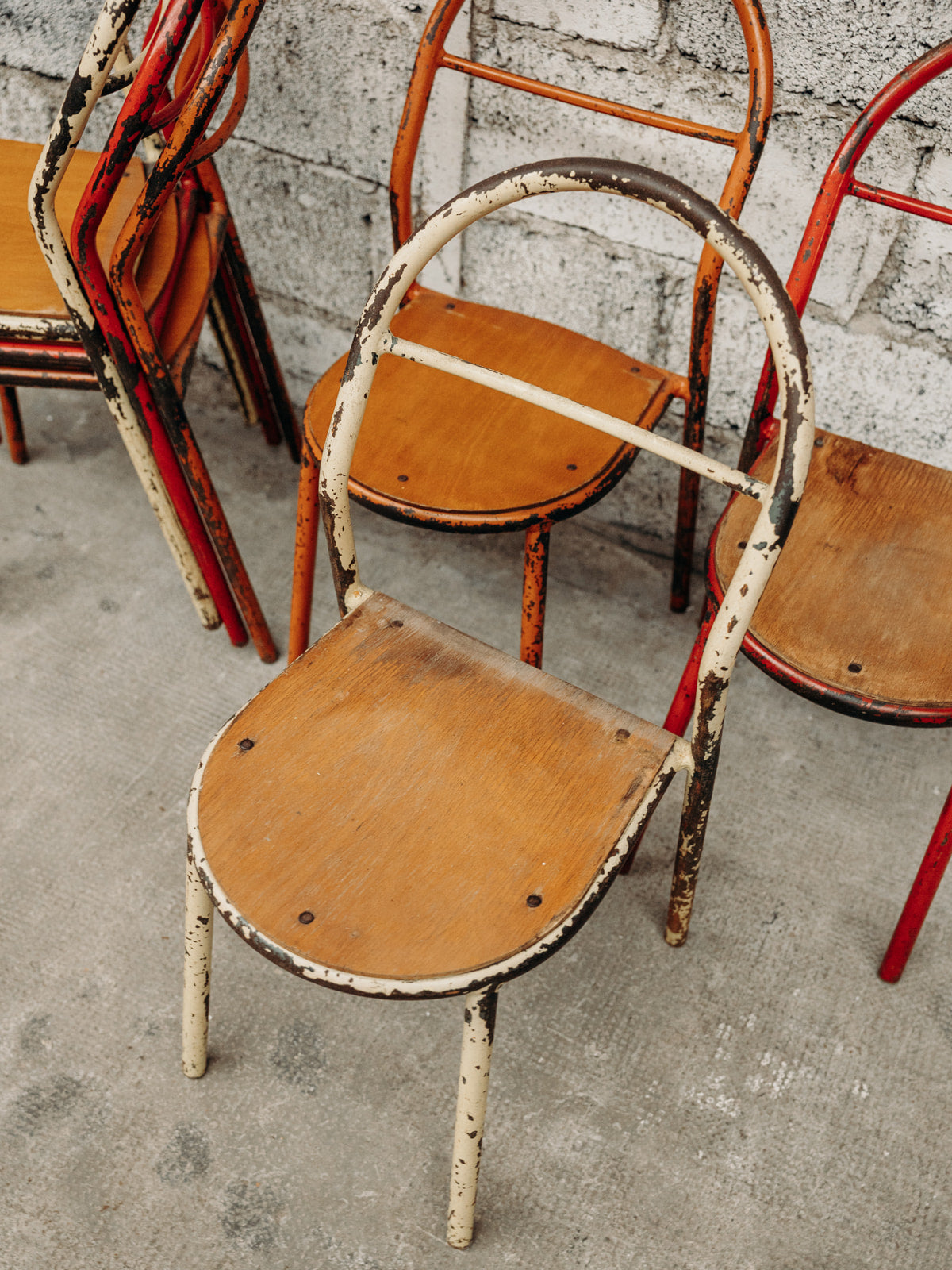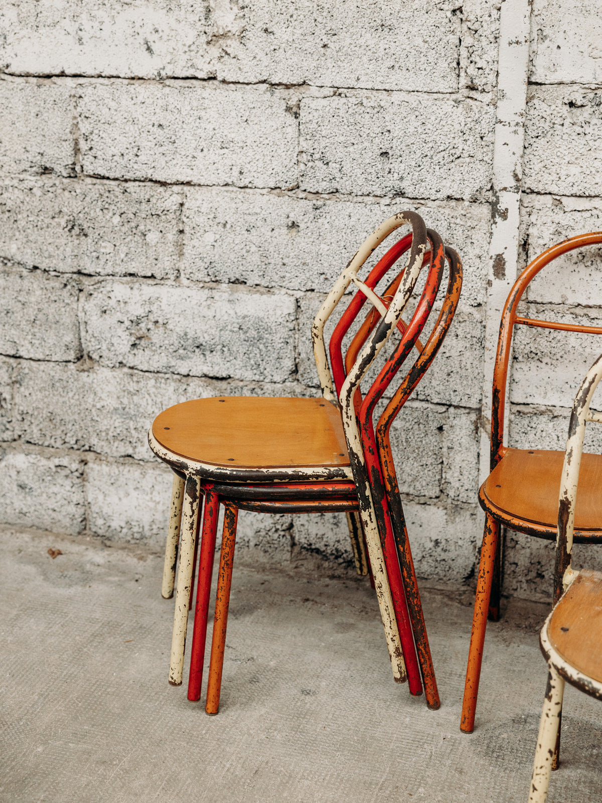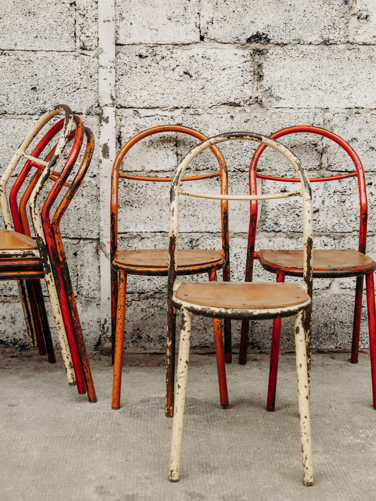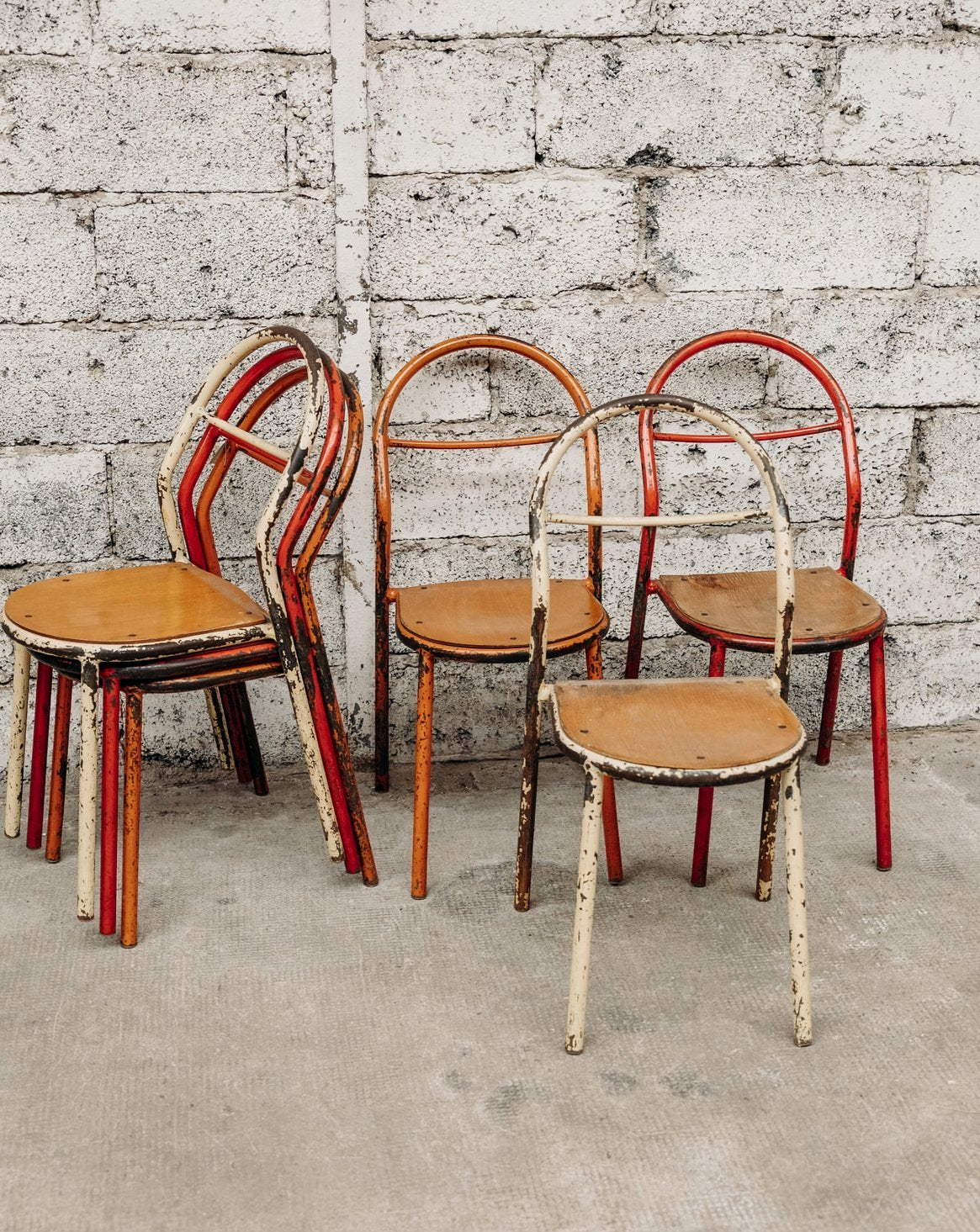 Découvrez ce lot de 6 chaises René Herbst pour Mobilor des années 1950, un parfait mélange de design vintage et d'allure industrielle. Composé de 2 chaises rouges, 2 crème et 2 orange, chaque chaise présente une belle patine d'origine, ajoutant du caractère à votre espace. Leur structure en métal et leur assise en contreplaqué offrent à la fois robustesse et confort. Ces chaises empilables sont idéales pour une décoration moderne et dynamique. Un ensemble pratique et esthétique, parfait pour un intérieur audacieux et unique.