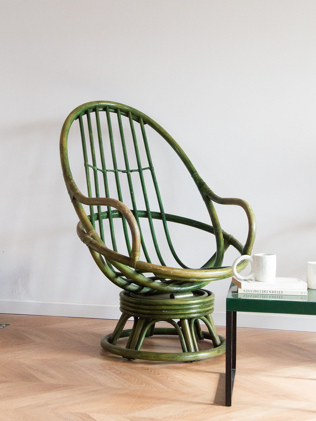 Découvrez ce fauteuil pivotant en rotin vert au charme naturel et vintage. Sa structure en bambou apporte légèreté et originalité, tandis que le rotin souligne leur authenticité. Le dossier arrondis offre confort et douceur, invitant à la détente. Le système pivotant ajoute une touche pratique et ludique au design. Une assise unique qui allie style, confort et caractère exotique. Disponible en 2 quantitées vendus à l'unité.