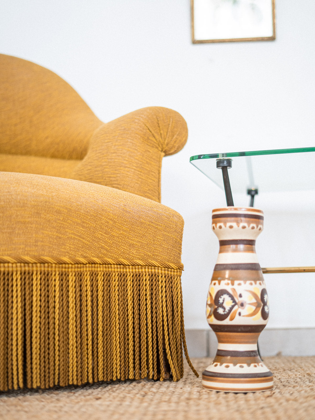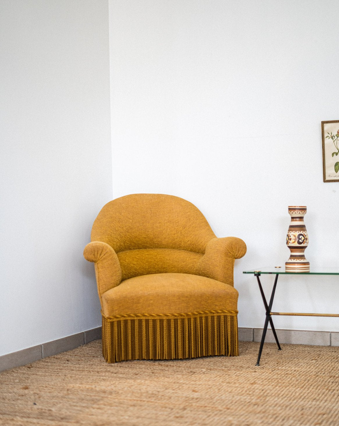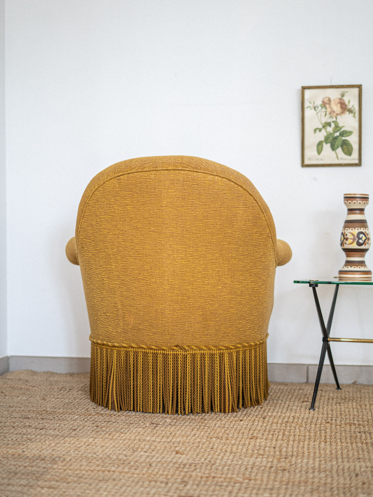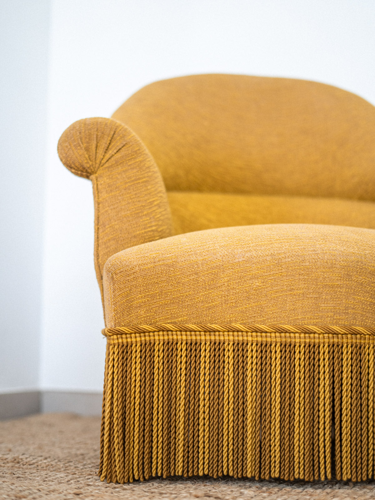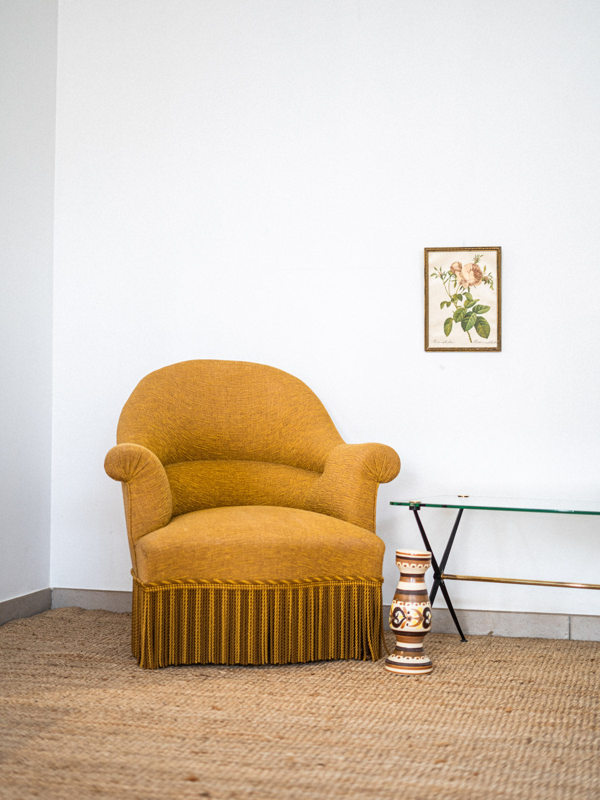 Découvrez le charme intemporel du fauteuil crapaud en tissu bouclette moutarde, une pièce unique qui apportera une touche chaleureuse à votre intérieur. Avec ses franges délicates, ce fauteuil allie confort et élégance, invitant à la détente. Parfait pour agrémenter un coin lecture ou ajouter du caractère à votre salon, il s’intègre harmonieusement dans tous les styles de décoration. Laissez-vous séduire par son allure rétro revisité et sa texture douce au toucher.