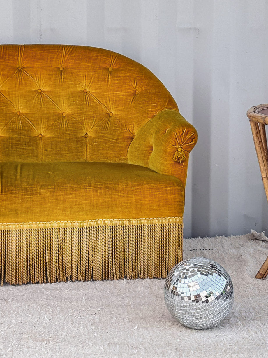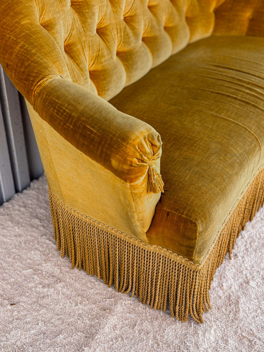 Découvrez cette élégante banquette vintage des années 1930, habillée d'un doux velours ras jaune. Son design intemporel est subtilement rehaussé par des pompons délicats de chaque côté et des franges raffinées en contour, ajoutant une touche de charme à votre intérieur. Idéale pour créer un coin cocooning ou en tant qu'élément phare dans un salon, cette banquette allie confort et esthétique avec brio. Offrez à votre espace une note rétro unique et chaleureuse.