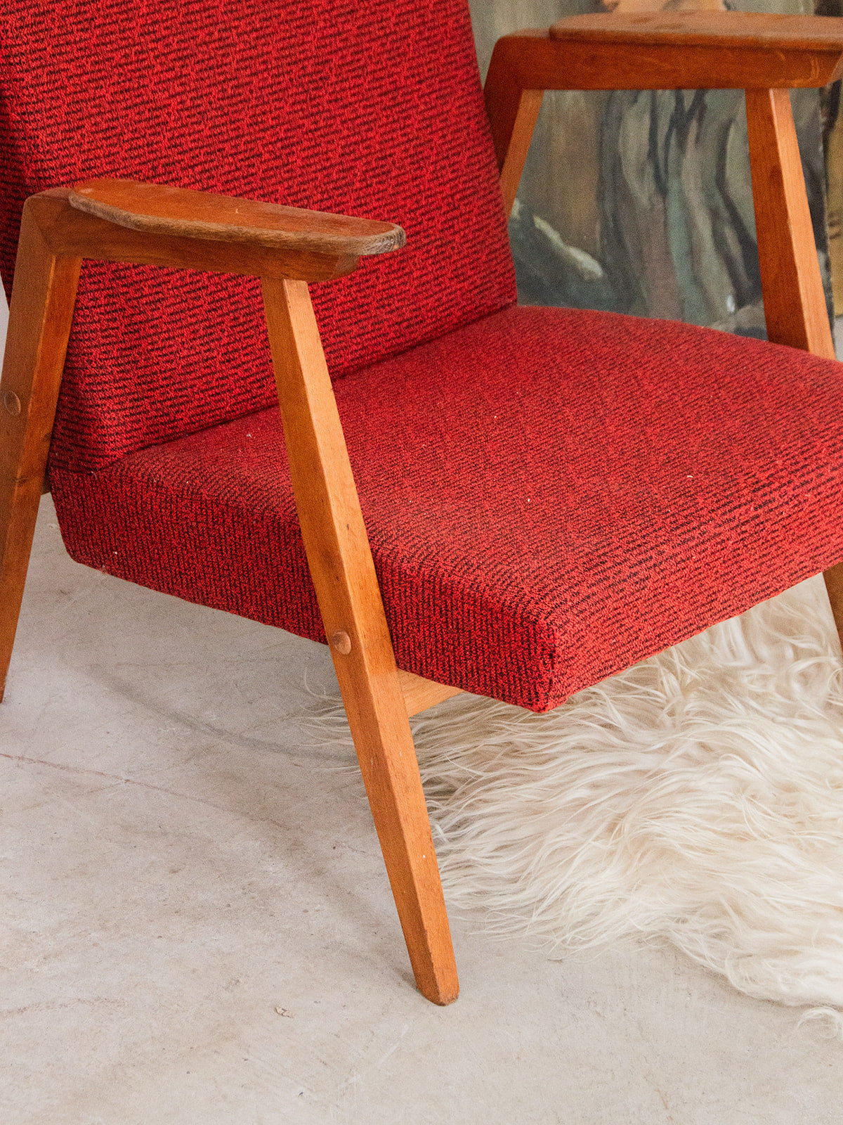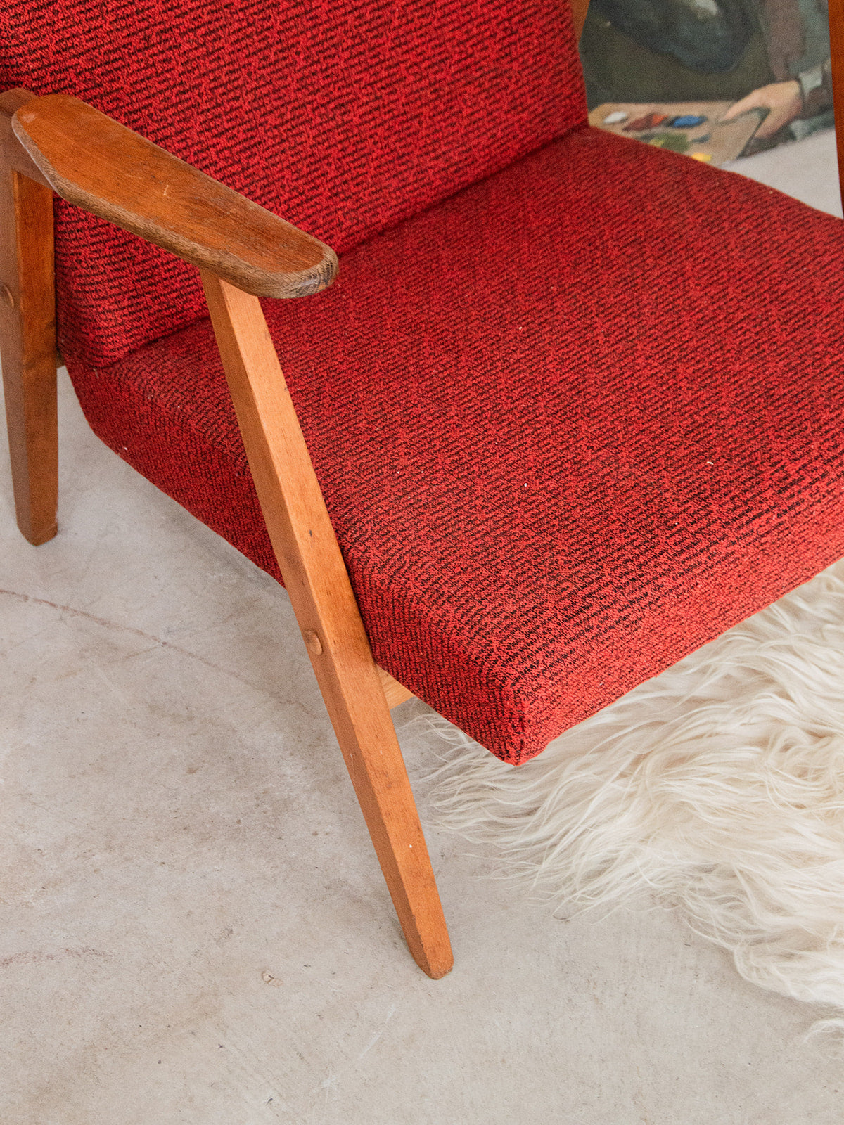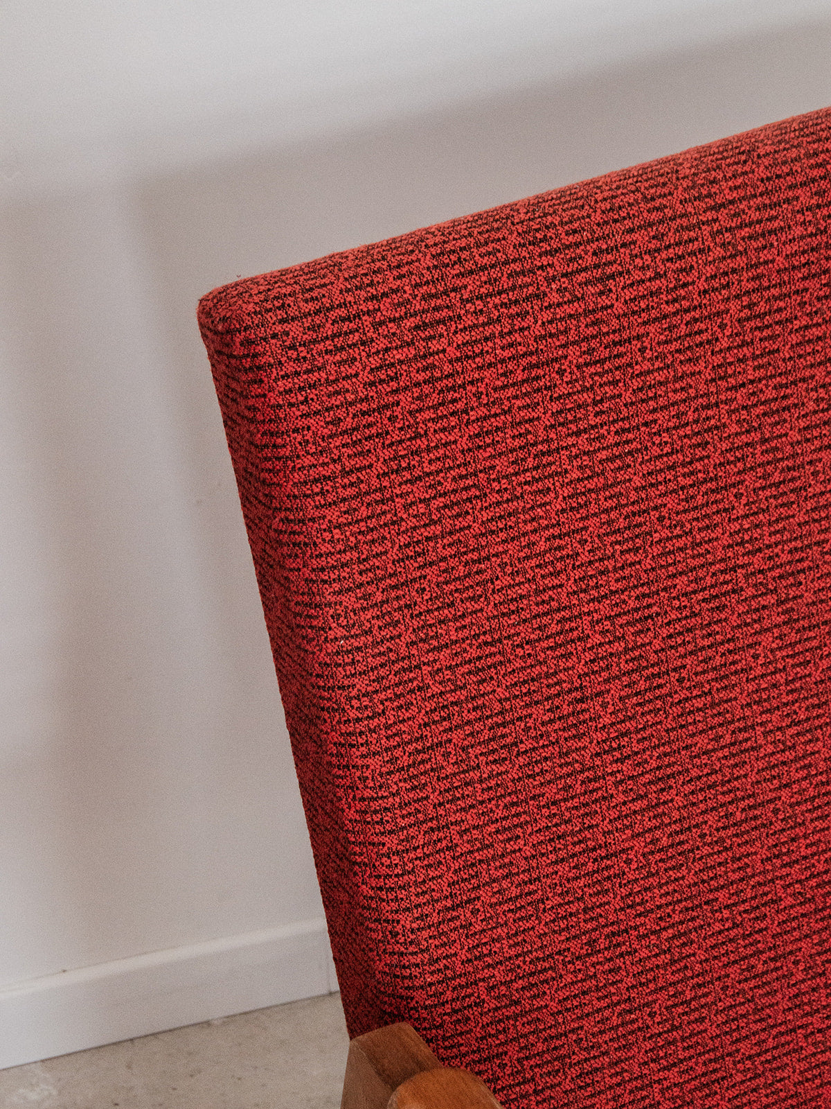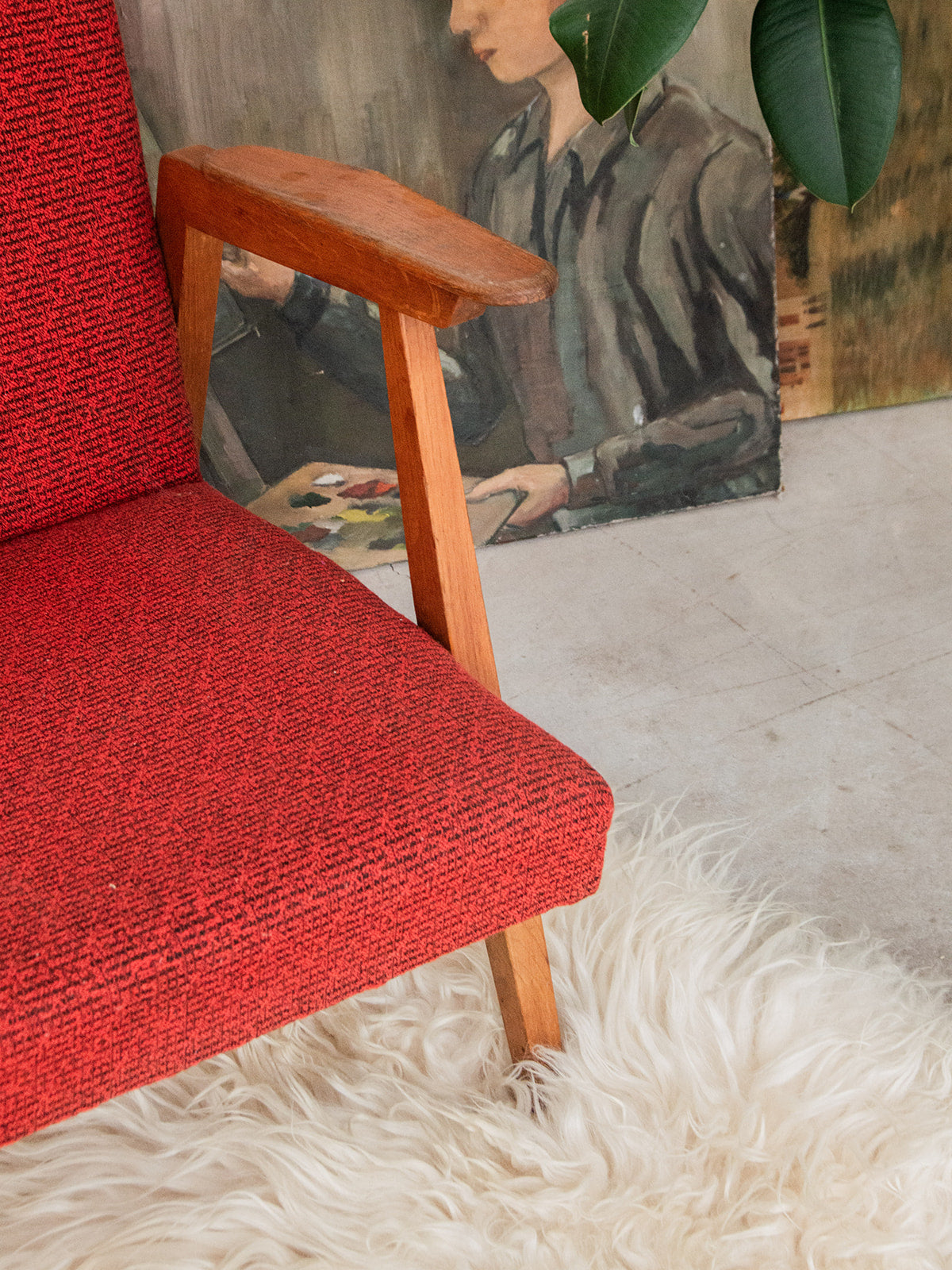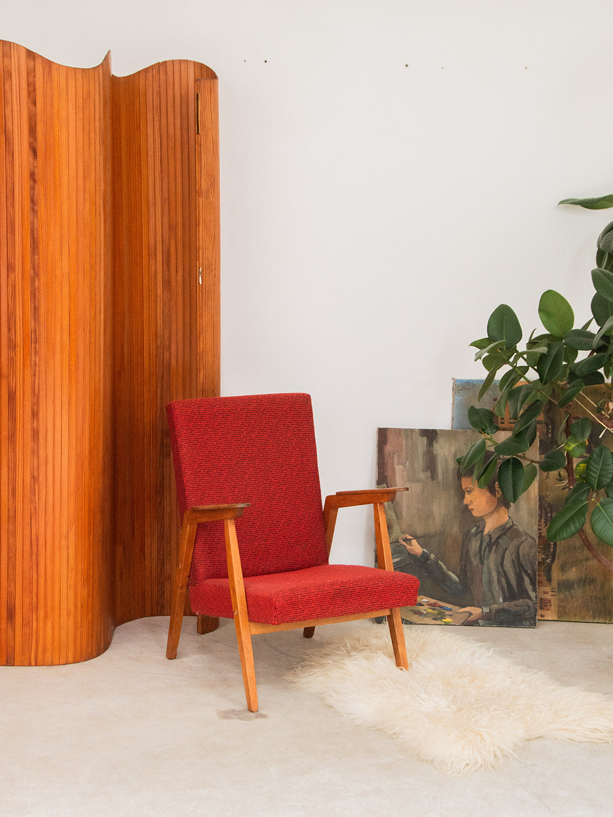 Découvrez le fauteuil rouge au haut dossier, conçu pour allier confort et élégance. Son assise en tissu rouge lumineux est parfaite pour apporter une touche de couleur à votre intérieur. Réalisée avec une solide structure en bois clair, ce fauteuil offre une stabilité optimale, tandis que ses accotoirs orientés vers le haut garantissent un soutien agréable. Vendu à l'unité, ce meuble se décline en deux quantités, idéal pour compléter votre décoration avec style.