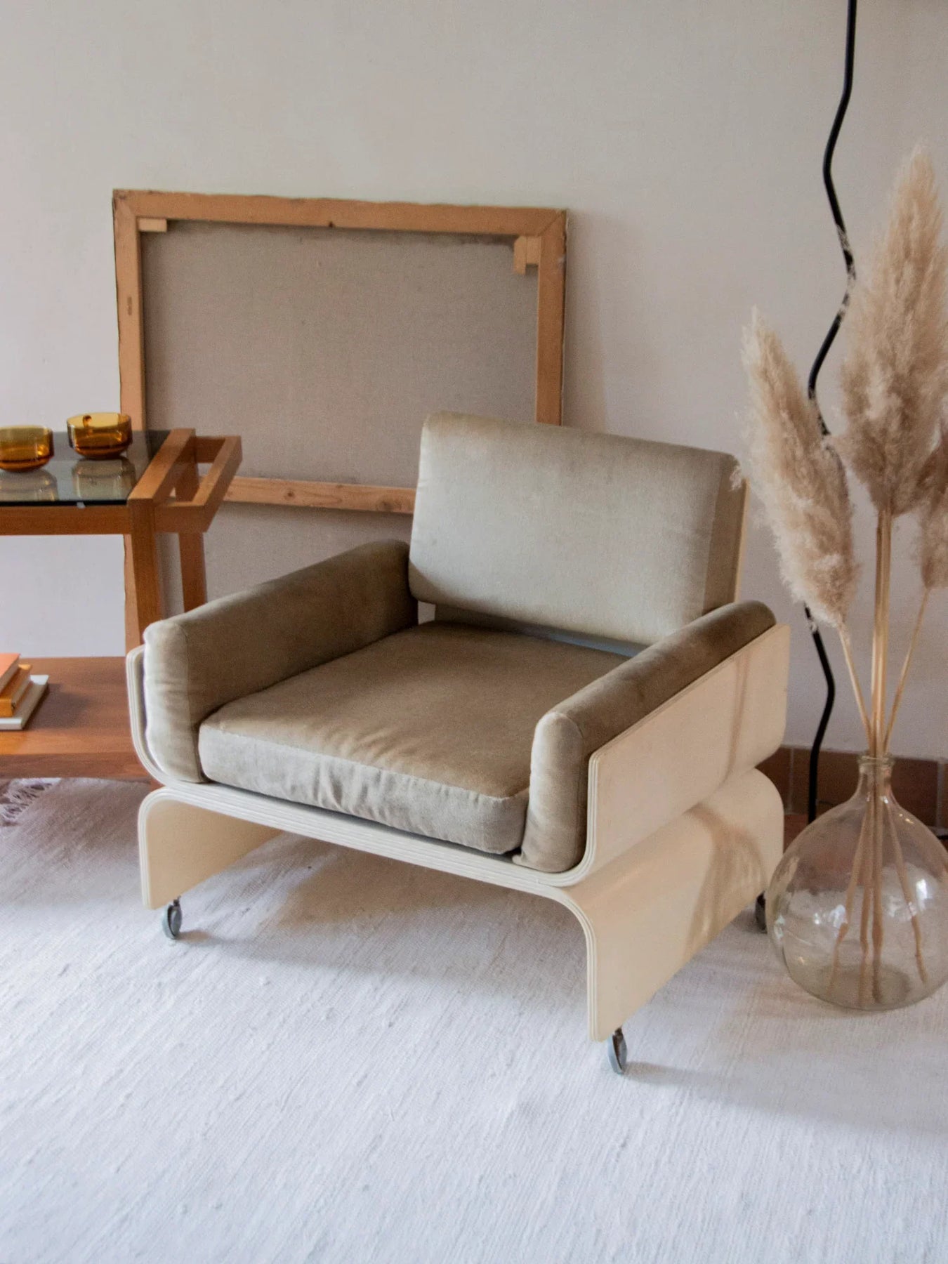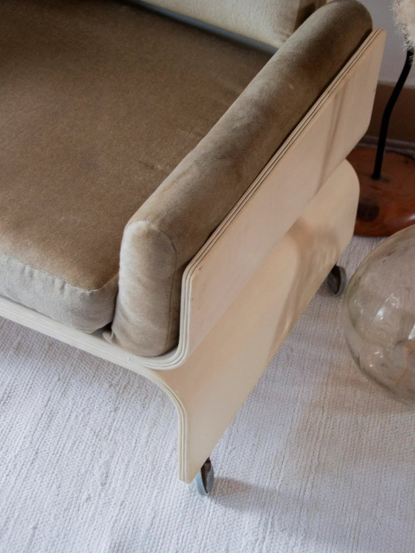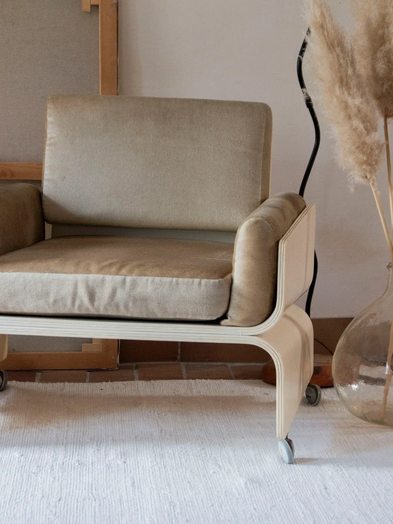 Découvrez cette magnifique chauffeuse / fauteuil de style space age des années 70, alliant une structure en bois courbé laqué blanc à trois coussins en velours beige d'origine. Inspiré des créations emblématiques de Mario Bellini, son design audacieux et élégant fait de cette pièce un incontournable du mobilier contemporain. Avec ses petites roues parfaitement fonctionnelles et son confort exceptionnel, cette assise se révèle à la fois pratique et esthétique. En très bon état général, ce fauteuil ne présente aucun trou sur le tissu et apportera une touche d'originalité à votre intérieur.