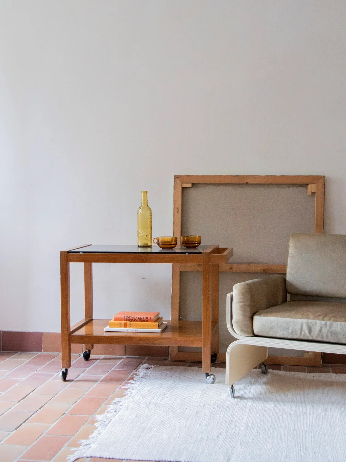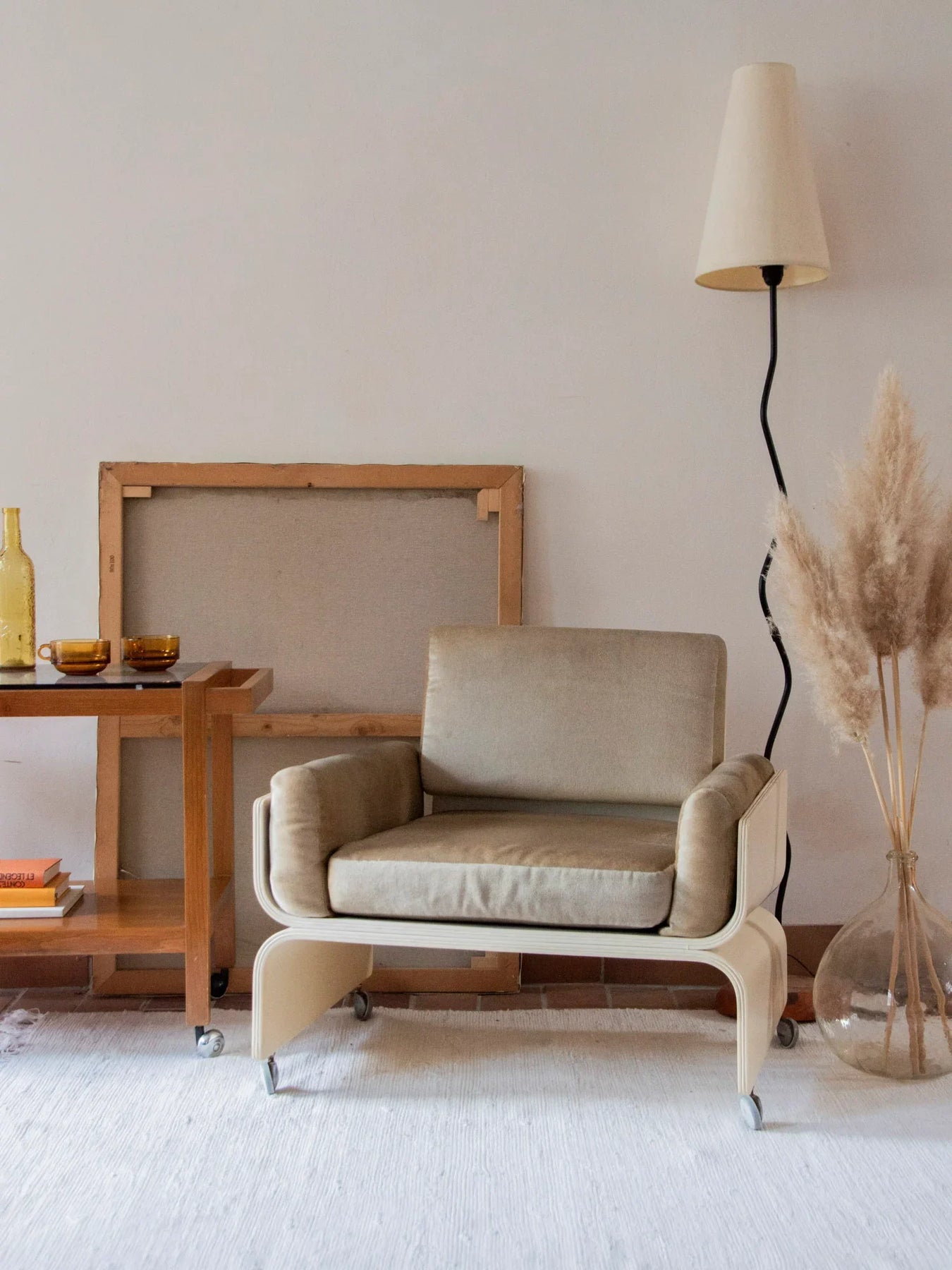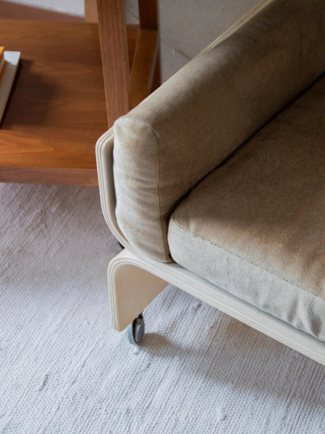 Découvrez cette magnifique chauffeuse / fauteuil de style space age des années 70, alliant une structure en bois courbé laqué blanc à trois coussins en velours beige d'origine. Inspiré des créations emblématiques de Mario Bellini, son design audacieux et élégant fait de cette pièce un incontournable du mobilier contemporain. Avec ses petites roues parfaitement fonctionnelles et son confort exceptionnel, cette assise se révèle à la fois pratique et esthétique. En très bon état général, ce fauteuil ne présente aucun trou sur le tissu et apportera une touche d'originalité à votre intérieur.