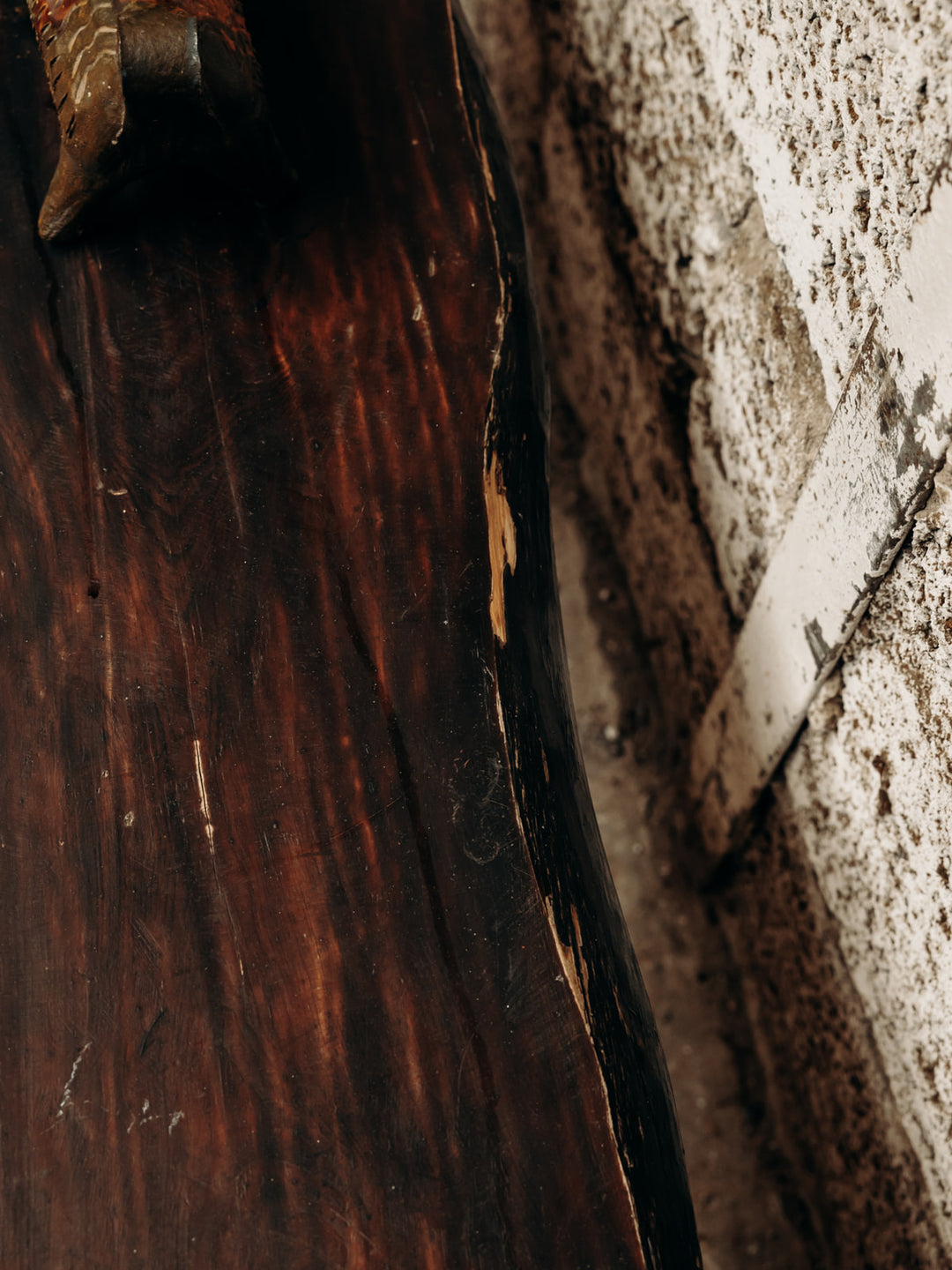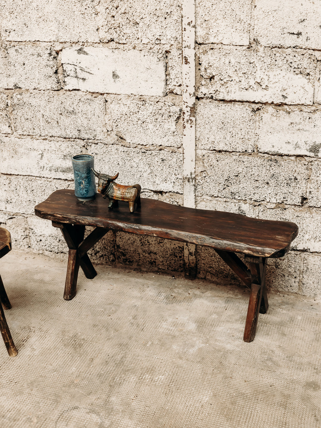 Apportez une touche d'originalité à votre intérieur avec ce banc brutaliste en bois foncé. Sa structure robuste arbore une assise taillée avec soin, offrant à la fois confort et style. Les pieds croisés apportent des lignes dynamiques, tandis que les barres de soutien ajoutent une solidité indéniable à ce meuble unique. Idéal pour un hall d'entrée ou une salle à manger, ce banc allie esthétique et fonctionnalité avec brio.