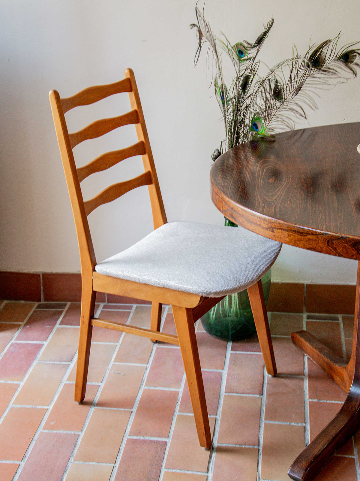 Apportez une touche douce et naturelle à votre intérieur avec ce lot de 4 chaises en bois clair et tissu gris clair. Leur dossier à 4 barres ondulées offre une ligne originale, tandis que l’assise incurvée assure un bon confort. Ces chaises s’intègrent facilement dans une salle à manger au style épuré ou contemporain. On aime leur teinte harmonieuse et leur design léger. En bon état général, prêtes à être utilisées au quotidien!