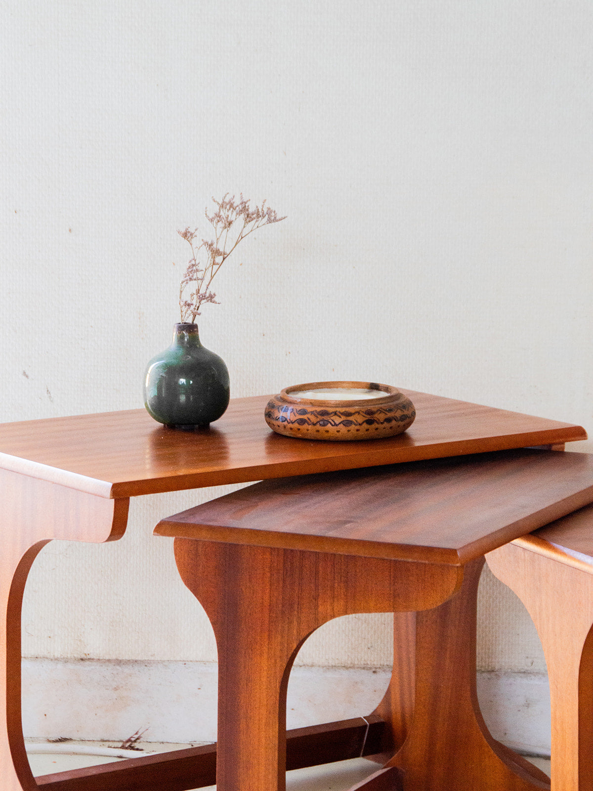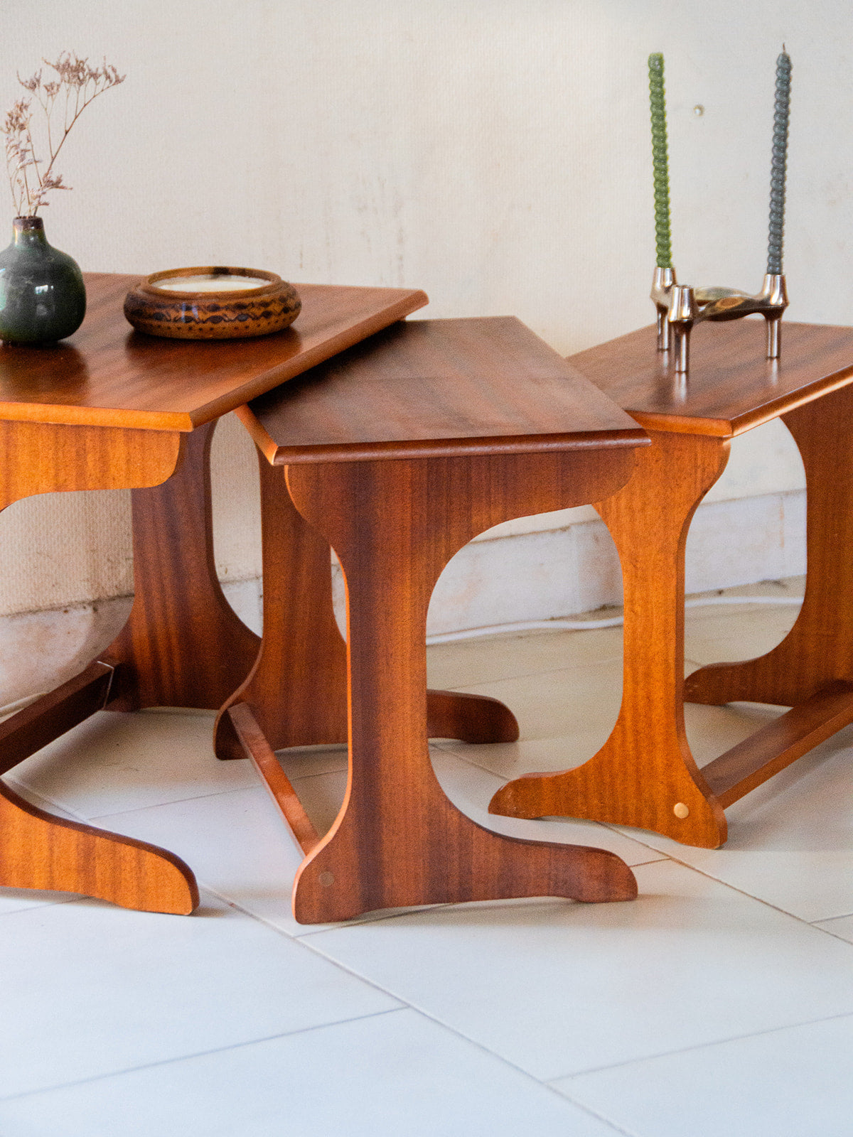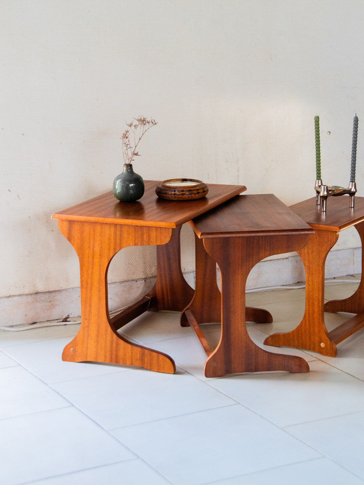 Ajoutez une touche d'élégance à votre intérieur avec ces charmantes petites tables gigognes en bois au style scandinave, mid century modern. Leur design judicieux permet un assemblage facile, offrant ainsi une solution de rangement pratique tout en occupent peu d'espace. Chaque table est en état parfait et est soutenue par une solide barre en bois au niveau des pieds, garantissant stabilité et durabilité. Parfaites pour servir de tables d'appoint ou de décoration, elles s'adaptent à toutes vos envies.