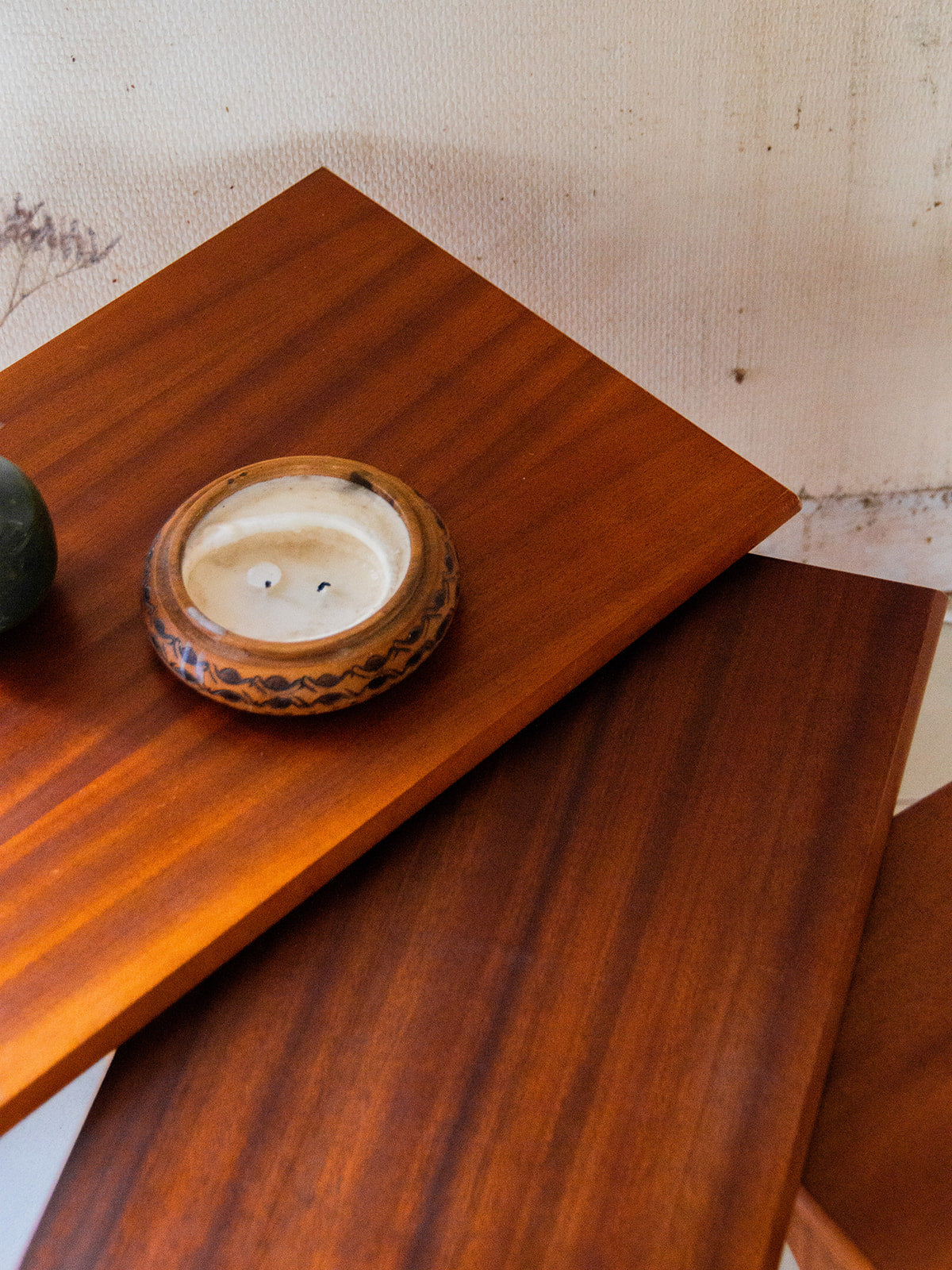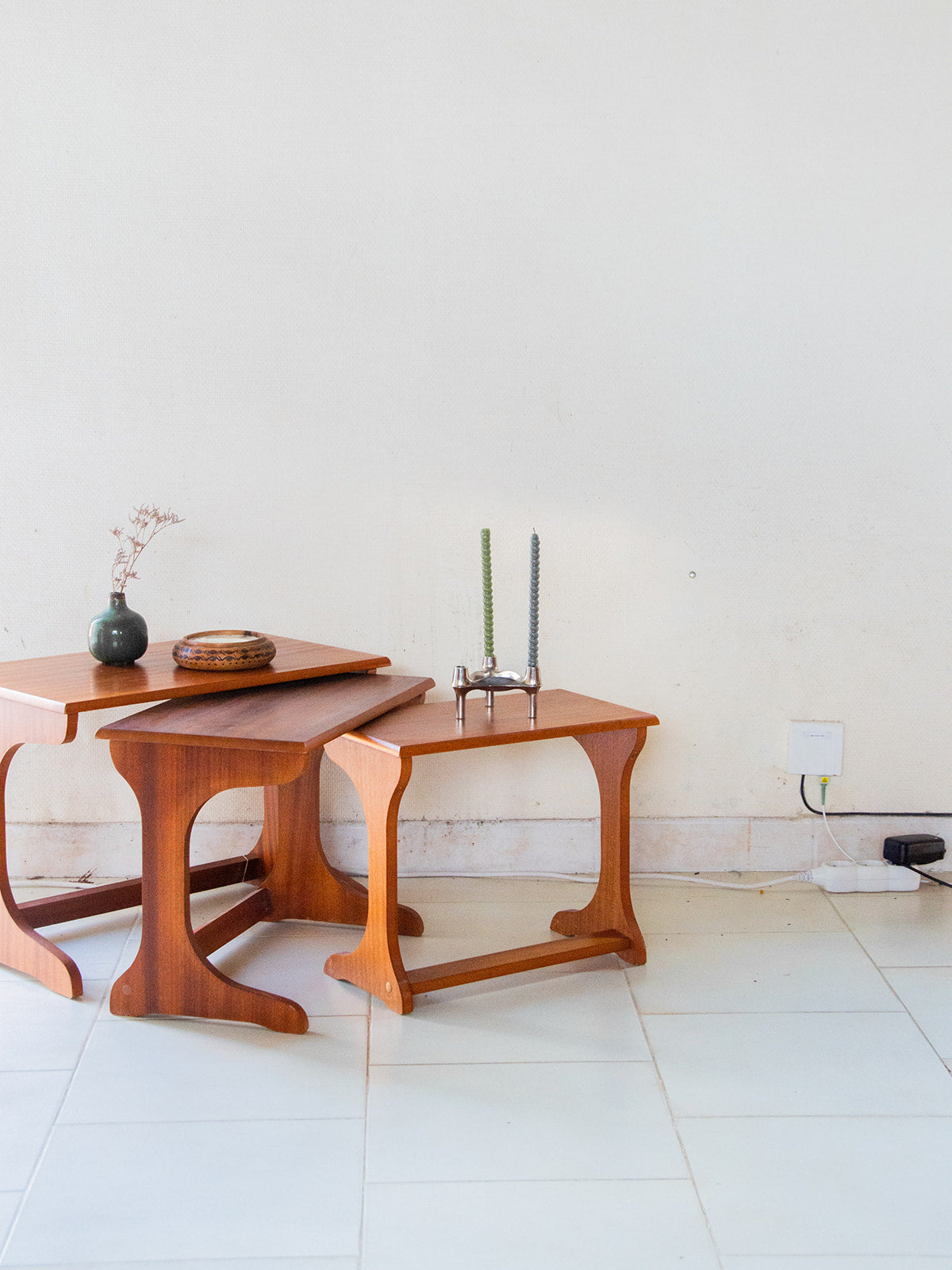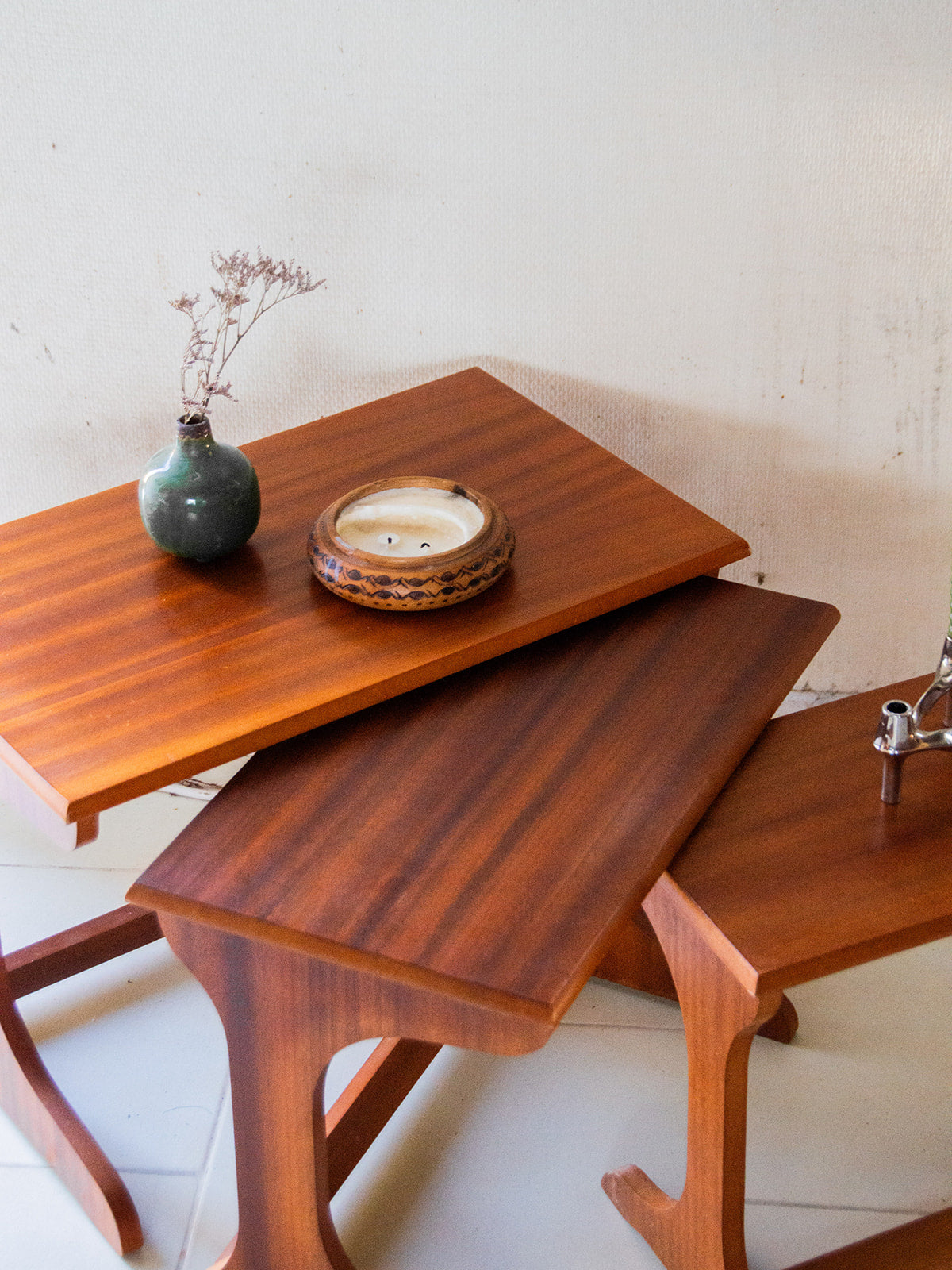 Ajoutez une touche d'élégance à votre intérieur avec ces charmantes petites tables gigognes en bois au style scandinave, mid century modern. Leur design judicieux permet un assemblage facile, offrant ainsi une solution de rangement pratique tout en occupent peu d'espace. Chaque table est en état parfait et est soutenue par une solide barre en bois au niveau des pieds, garantissant stabilité et durabilité. Parfaites pour servir de tables d'appoint ou de décoration, elles s'adaptent à toutes vos envies.