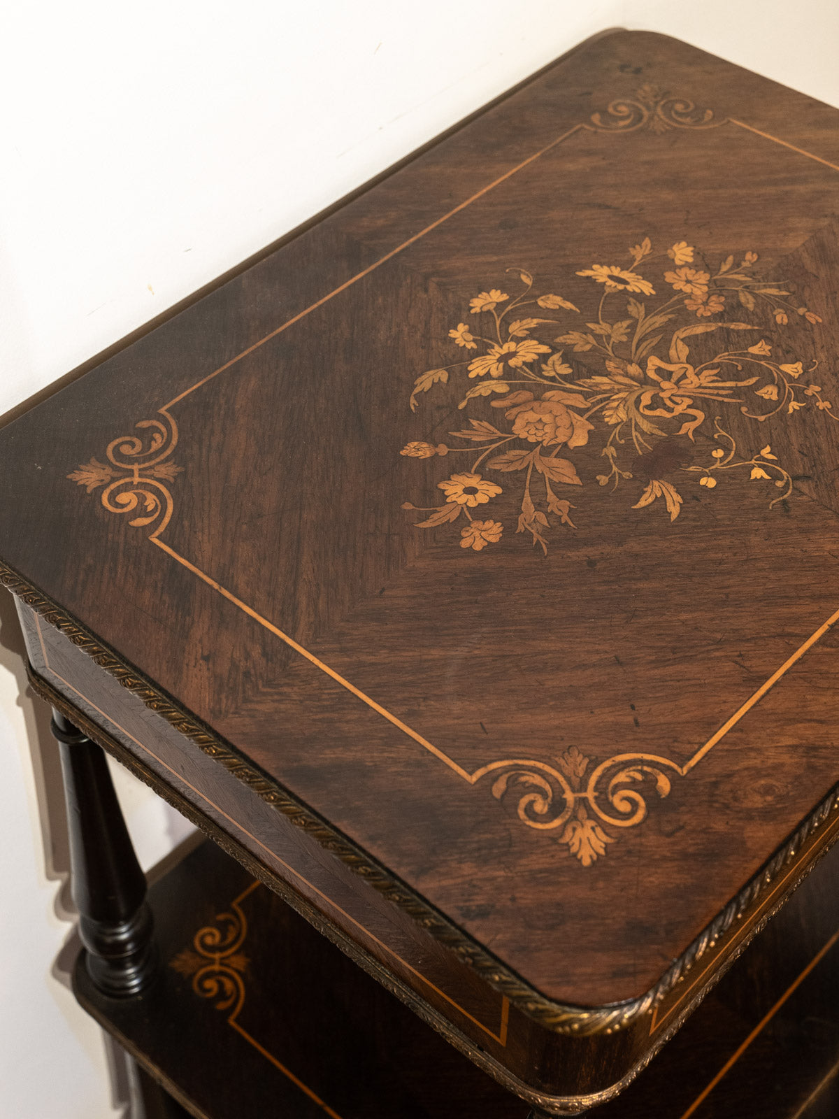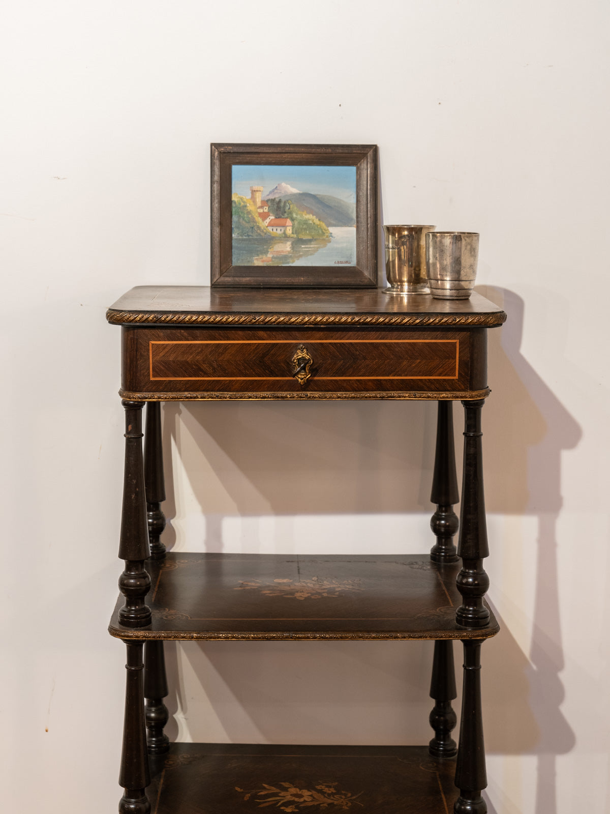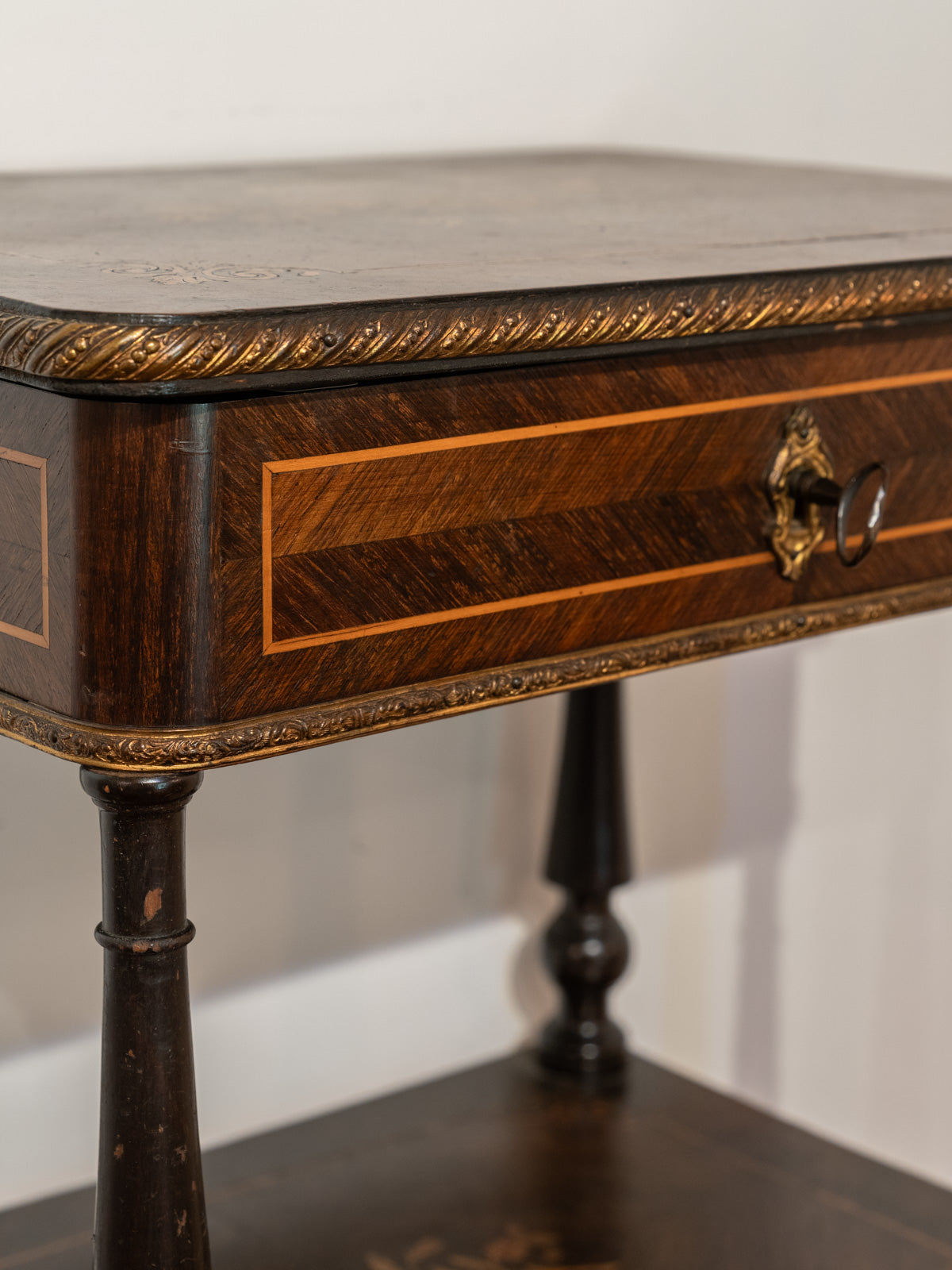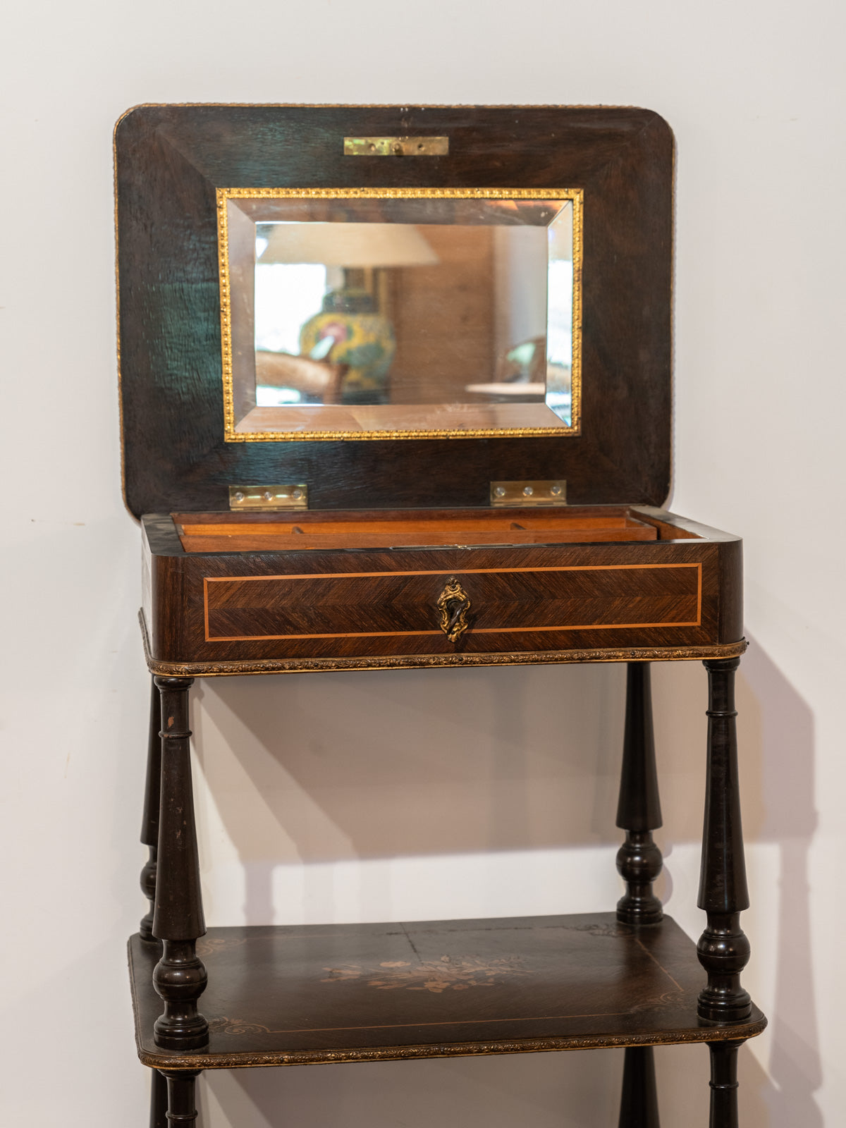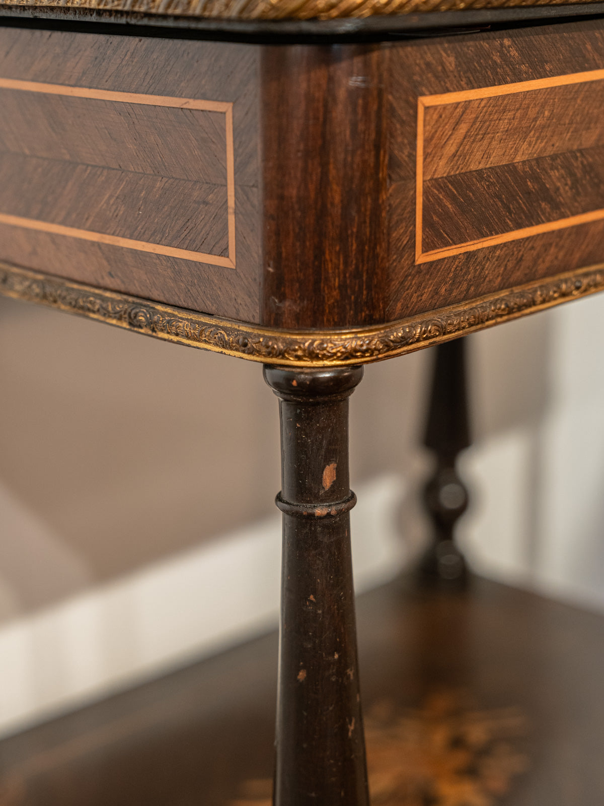 Découvrez notre magnifique travailleuse Napoléon III, un véritable bijou d'ébénisterie. Avec son dessus en marqueterie délicate et son élégant décor en bronze, elle allie esthétique et fonctionnalité. Le plateau, astucieusement conçu, se lève pour révéler un miroir intérieur, parfait pour les retouches quotidiennes. Son intérieur compartimenté est idéal pour organiser vos accessoires avec style. Un incontournable pour les amateurs de mobilier raffiné.