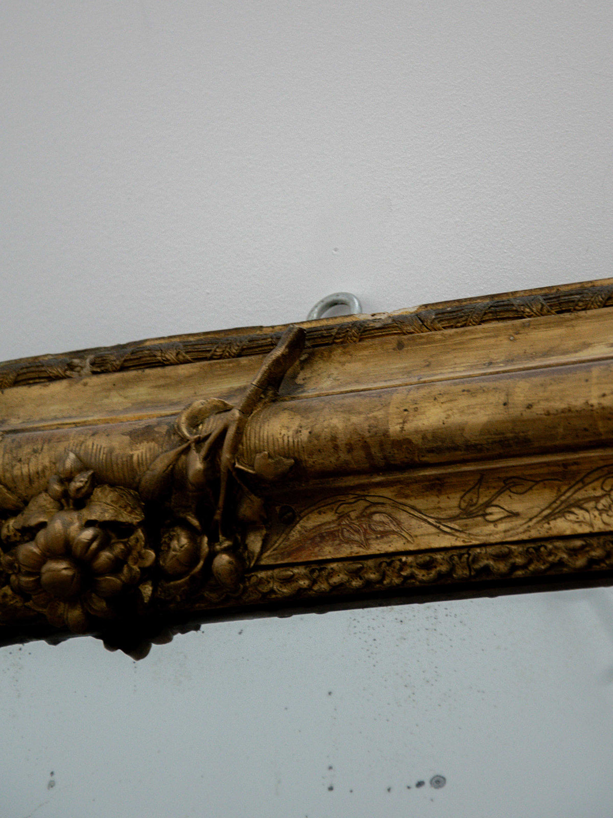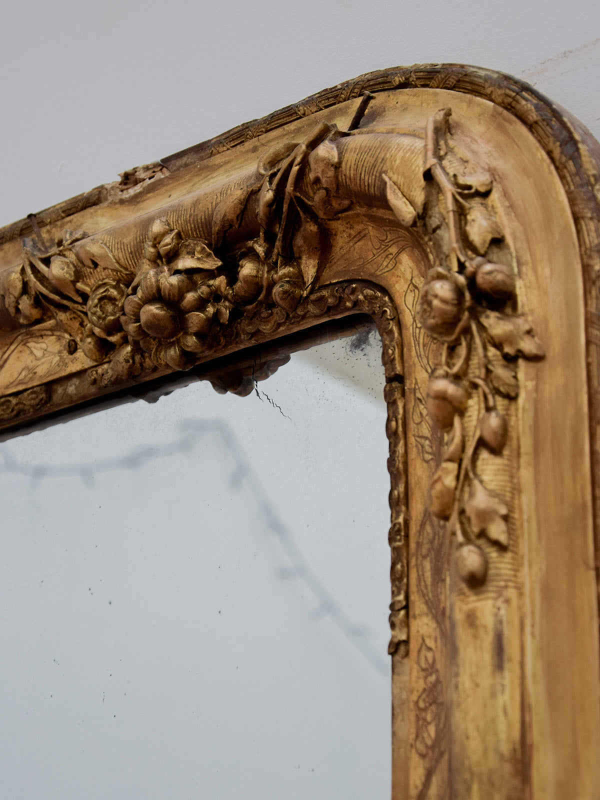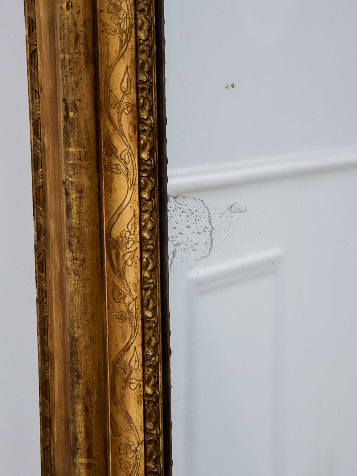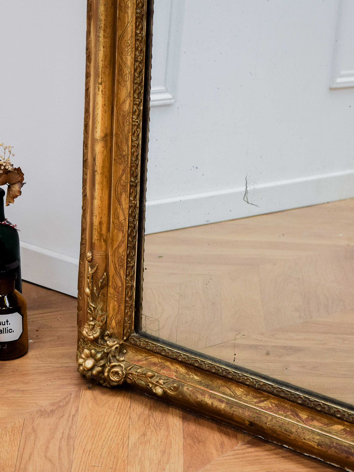 Découvrez cette pièce d’exception : un très grand miroir ancien Louis Philippe recouvert de feuille d’or. Après que la peinture aie été enlevée, l’éclat authentique de la dorure d’origine a été revelé. Sa glace au mercure, conservée d’époque, remonte au début du 19ème siècle, avant 1850. Le parquet au dos ajoute à son charme historique unique. Un miroir rare qui sublimera votre intérieur avec élégance et prestige.