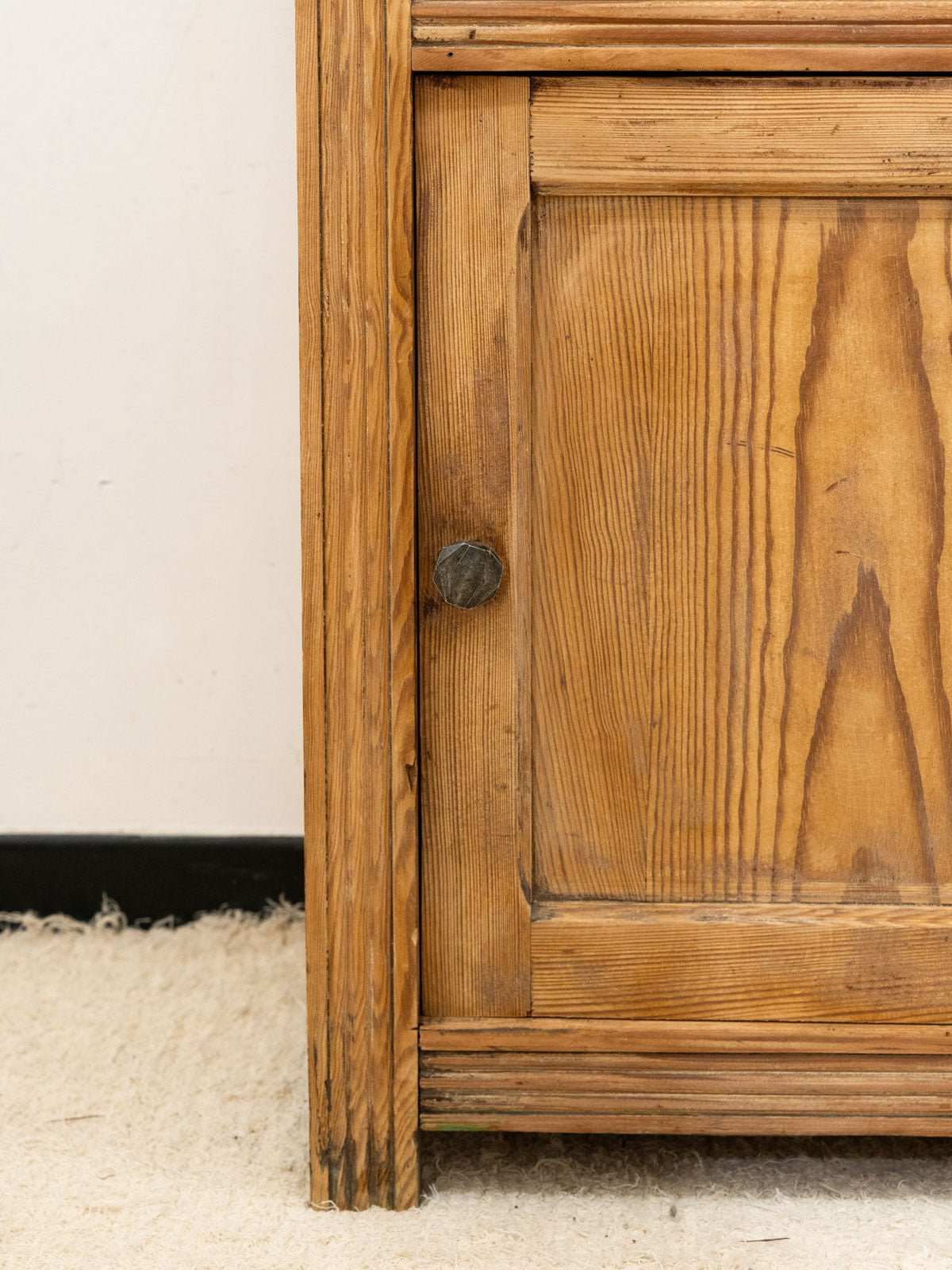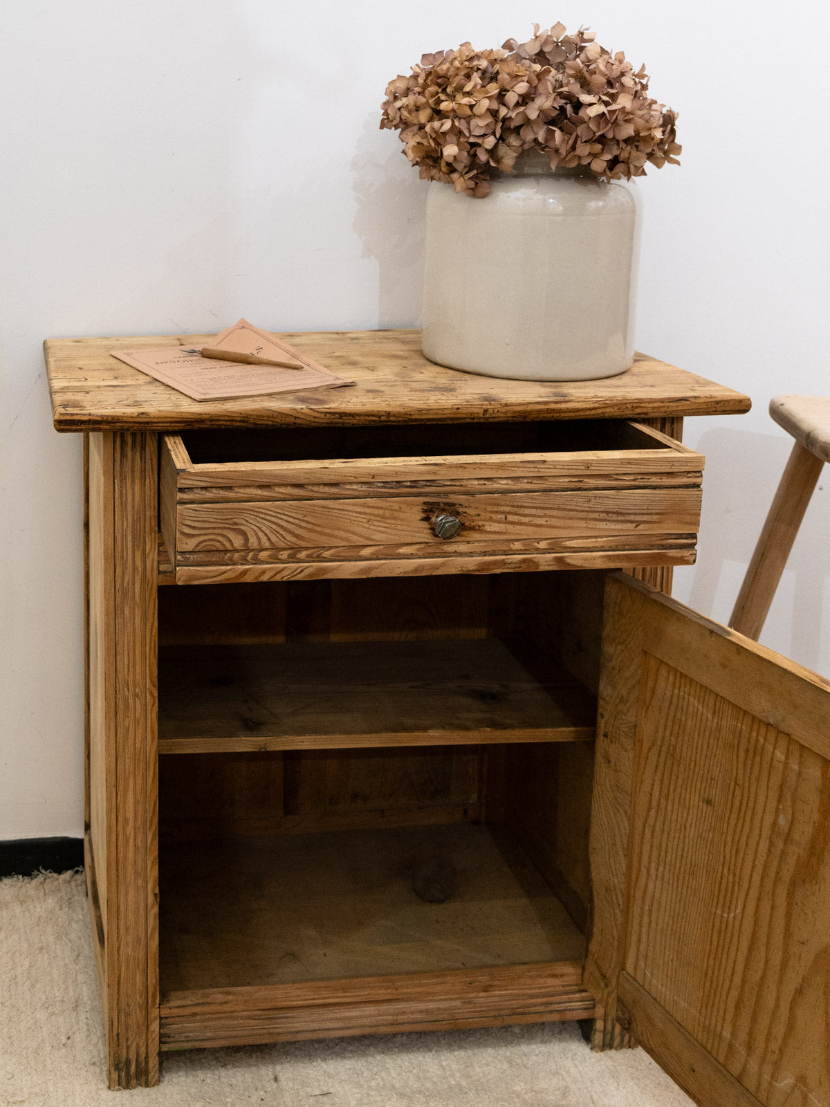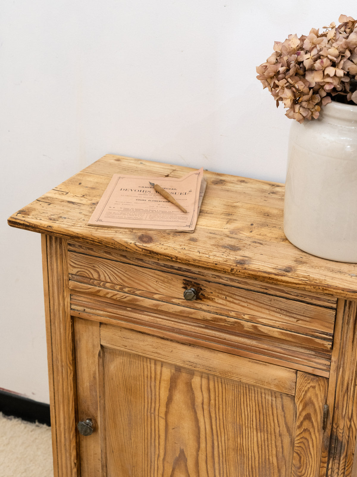 Découvrez ce confiturier en pin brut des années 1930, un véritable témoignage du charme d'antan. Doté d'une porte et d'un tiroir, il allie praticité et esthétisme avec sa poignée vintage qui ajoute une touche d'authenticité. Sa finition naturelle met en valeur la beauté du bois tout en s'intégrant harmonieusement dans tous les intérieurs. Parfait pour conserver vos confitures et autres petites denrées, ce meuble apporte une note chaleureuse à votre cuisine.