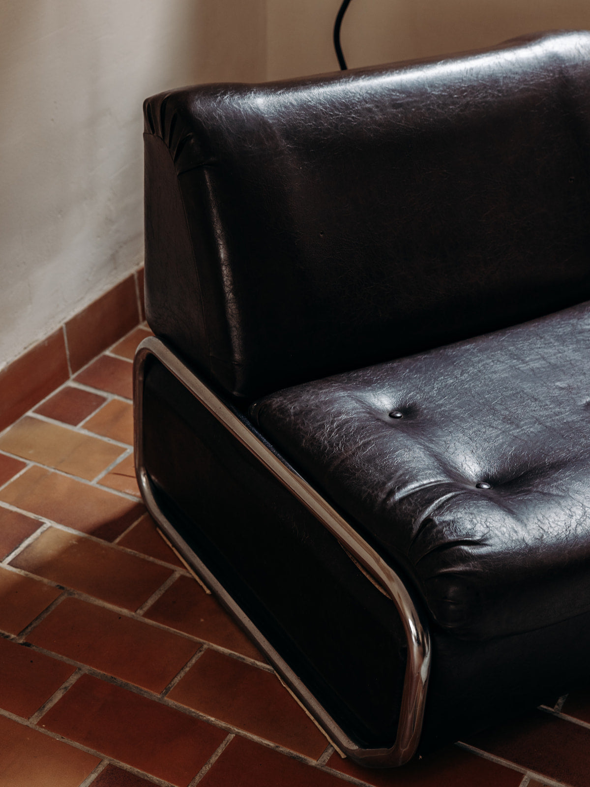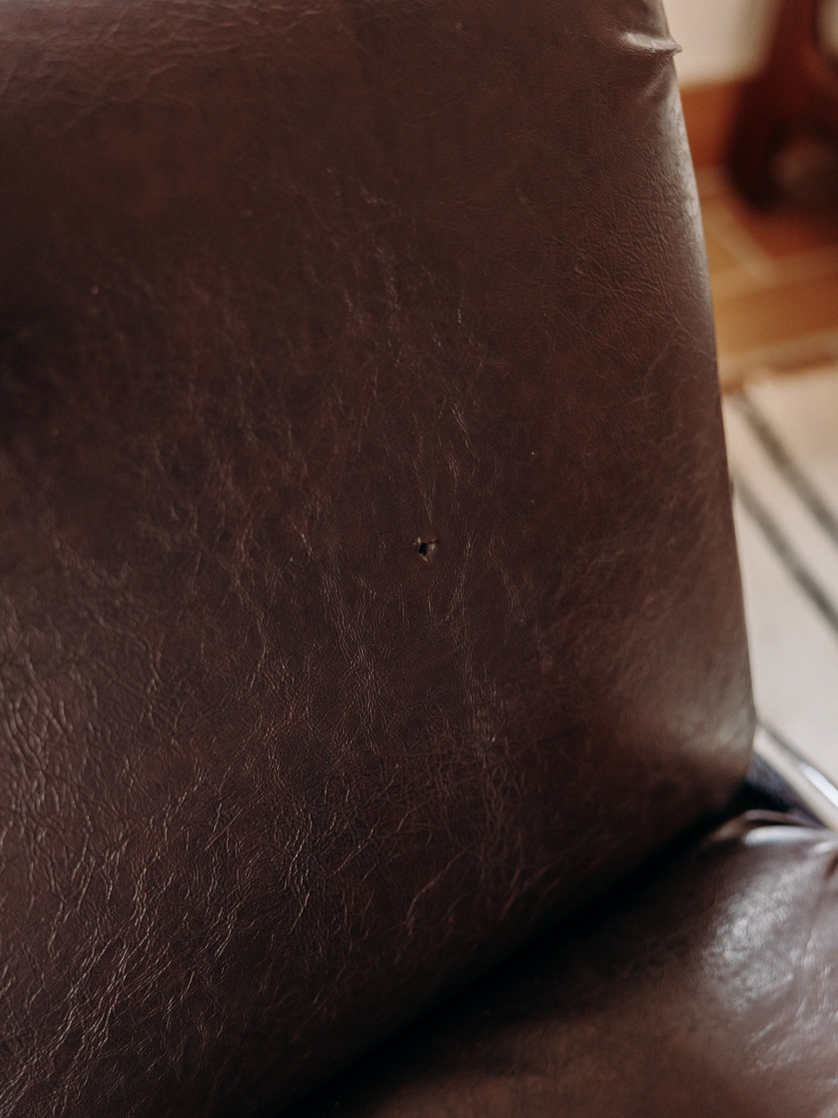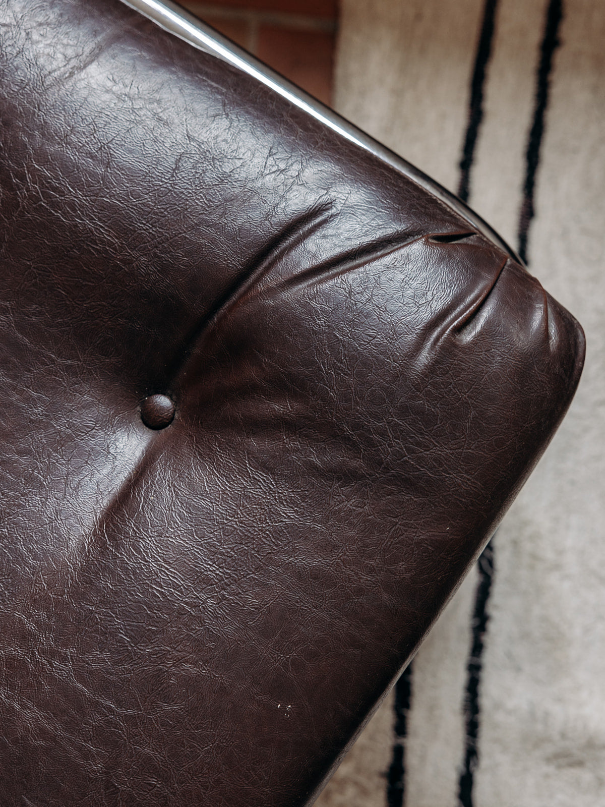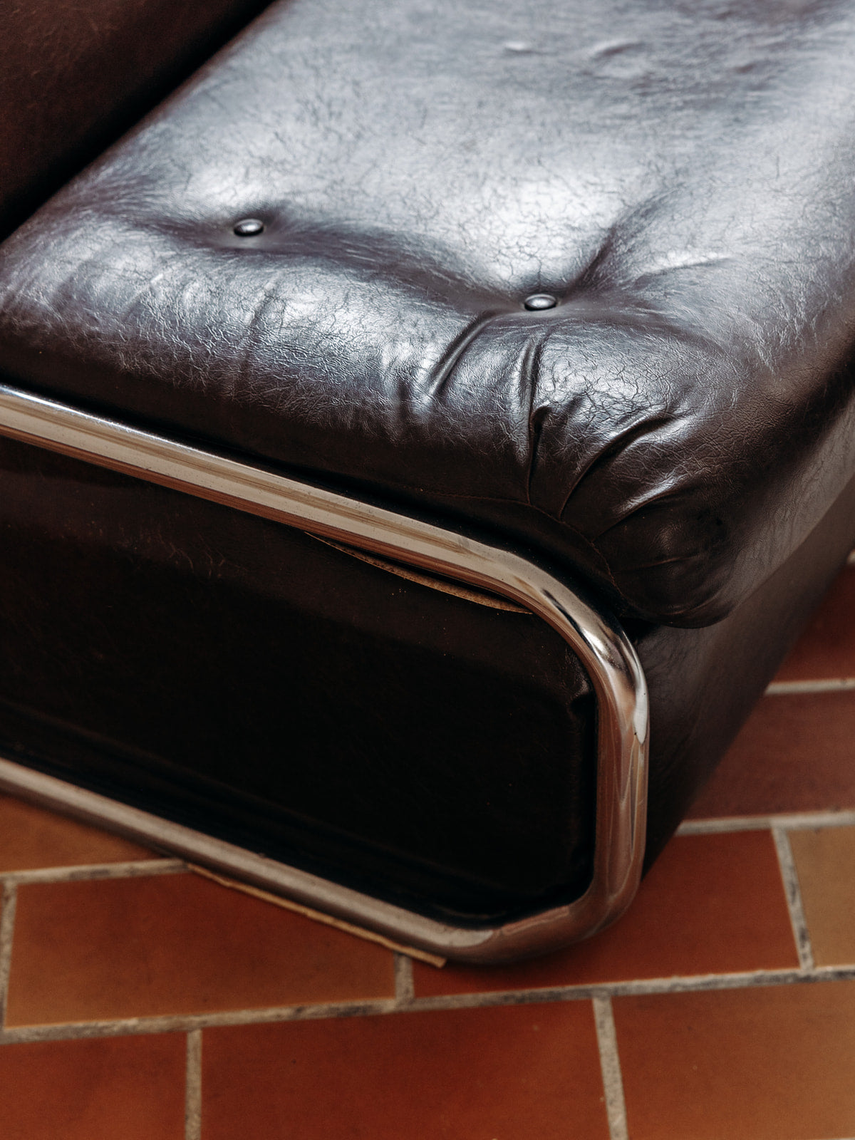 Apportez une touche rétro à votre intérieur avec cette chauffeuse convertible alliant métal chromé et skaï marron. Conçu pour se transformer rapidement en un couchage confortable pour une personne, il est parfait pour les petits espaces. Son style vintage, bien qu’il présente un bouton manquant et un trou discret sur le dossier, reste intemporel et fonctionnel. Idéal pour optimiser l’espace tout en ajoutant du caractère à votre décoration.