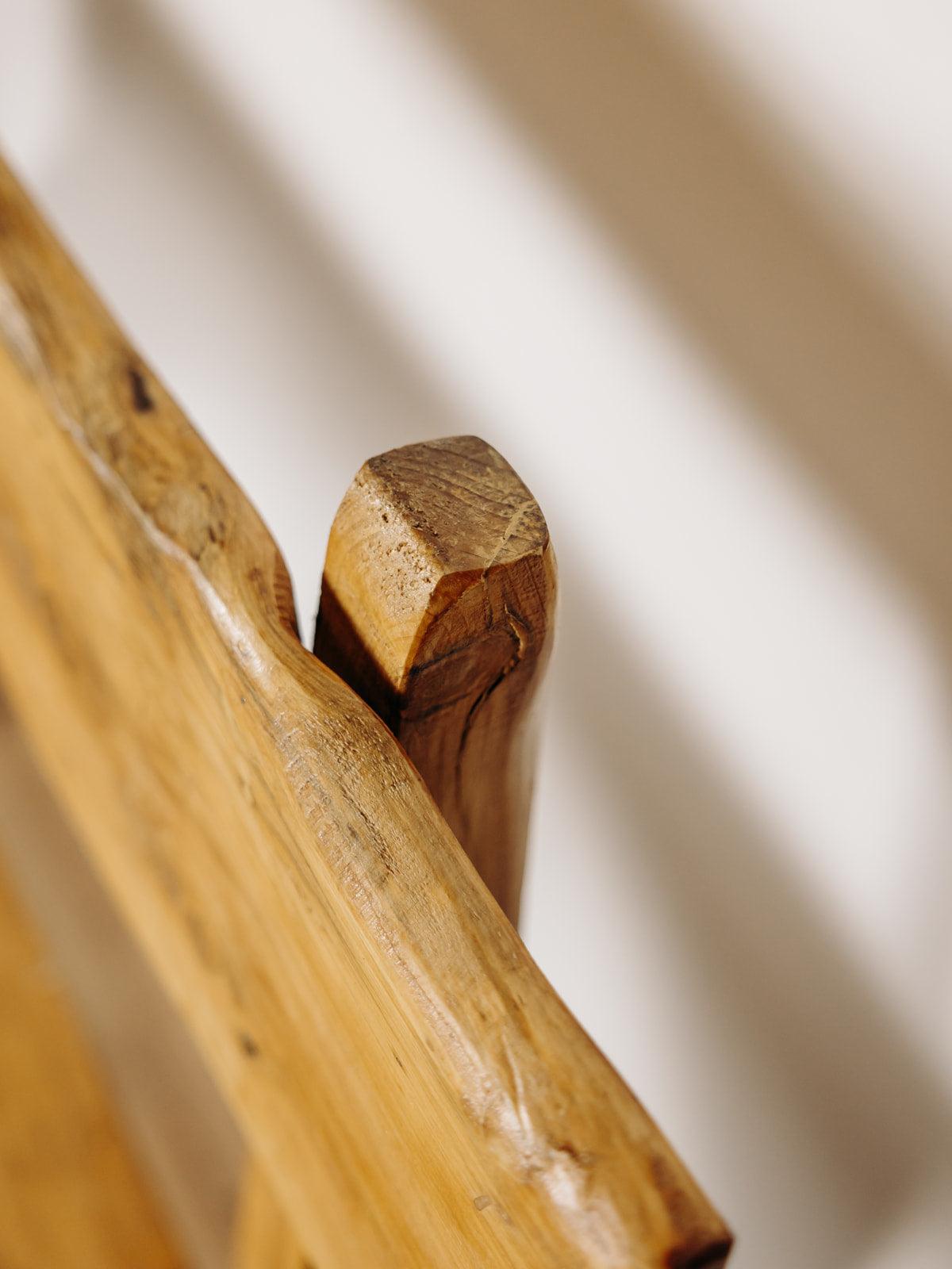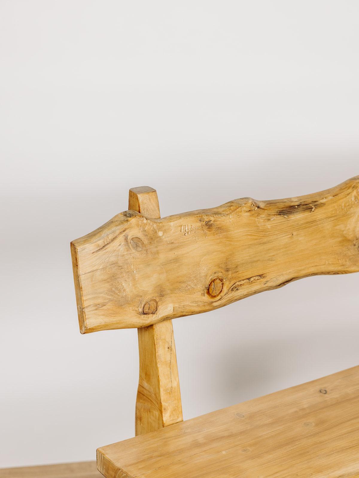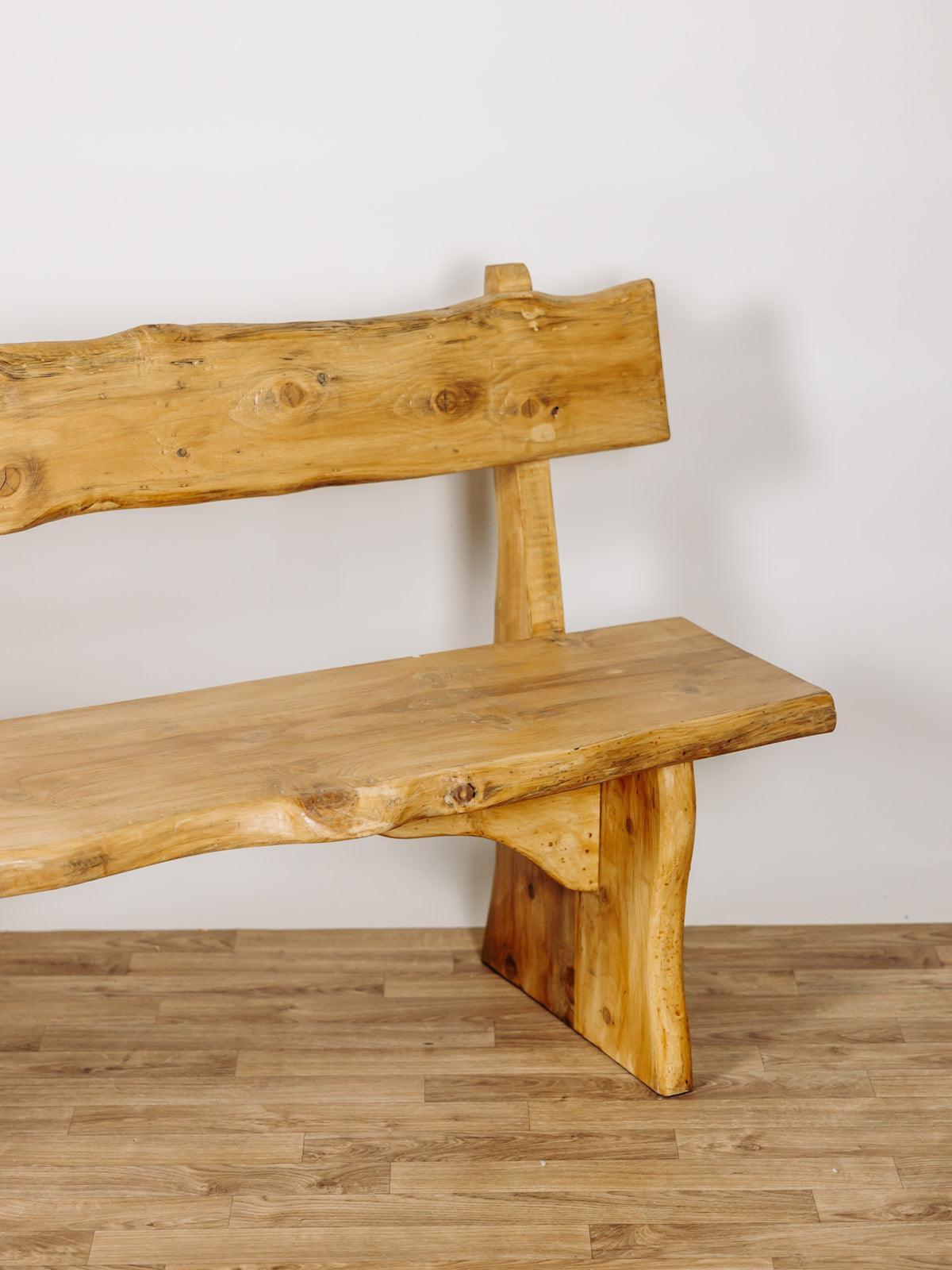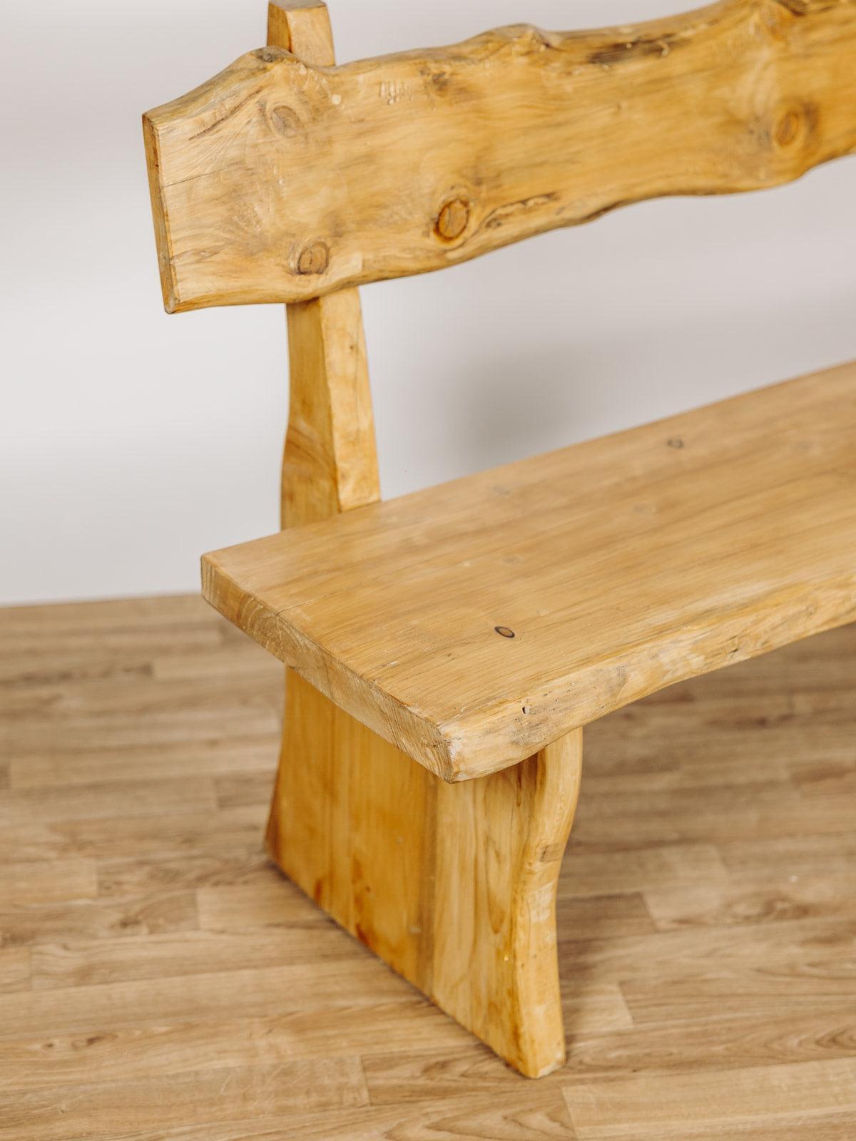 Ce banc brutaliste en chêne massif est une pièce artisanale exceptionnelle des années 70. Entièrement verni et naturellement cérusé, il met en valeur la beauté brute du bois, avec ses nœuds charmants qui en font une pièce unique. Le dossier et l’assise, taillés dans des planches pleines, renforcent son caractère brutaliste au style chalet. Sa conception en chêne massif lui confère une grande solidité et un poids conséquent, soulignant ainsi son authenticité et sa durabilité. Deux sont disponibles.