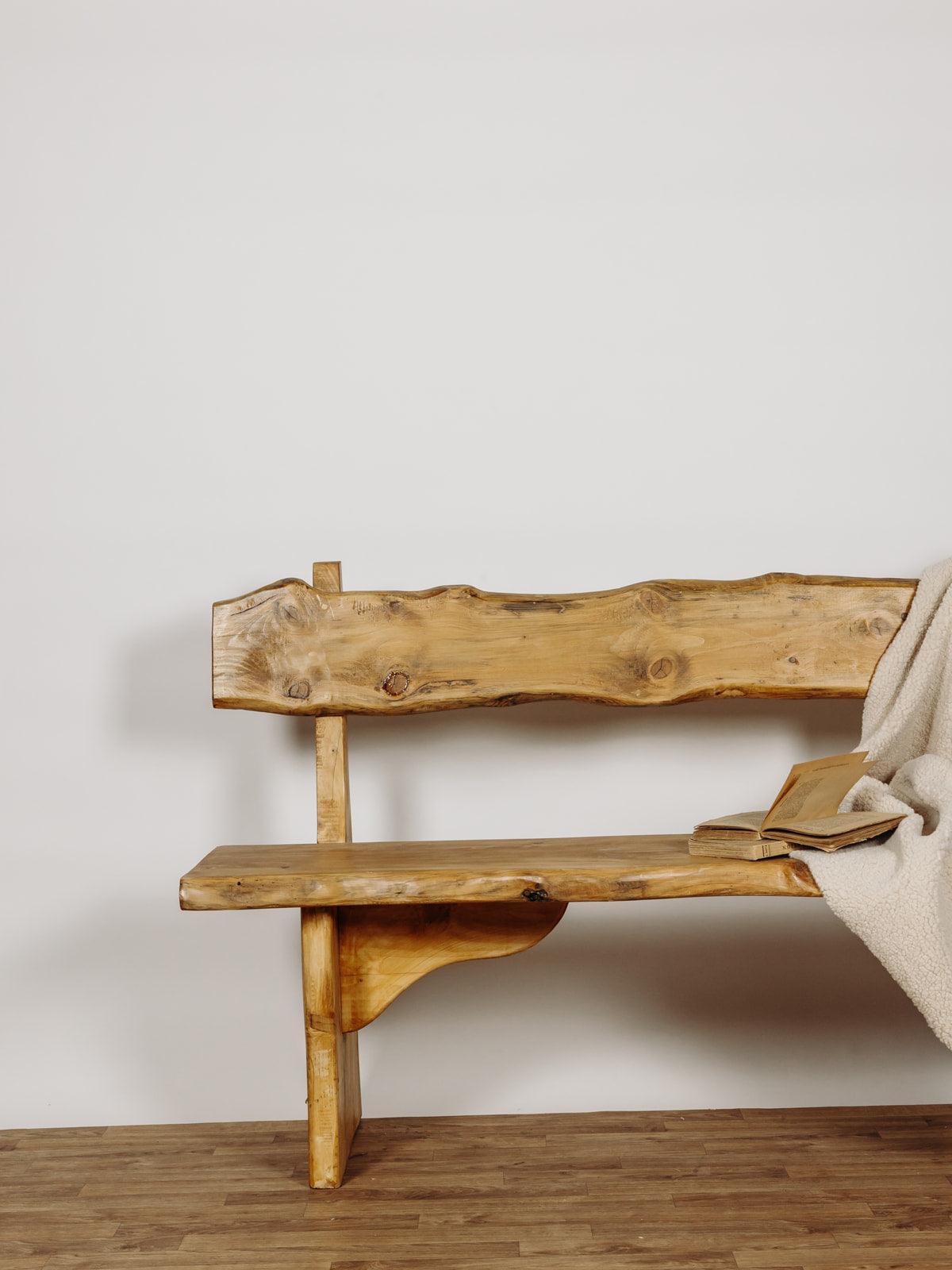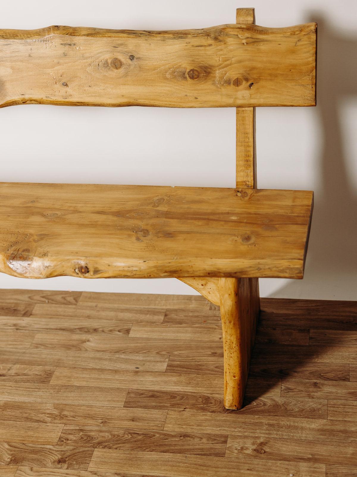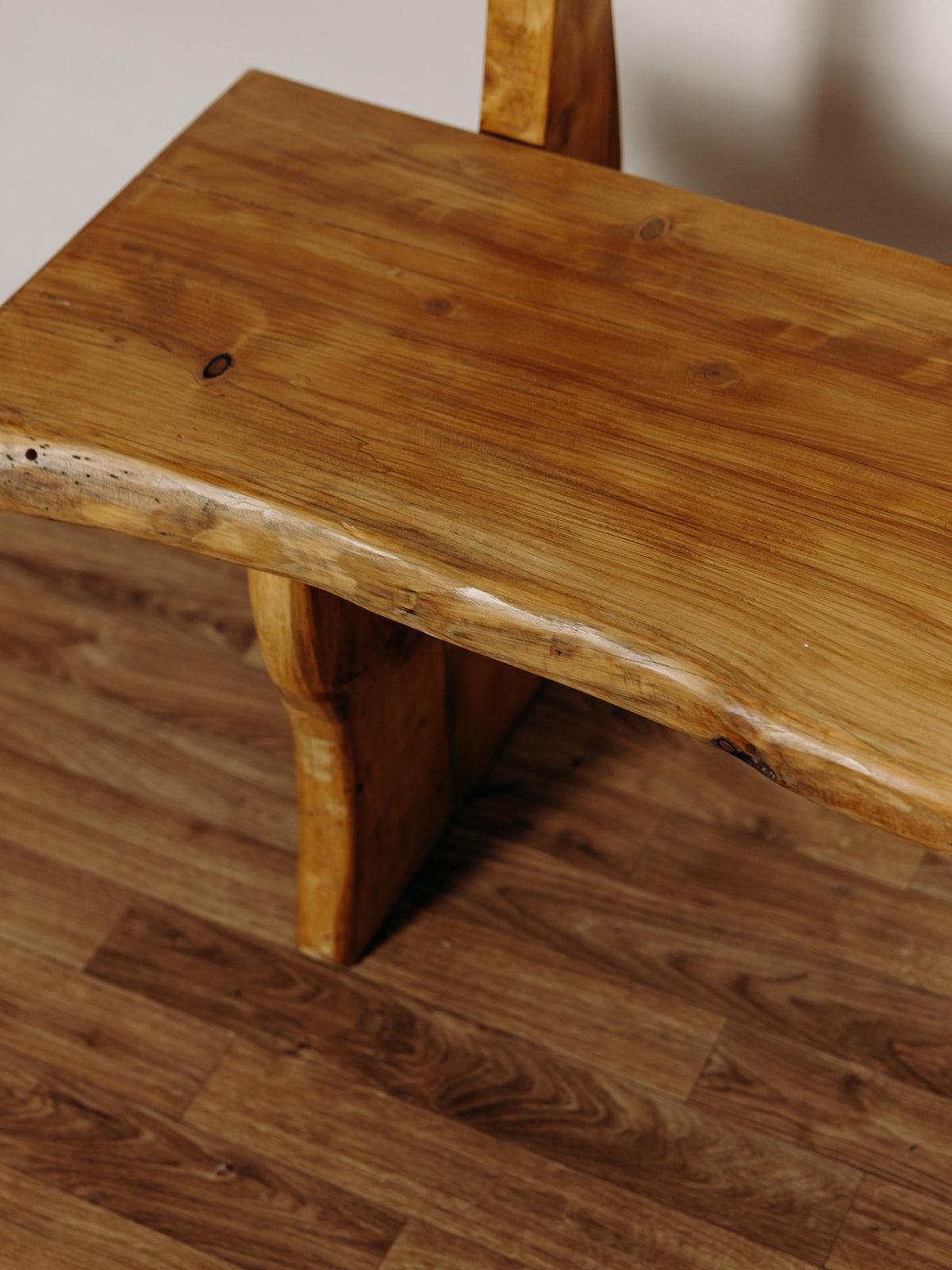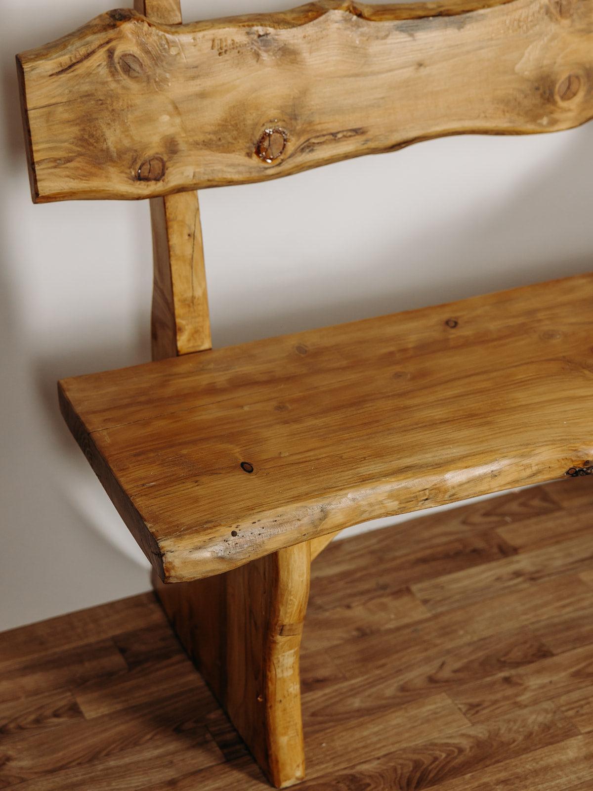 Ce banc brutaliste en chêne massif est une pièce artisanale exceptionnelle des années 70. Entièrement verni et naturellement cérusé, il met en valeur la beauté brute du bois, avec ses nœuds charmants qui en font une pièce unique. Le dossier et l’assise, taillés dans des planches pleines, renforcent son caractère brutaliste au style chalet. Sa conception en chêne massif lui confère une grande solidité et un poids conséquent, soulignant ainsi son authenticité et sa durabilité. Deux sont disponibles.