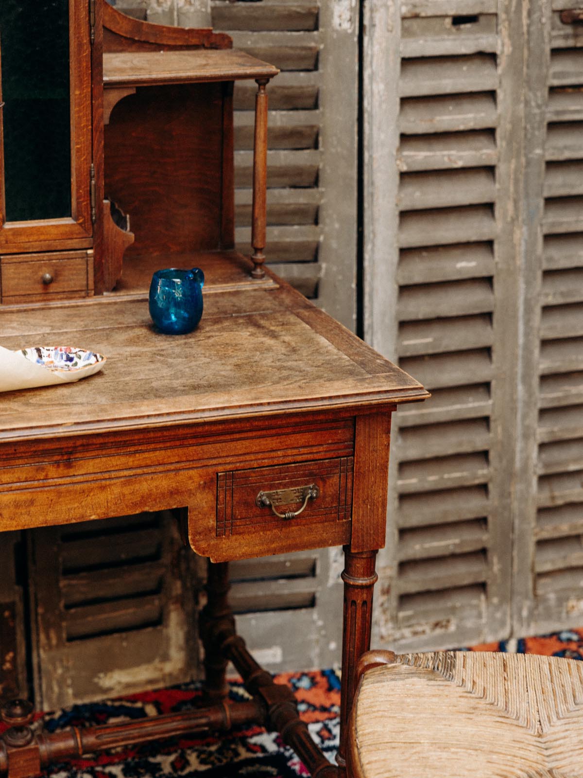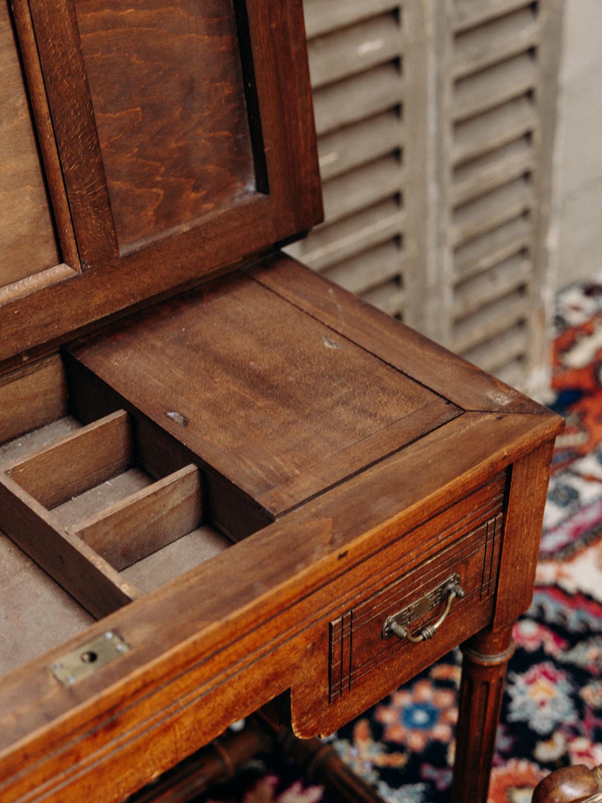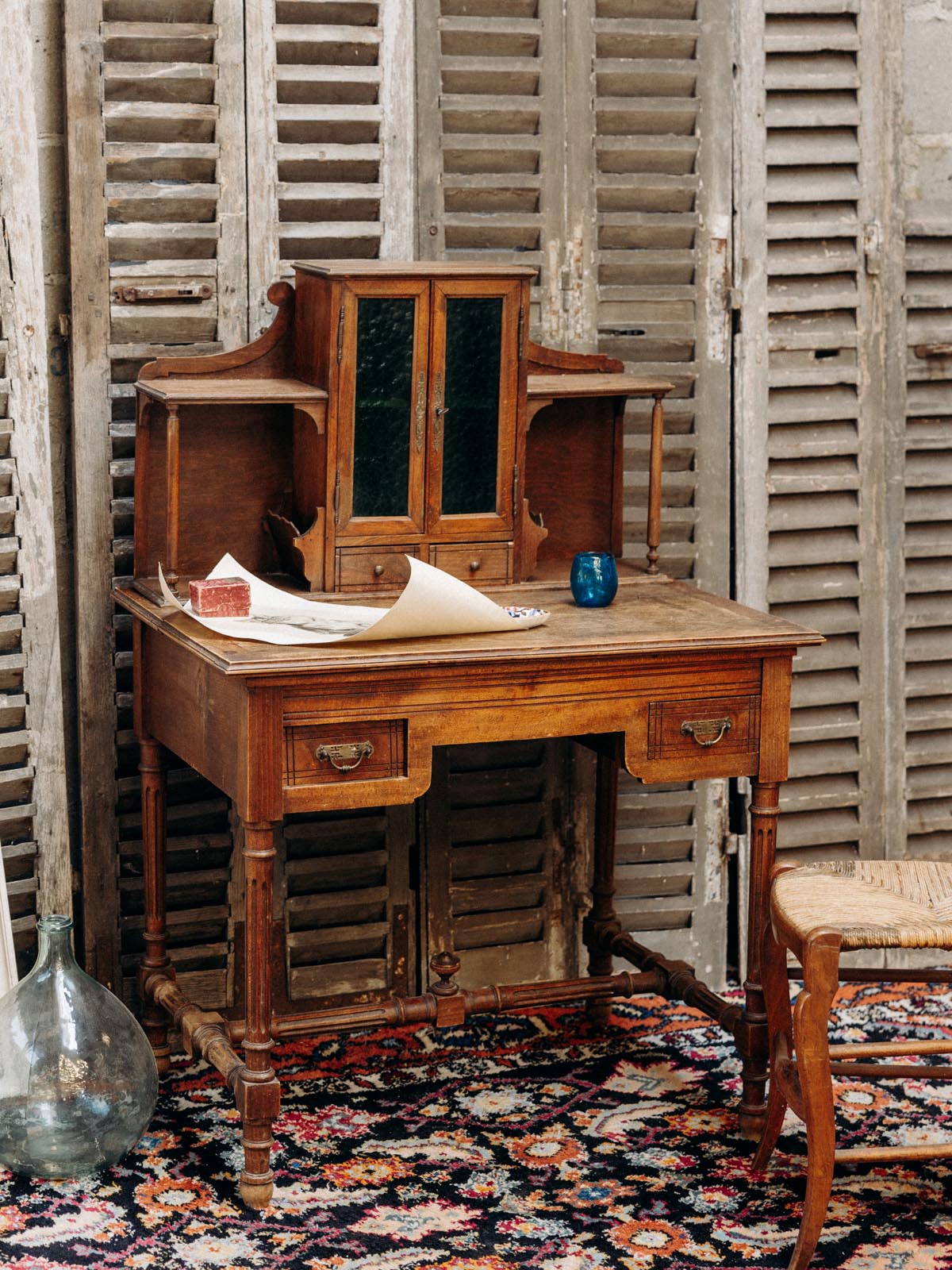 Apportez une touche d'élégance rétro à votre intérieur avec ce petit bureau vintage. Doté de deux petits tiroirs à l'avant pour un rangement pratique, il se distingue par sa structure surélevée avec vitres se posant sur le plateau, offrant un espace de travail lumineux. La barre en bas ajoute une finition raffinée tout en renforçant la stabilité. Idéal pour aménager un coin bureau fonctionnel et stylé, ce bureau saura séduire les amateurs de décoration vintage.
