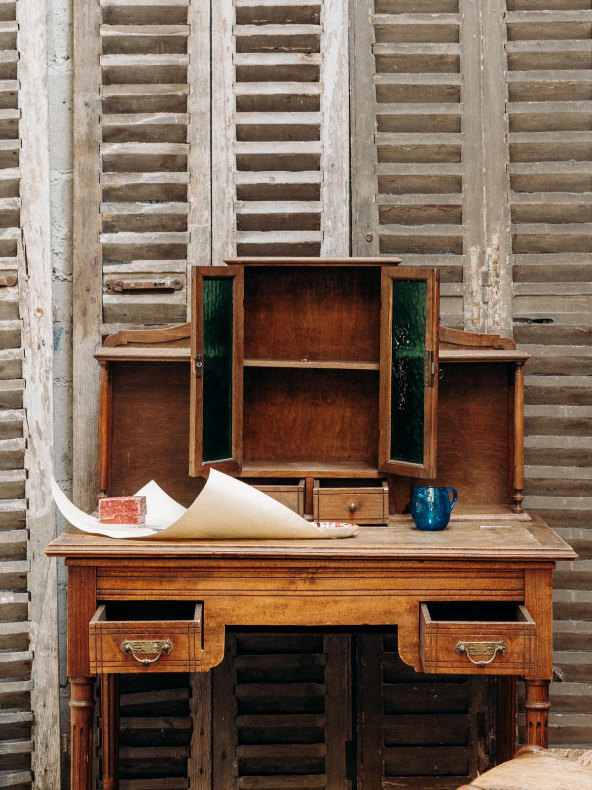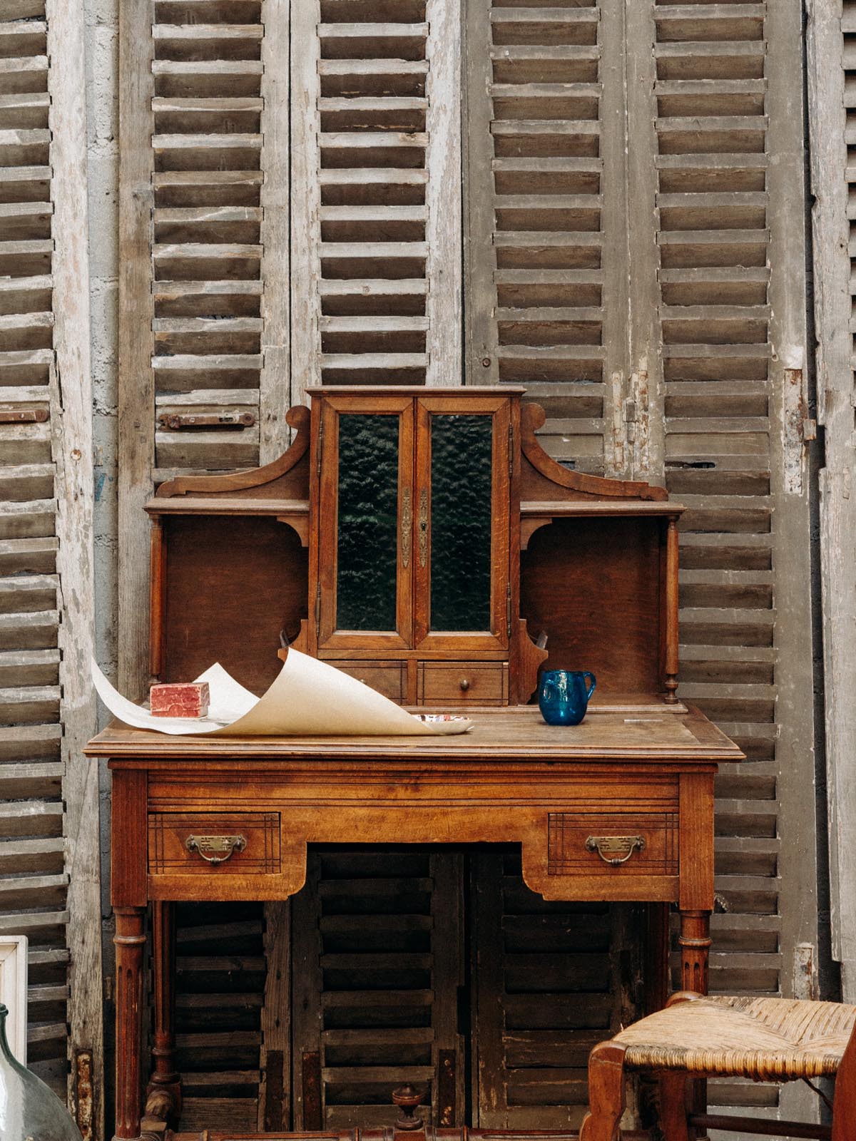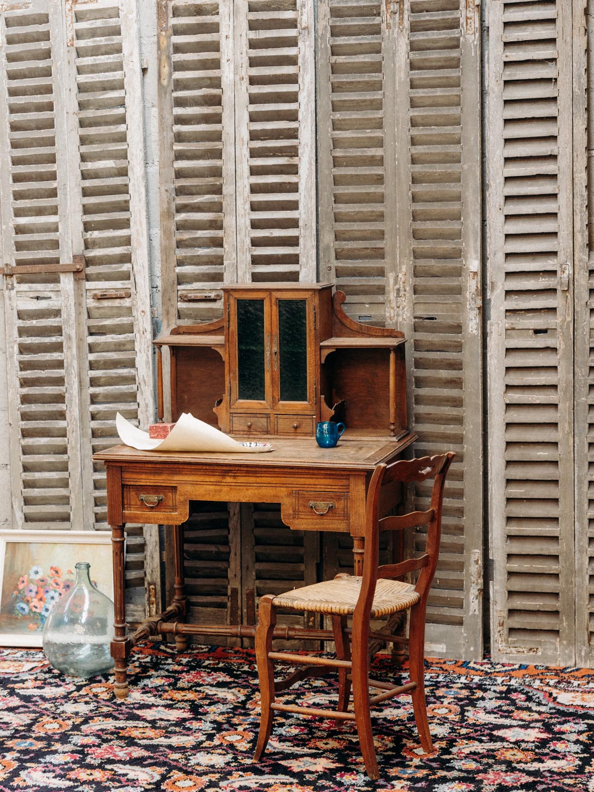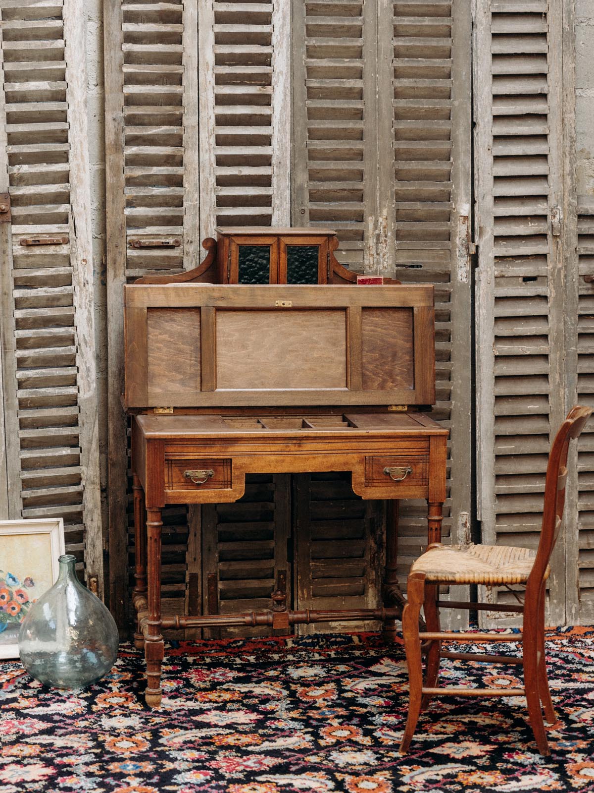 Apportez une touche d'élégance rétro à votre intérieur avec ce petit bureau vintage. Doté de deux petits tiroirs à l'avant pour un rangement pratique, il se distingue par sa structure surélevée avec vitres se posant sur le plateau, offrant un espace de travail lumineux. La barre en bas ajoute une finition raffinée tout en renforçant la stabilité. Idéal pour aménager un coin bureau fonctionnel et stylé, ce bureau saura séduire les amateurs de décoration vintage.