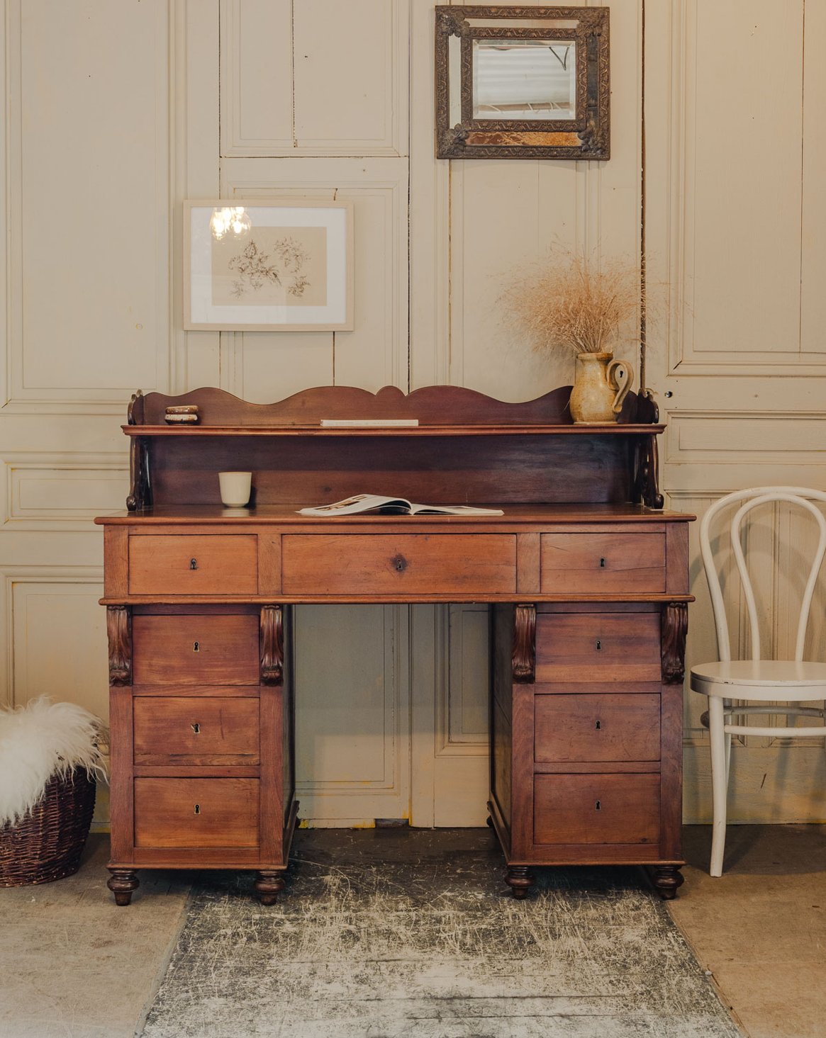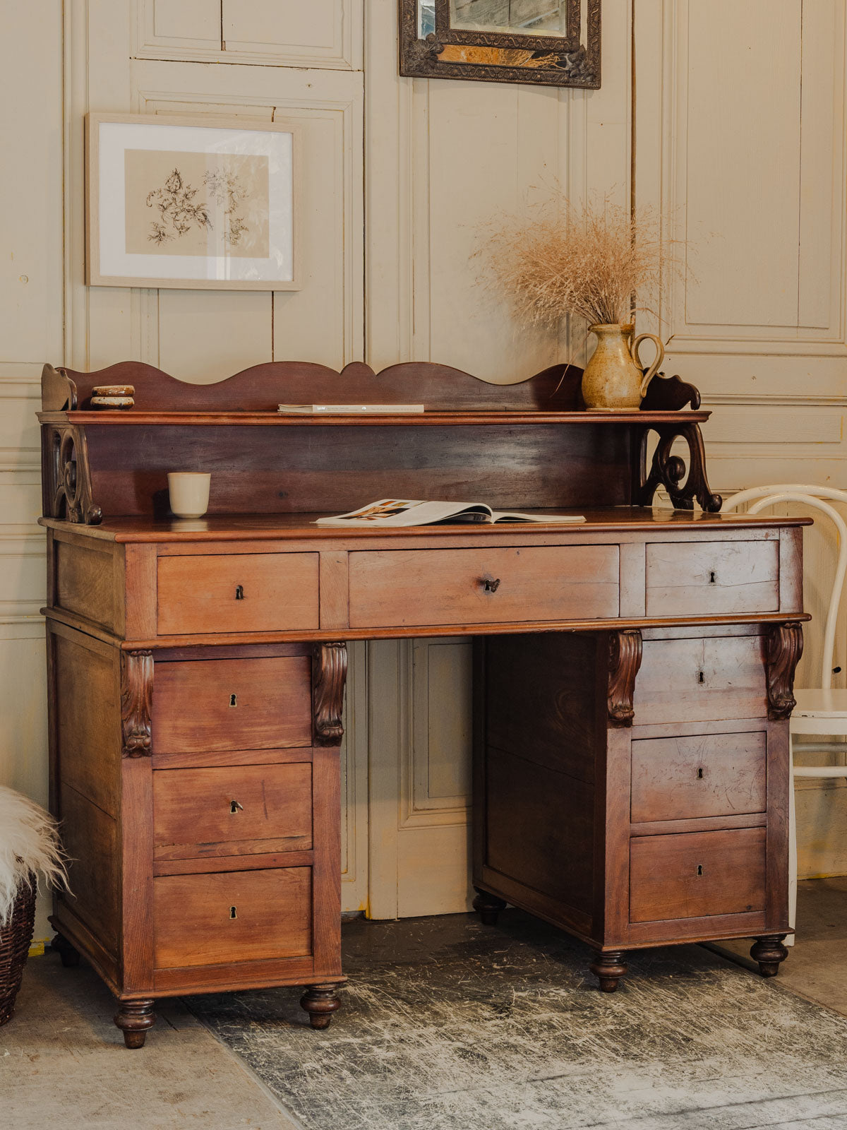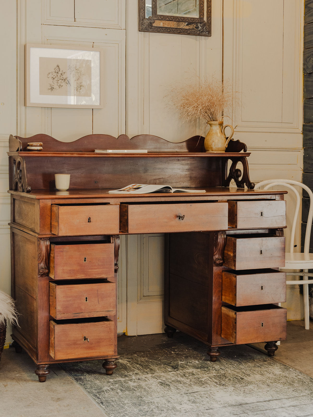 Découvrez ce magnifique bureau d'époque 19ème en plaquage acajou, alliant élégance et fonctionnalité. Avec ses 9 tiroirs spacieux, il offre un vaste espace de rangement tout en ajoutant une touche de charme à votre intérieur. Clé fournie pour, ce bureau peut également faire office de console grâce à sa silhouette raffinée. Un meuble d'exception qui saura trouver sa place dans votre décoration tout en conservant son authenticité.