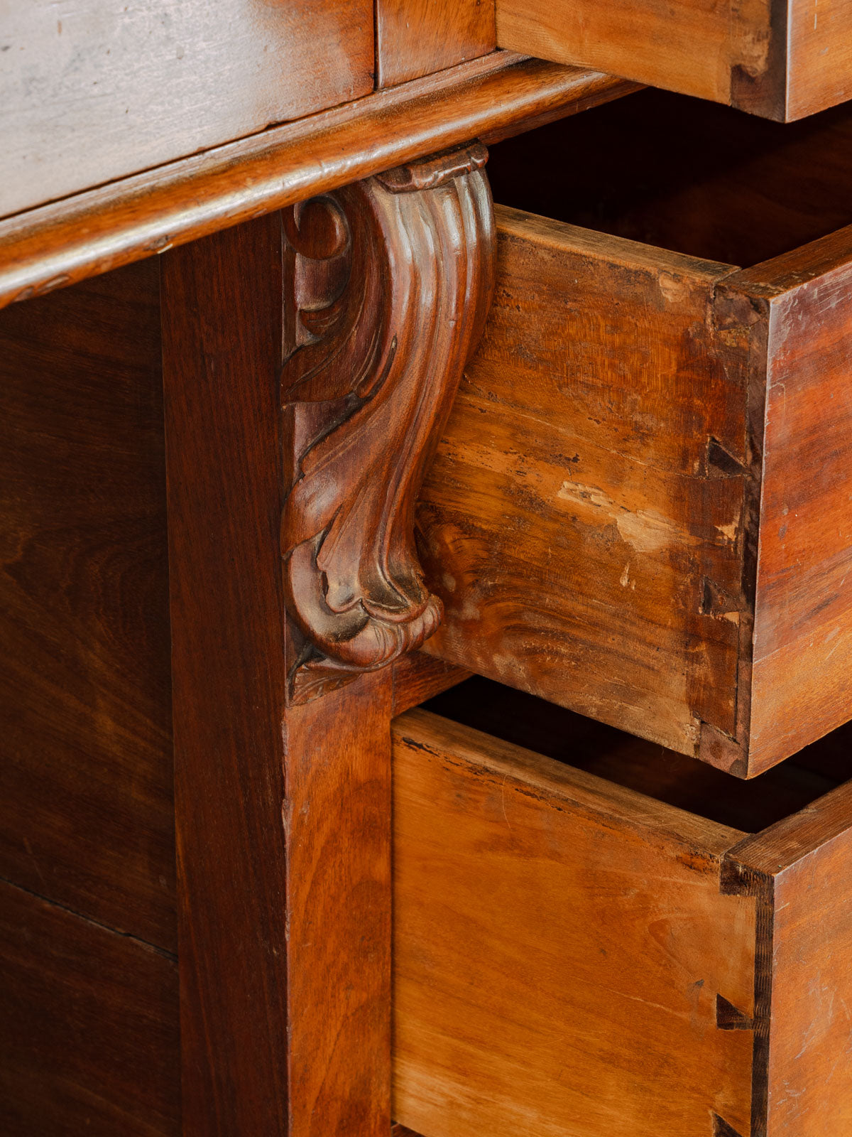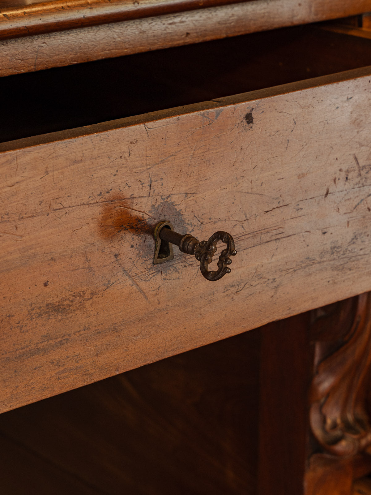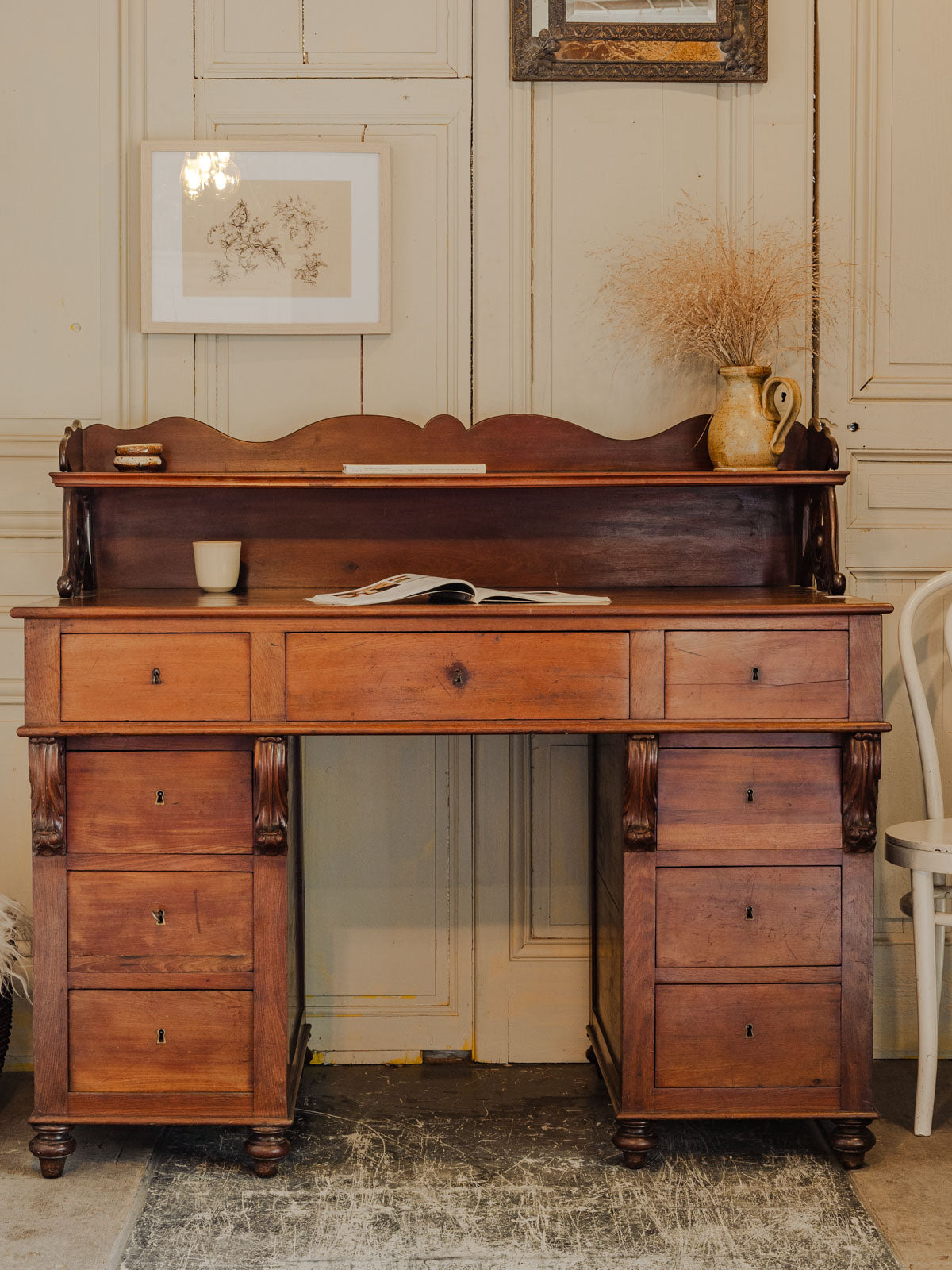Découvrez ce magnifique bureau d'époque 19ème en plaquage acajou, alliant élégance et fonctionnalité. Avec ses 9 tiroirs spacieux, il offre un vaste espace de rangement tout en ajoutant une touche de charme à votre intérieur. Clé fournie pour, ce bureau peut également faire office de console grâce à sa silhouette raffinée. Un meuble d'exception qui saura trouver sa place dans votre décoration tout en conservant son authenticité.