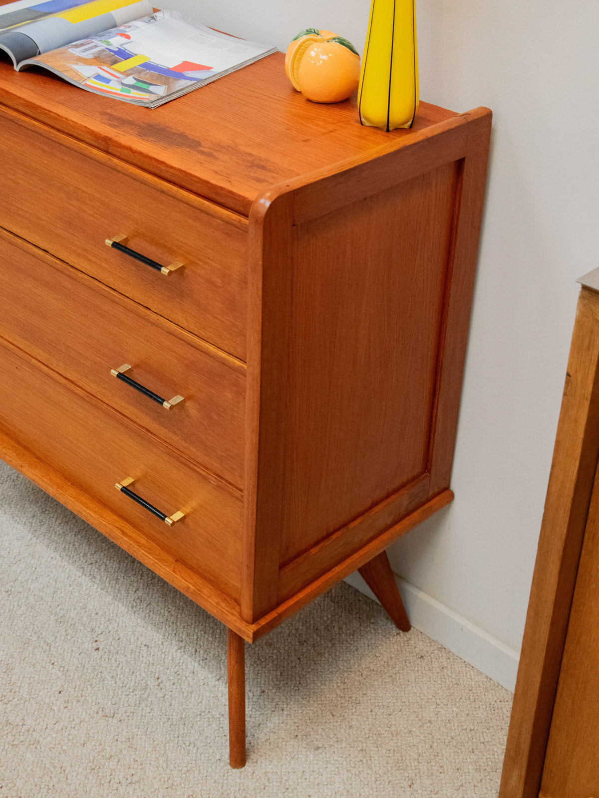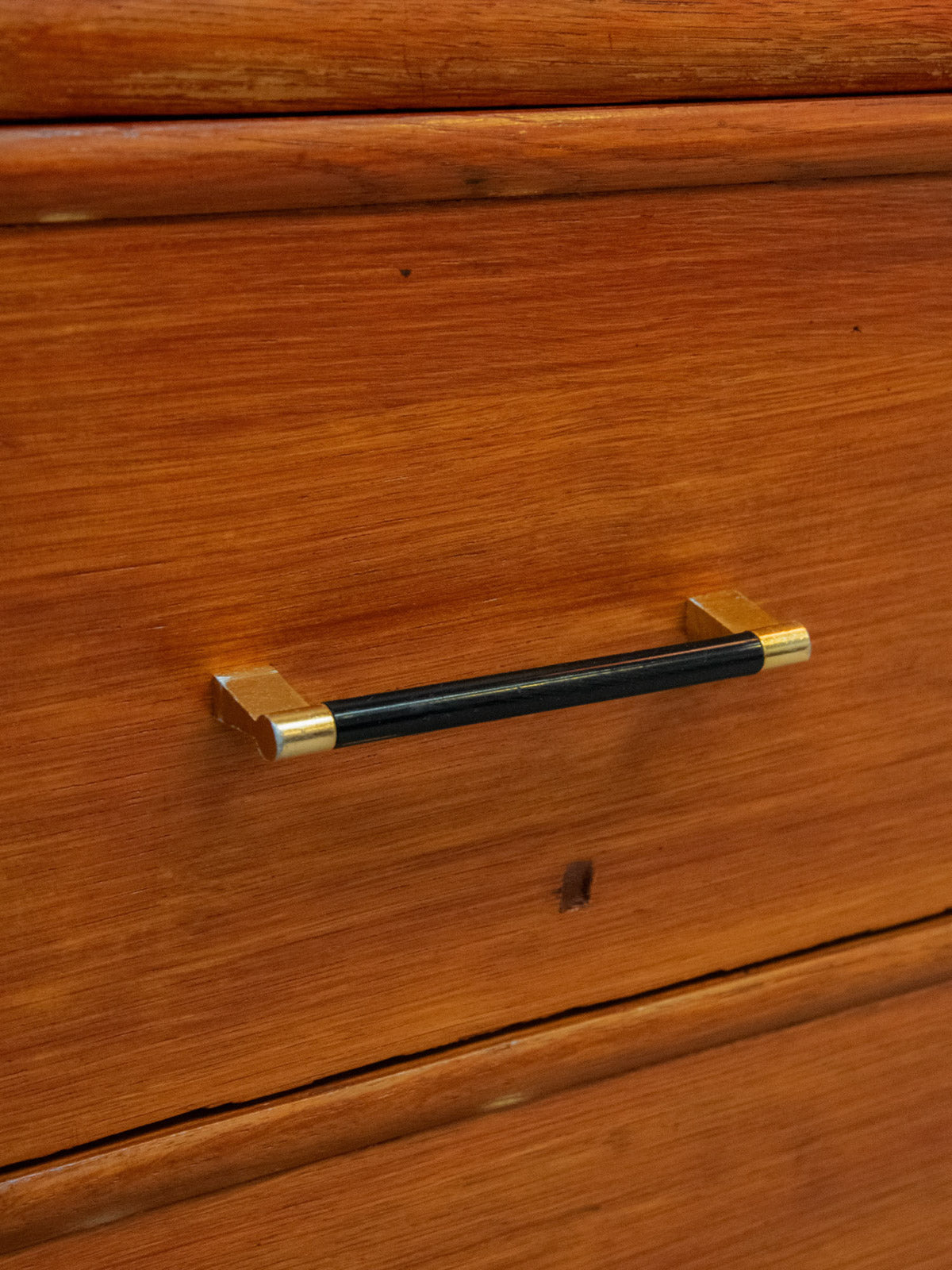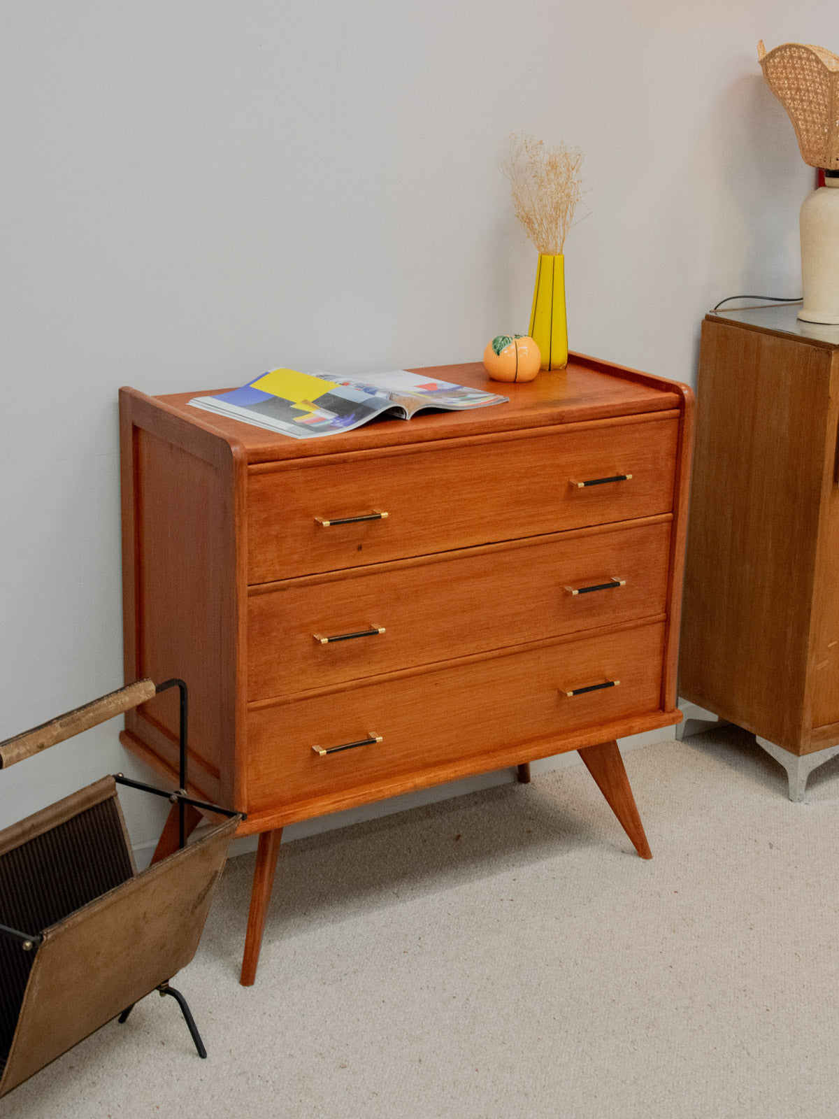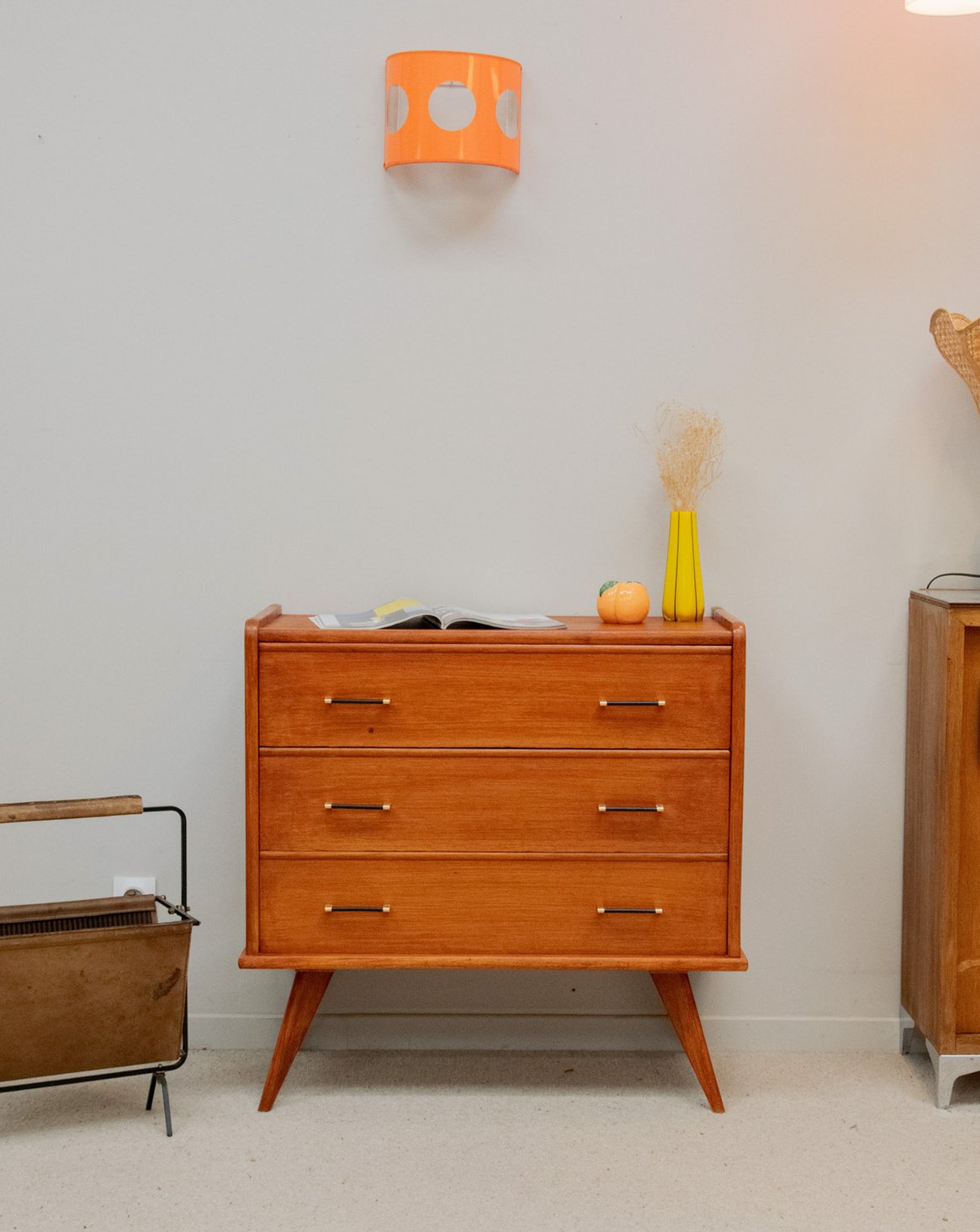 Cette charmante commode en bois au fini merisier apporte une touche d'élégance à votre intérieur. Équipée de trois tiroirs, elle offre un espace de rangement pratique tout en mettant en avant de délicates poignées en laiton et plastique noir. Bien que quelques tâches subsistent sur le plateau et dans les tiroirs, cela n'enlève rien à son caractère unique. Parfaite pour allier style et fonctionnalité, elle saura s’intégrer harmonieusement dans votre décoration.