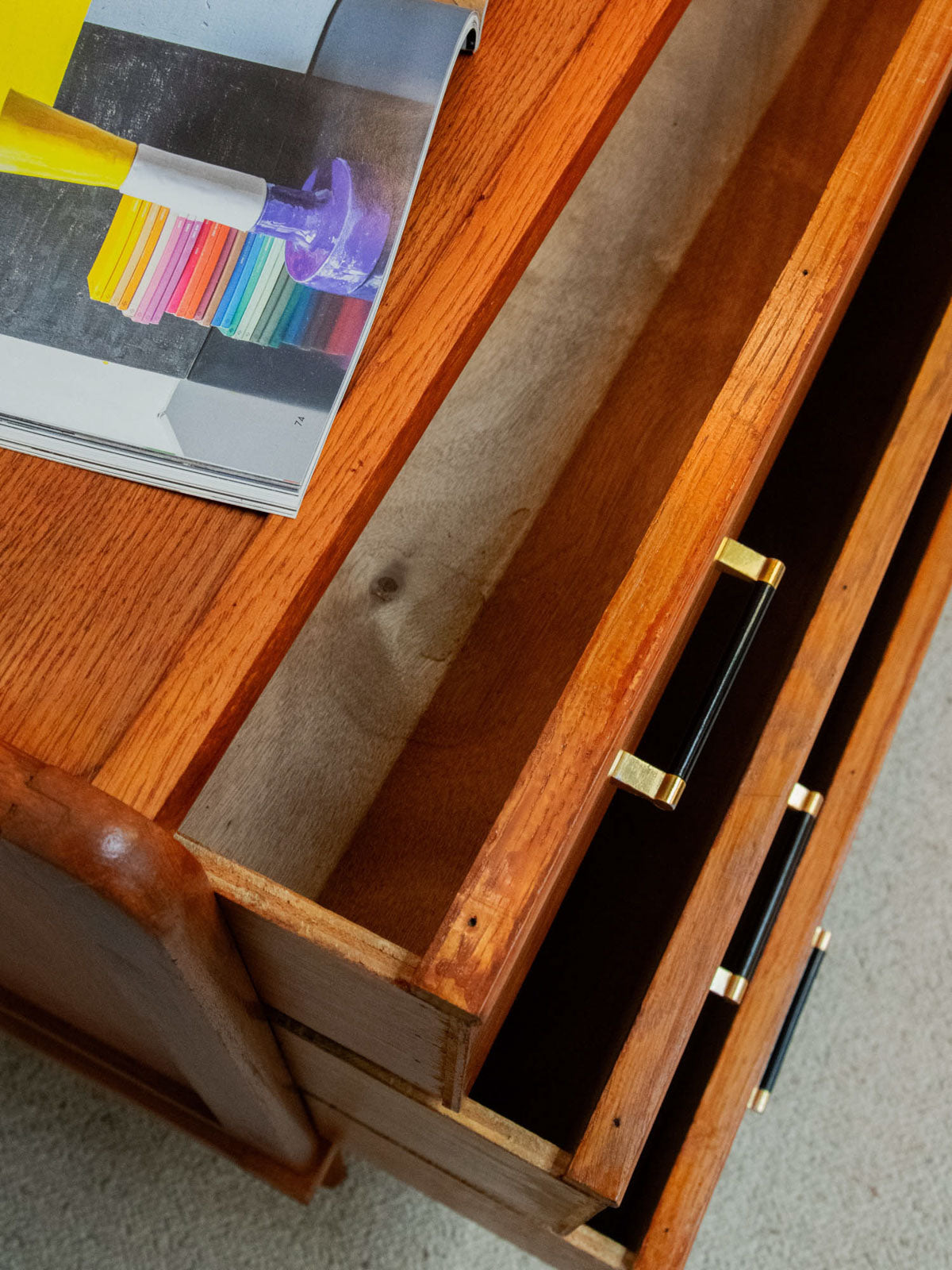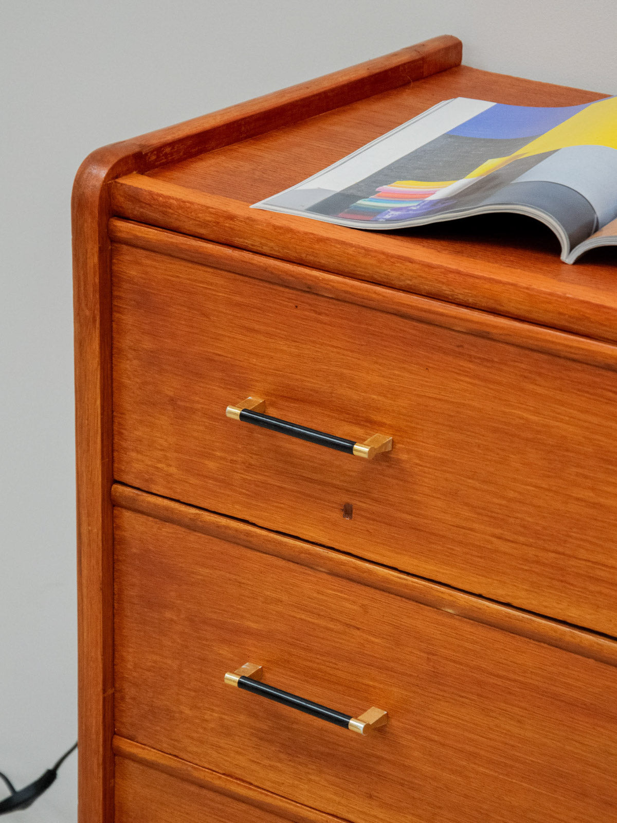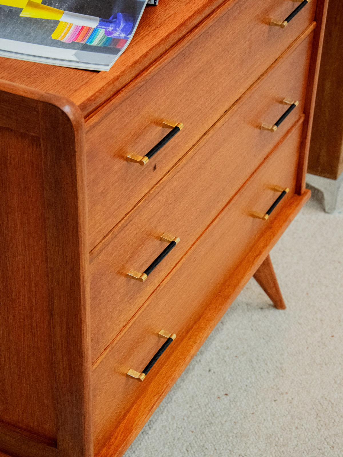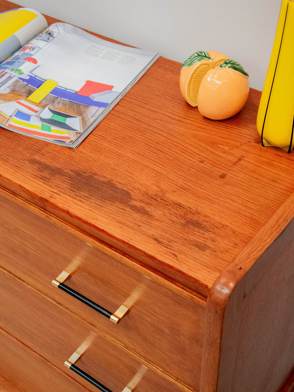 Cette charmante commode en bois au fini merisier apporte une touche d'élégance à votre intérieur. Équipée de trois tiroirs, elle offre un espace de rangement pratique tout en mettant en avant de délicates poignées en laiton et plastique noir. Bien que quelques tâches subsistent sur le plateau et dans les tiroirs, cela n'enlève rien à son caractère unique. Parfaite pour allier style et fonctionnalité, elle saura s’intégrer harmonieusement dans votre décoration.