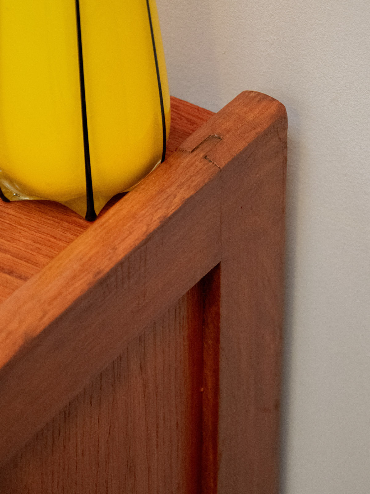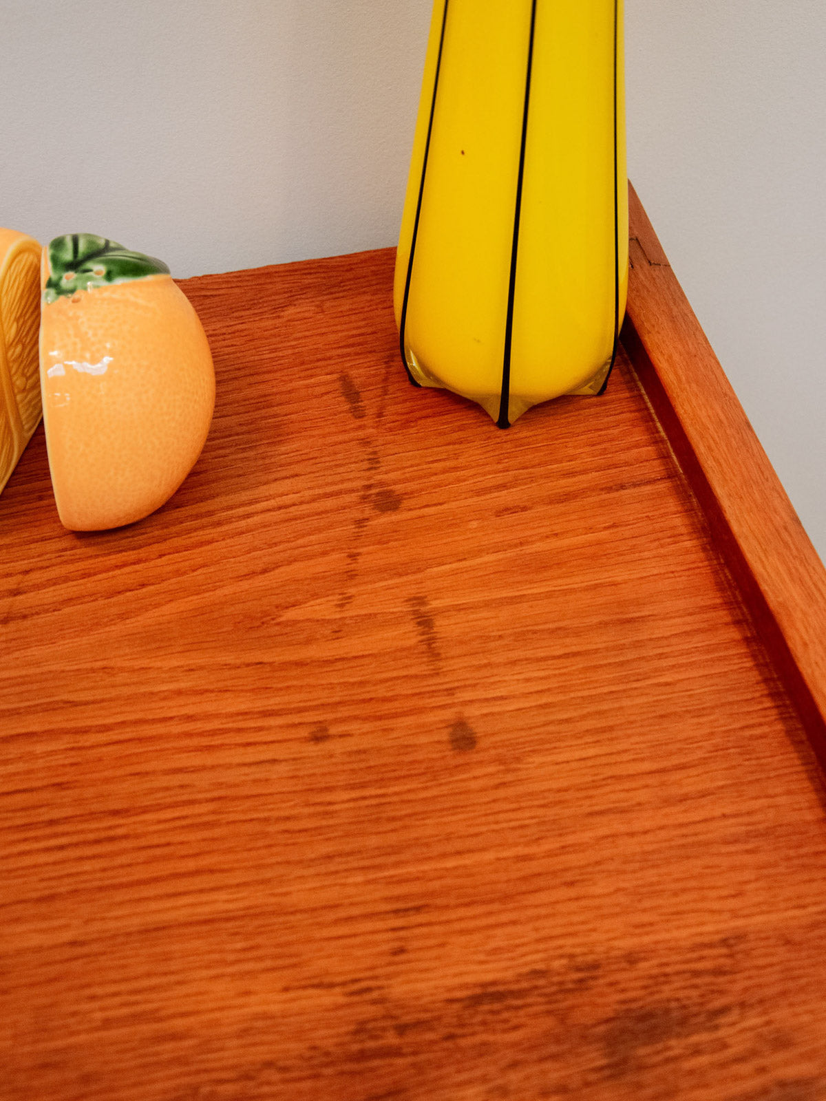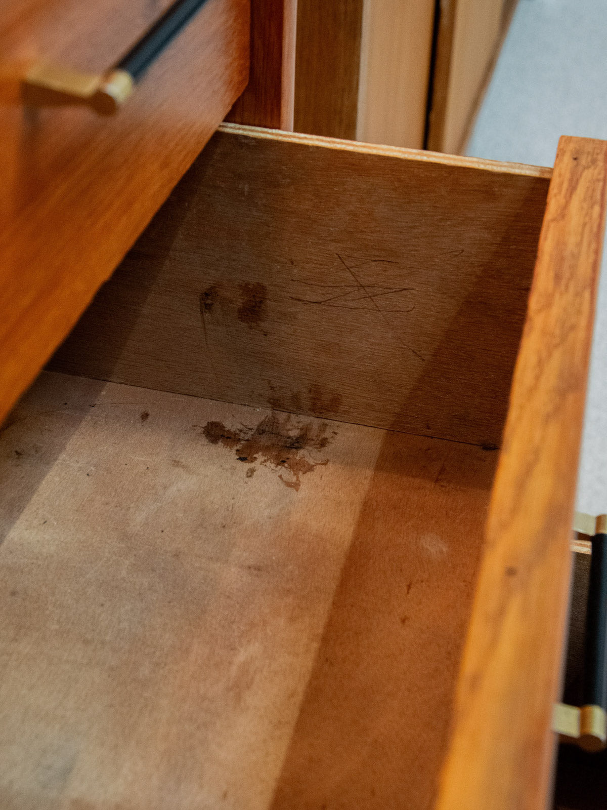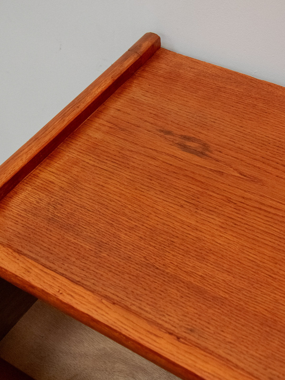 Cette charmante commode en bois au fini merisier apporte une touche d'élégance à votre intérieur. Équipée de trois tiroirs, elle offre un espace de rangement pratique tout en mettant en avant de délicates poignées en laiton et plastique noir. Bien que quelques tâches subsistent sur le plateau et dans les tiroirs, cela n'enlève rien à son caractère unique. Parfaite pour allier style et fonctionnalité, elle saura s’intégrer harmonieusement dans votre décoration.