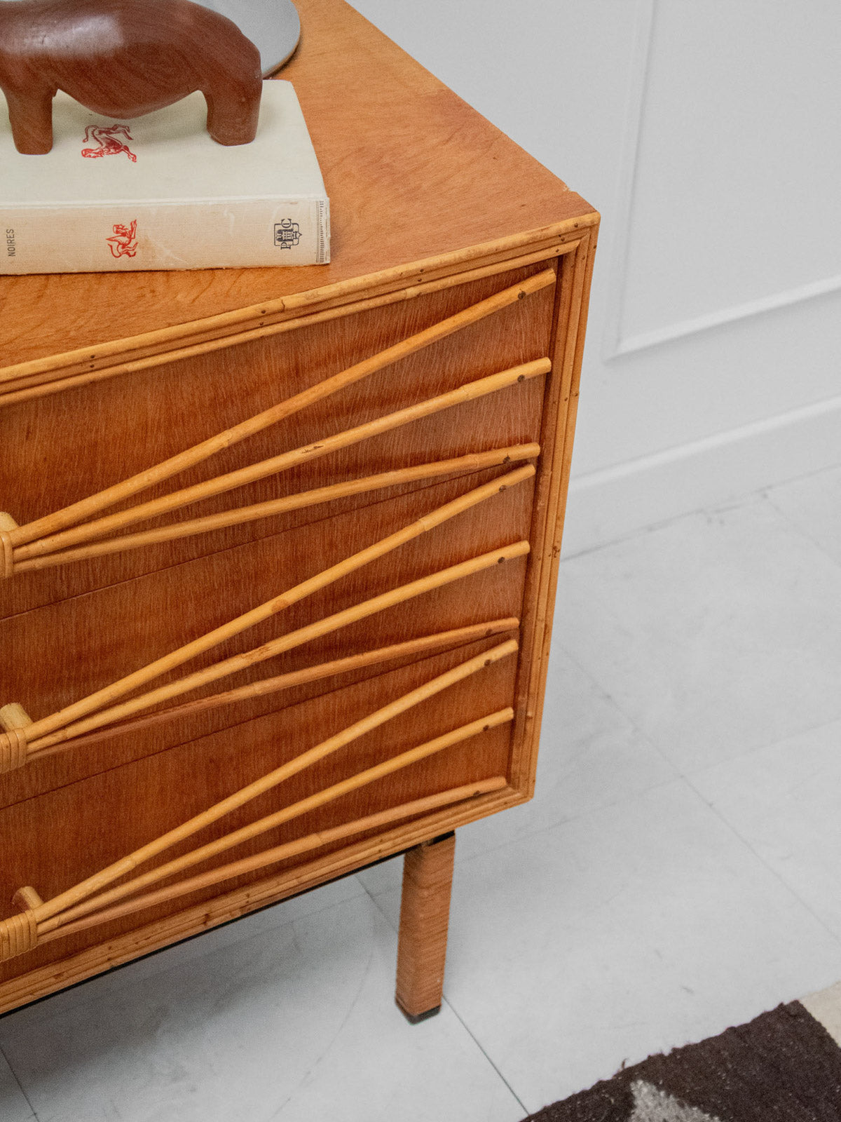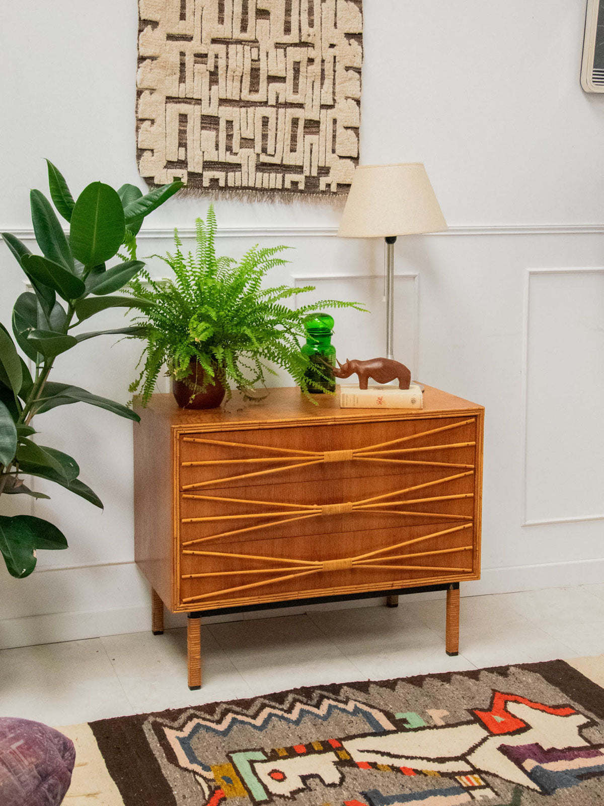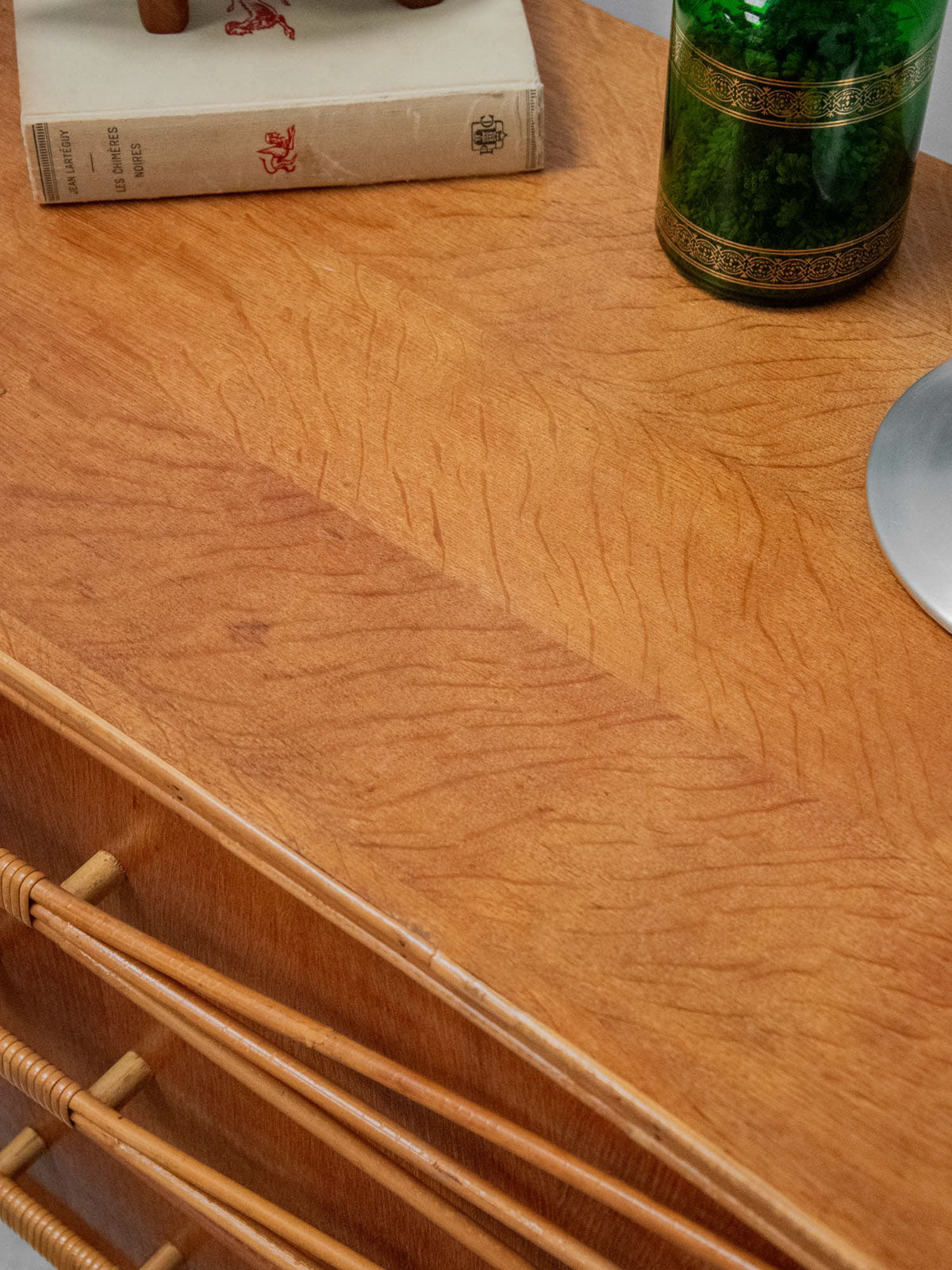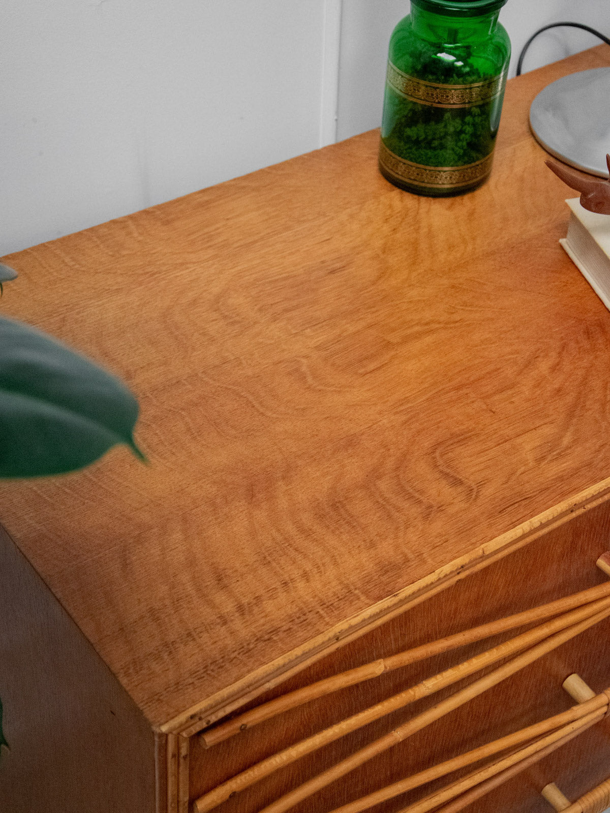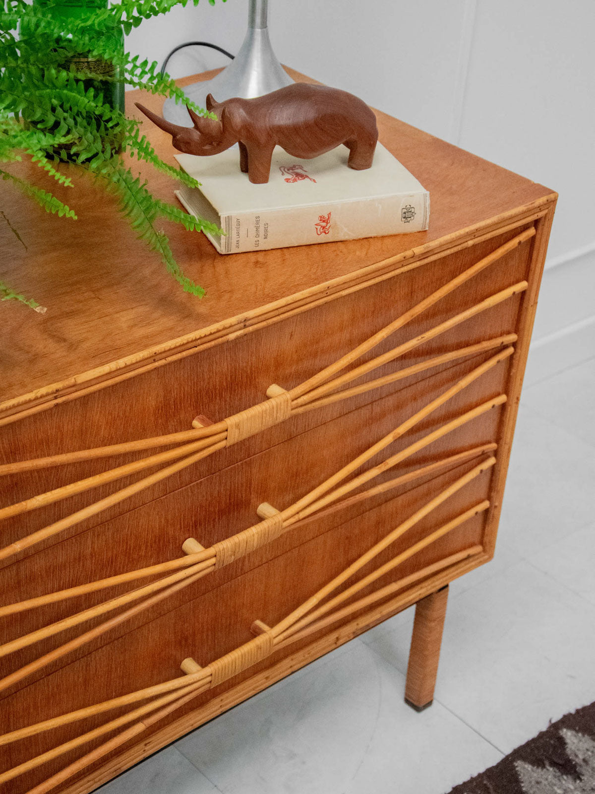 Ajoutez une touche rétro à votre intérieur avec cette commode des années 50 en bois, élégamment mise en valeur par un encadrement et des poignées en rotin. Son chêne doré réchauffe l’espace tout en offrant une ambiance vintage indémodable. Pratique et esthétique, cette pièce de mobilier allie fonctionnalité et style, apportant un charme unique à votre décoration. Un véritable incontournable pour les amateurs de design rétro.