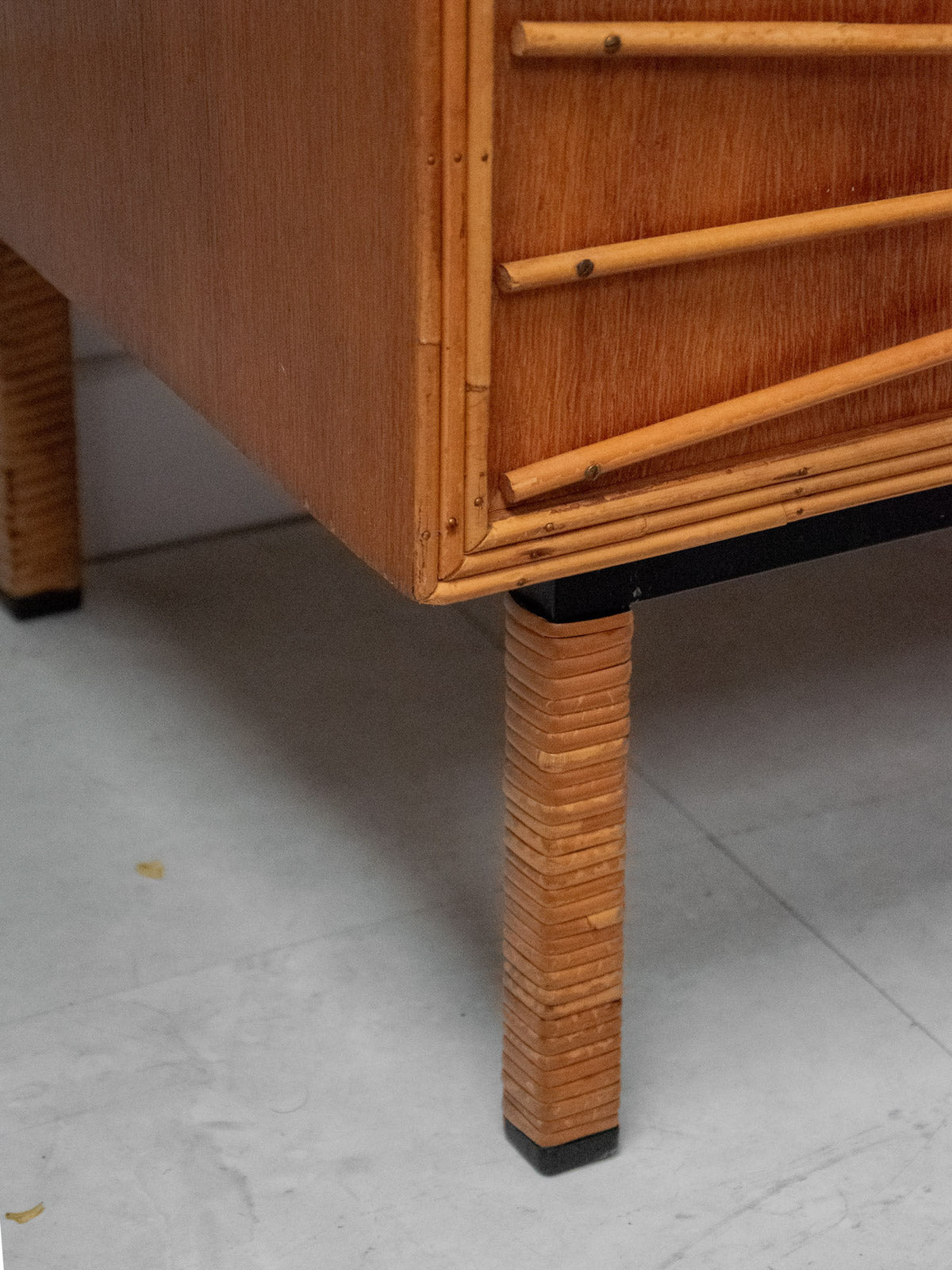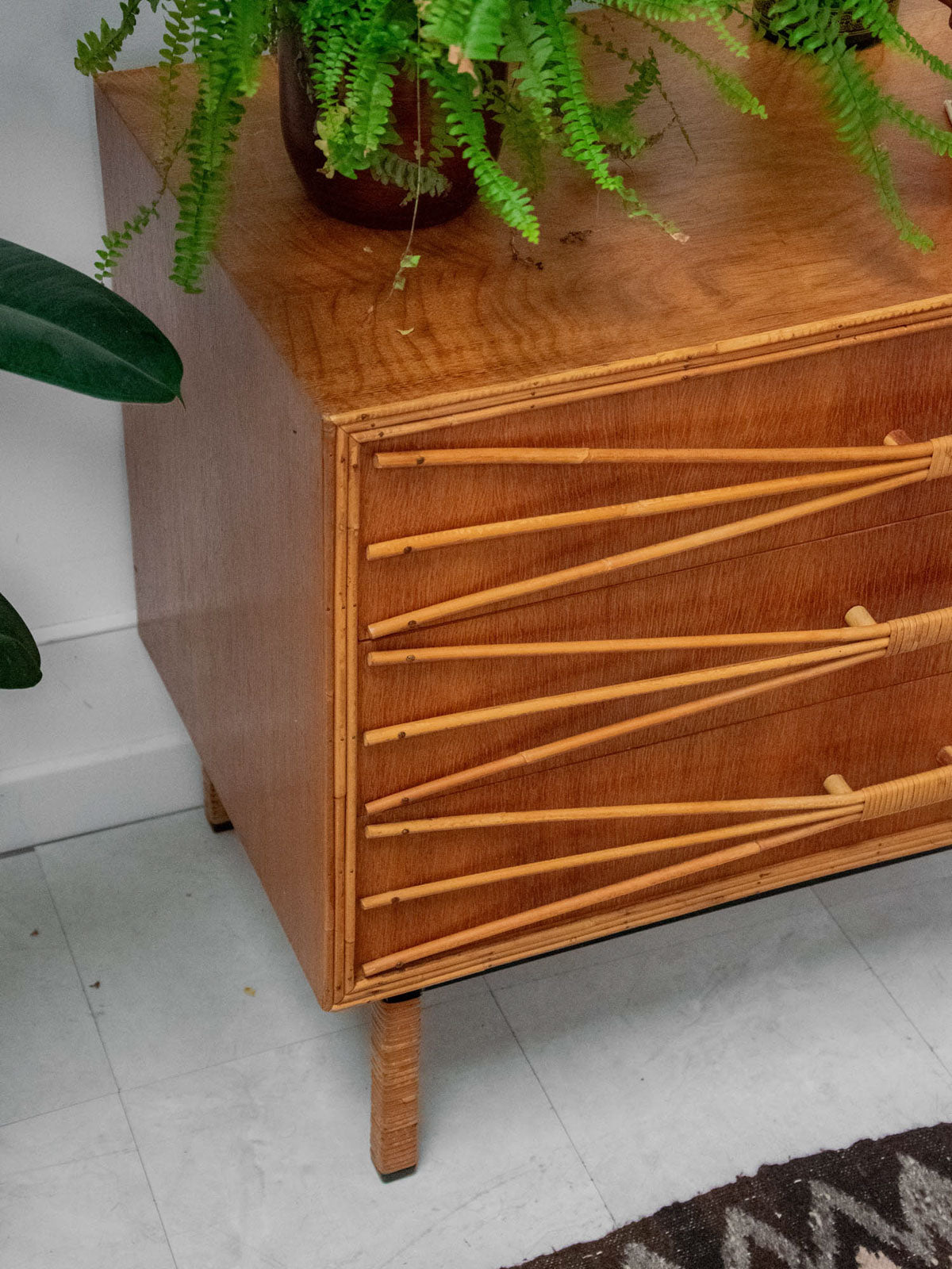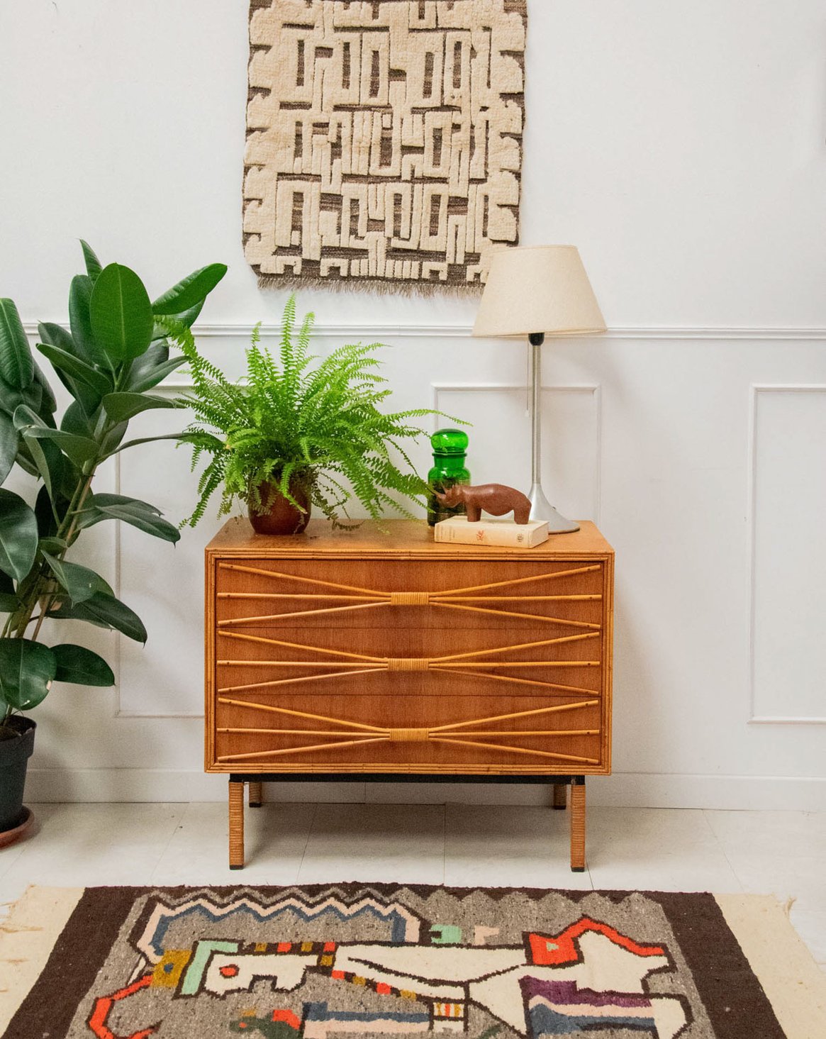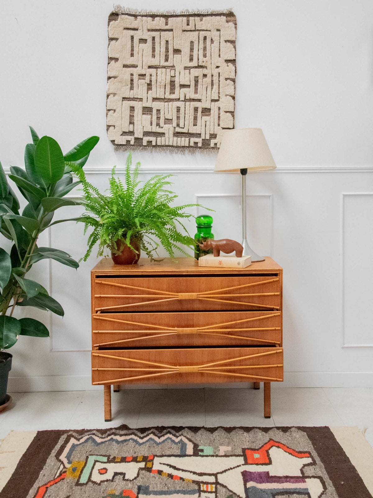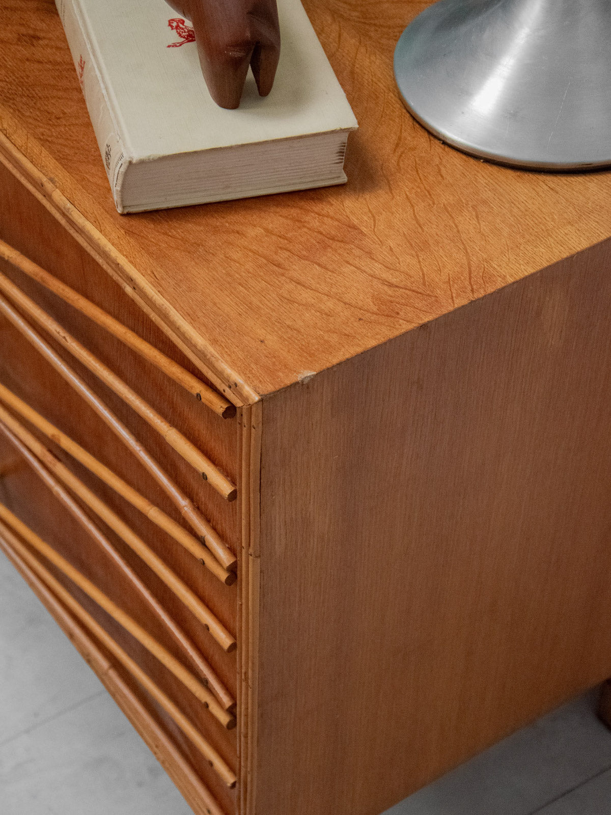 Ajoutez une touche rétro à votre intérieur avec cette commode des années 50 en bois, élégamment mise en valeur par un encadrement et des poignées en rotin. Son chêne doré réchauffe l’espace tout en offrant une ambiance vintage indémodable. Pratique et esthétique, cette pièce de mobilier allie fonctionnalité et style, apportant un charme unique à votre décoration. Un véritable incontournable pour les amateurs de design rétro.