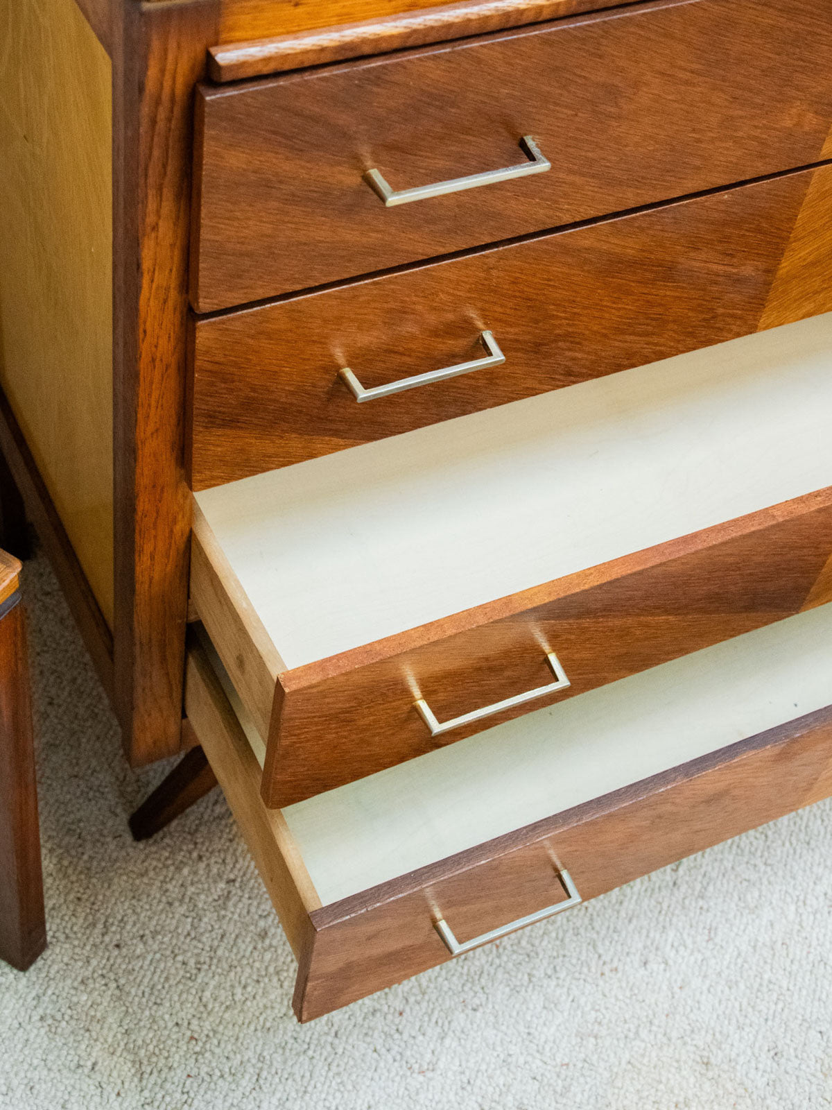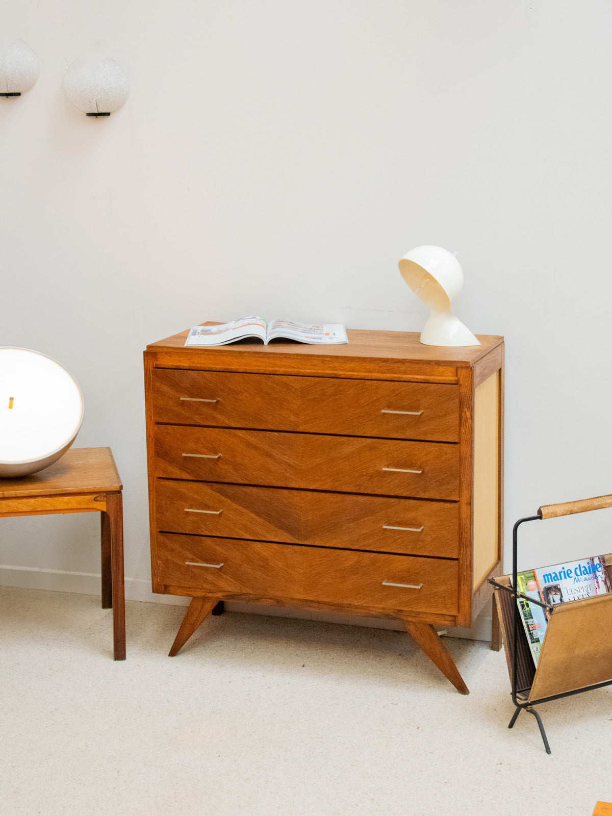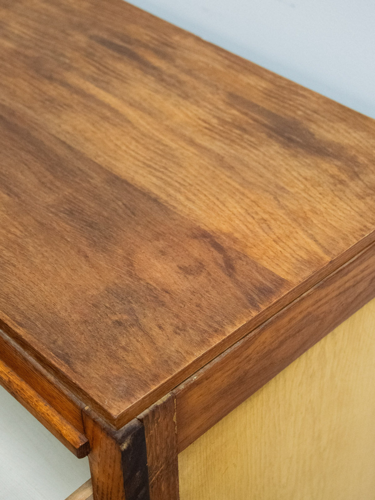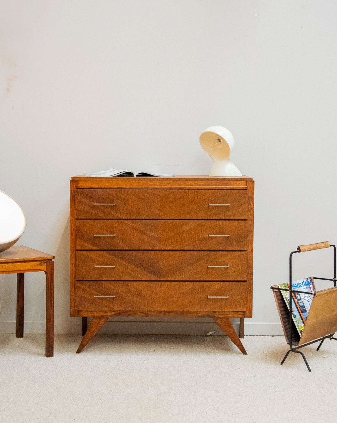 Découvrez cette magnifique commode en chêne foncé des années 50, avec ses élégants pieds compas qui apportent une touche vintage à votre intérieur. Dotée de quatre tiroirs spacieux, elle offre à la fois du style et de la praticité. Entièrement rénovée, cette pièce présente un léger défaut à l'angle arrière droit et des taches d'usage. Son placage en chêne ajoute une chaleur naturelle qui s'harmonise avec tous les styles de décoration. Une véritable pièce de caractère pour votre maison !