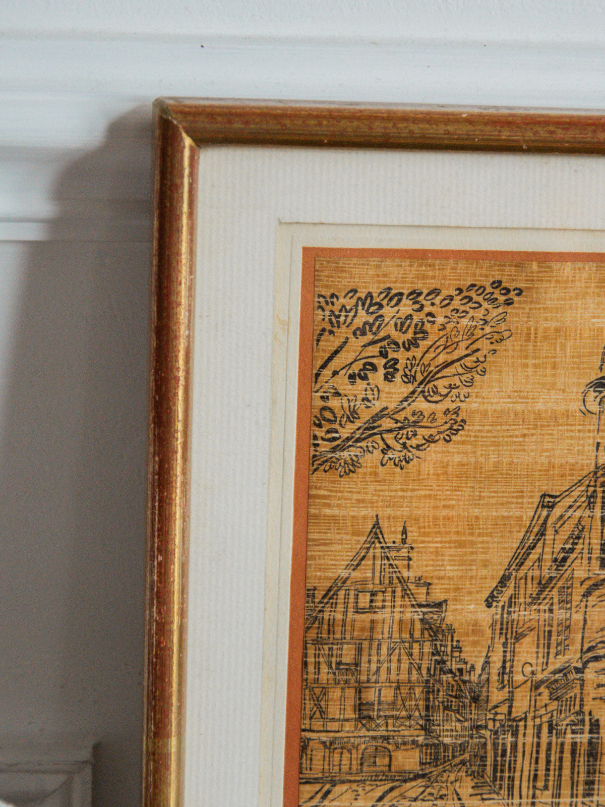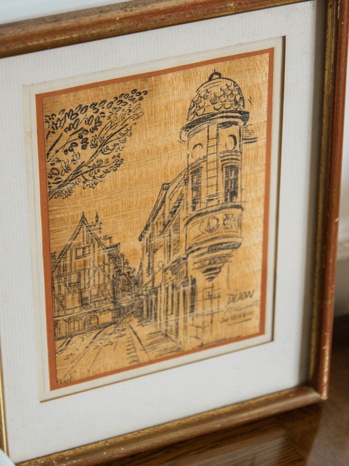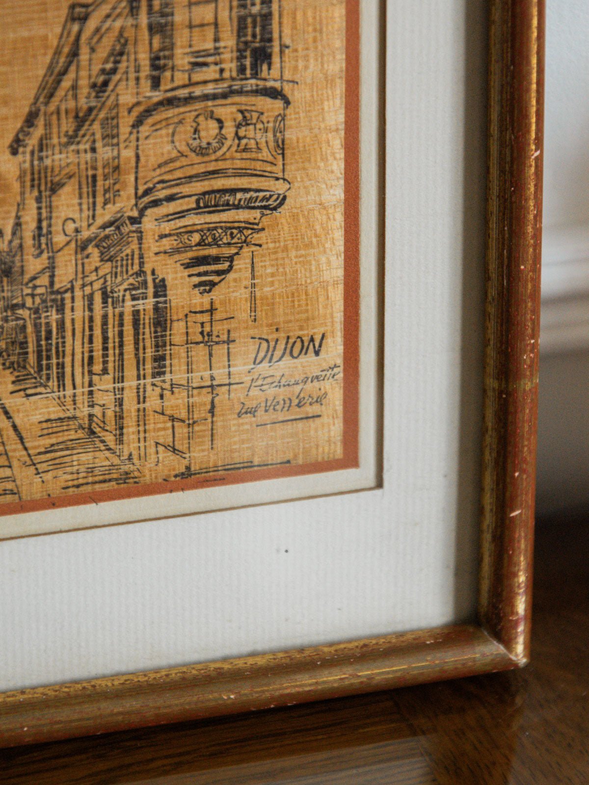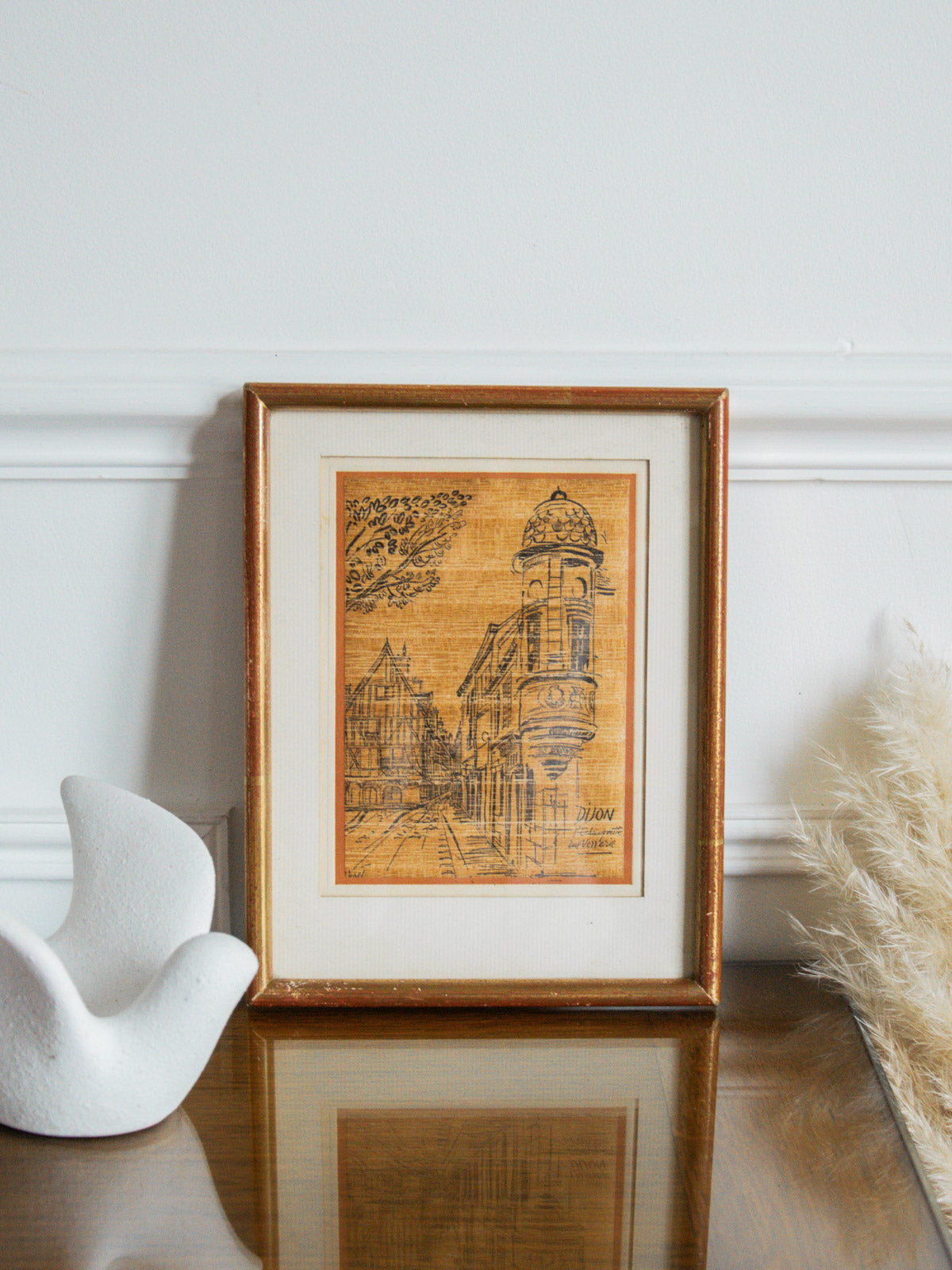 Découvrez la gravure encadrée sur feuille de bois représentant la place de l'Échauguette à Dijon, quelques traces du temps sur le cadre sont à noter. Chaque détail de cette œuvre artistique évoque l'histoire et l'authenticité de ce lieu emblématique. Parfaite pour sublimer votre intérieur, elle apportera une touche d'élégance et de charme à votre décoration. Un incontournable pour les passionnés d'art et d'histoire!