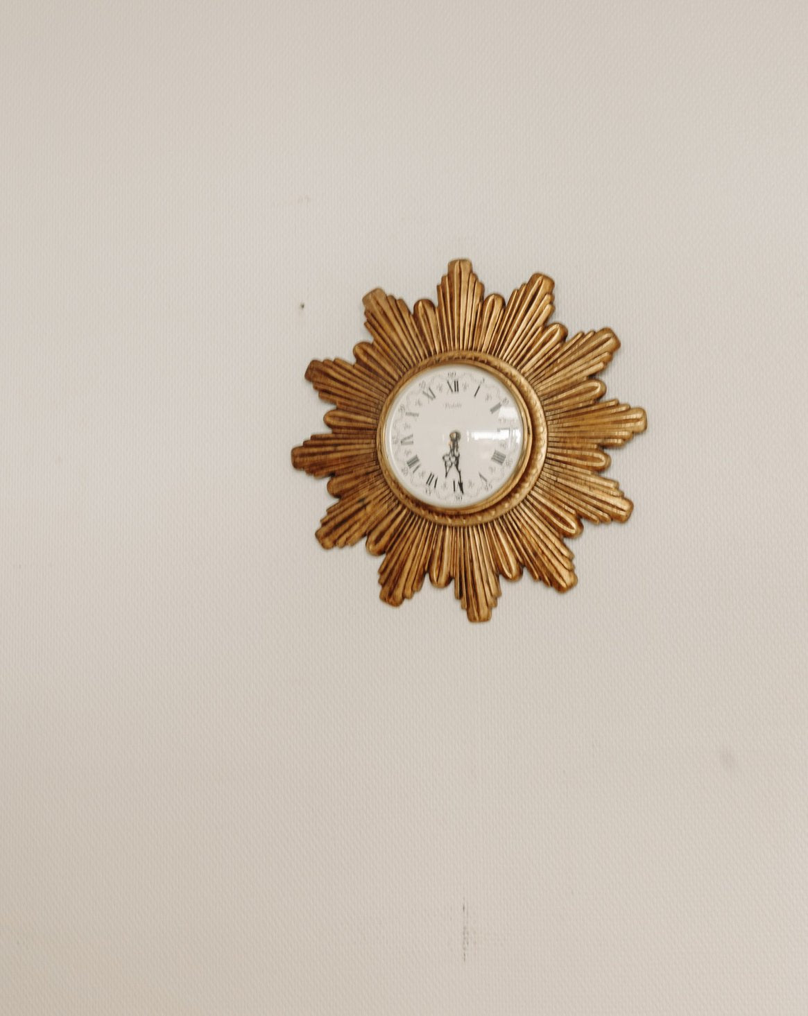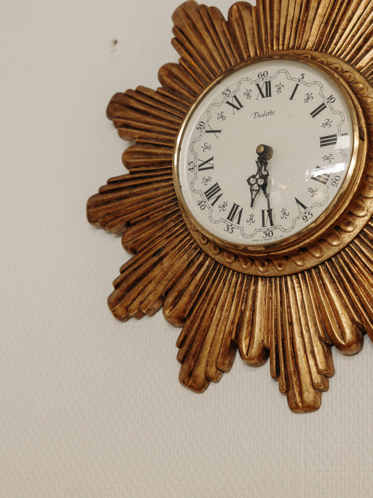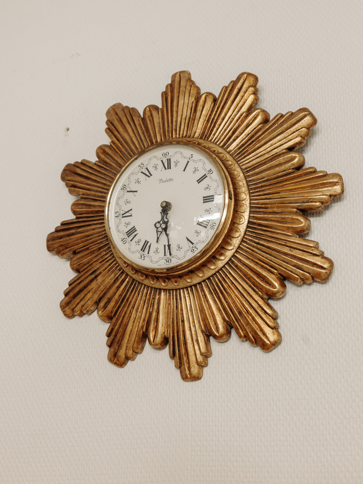 Découvrez l'horloge vedette forme soleil des années 60, une pièce vintage emblématique qui apporte une touche rétro à votre intérieur. Sa silhouette ensoleillée, à la fois élégante et dynamique, saura s'intégrer parfaitement dans tous les styles de décoration. Cette horloge décorative est un véritable clin d'œil à l'esthétique typique de cette époque. Ajoutez une note de charme et de nostalgie à votre espace avec cette pièce unique.