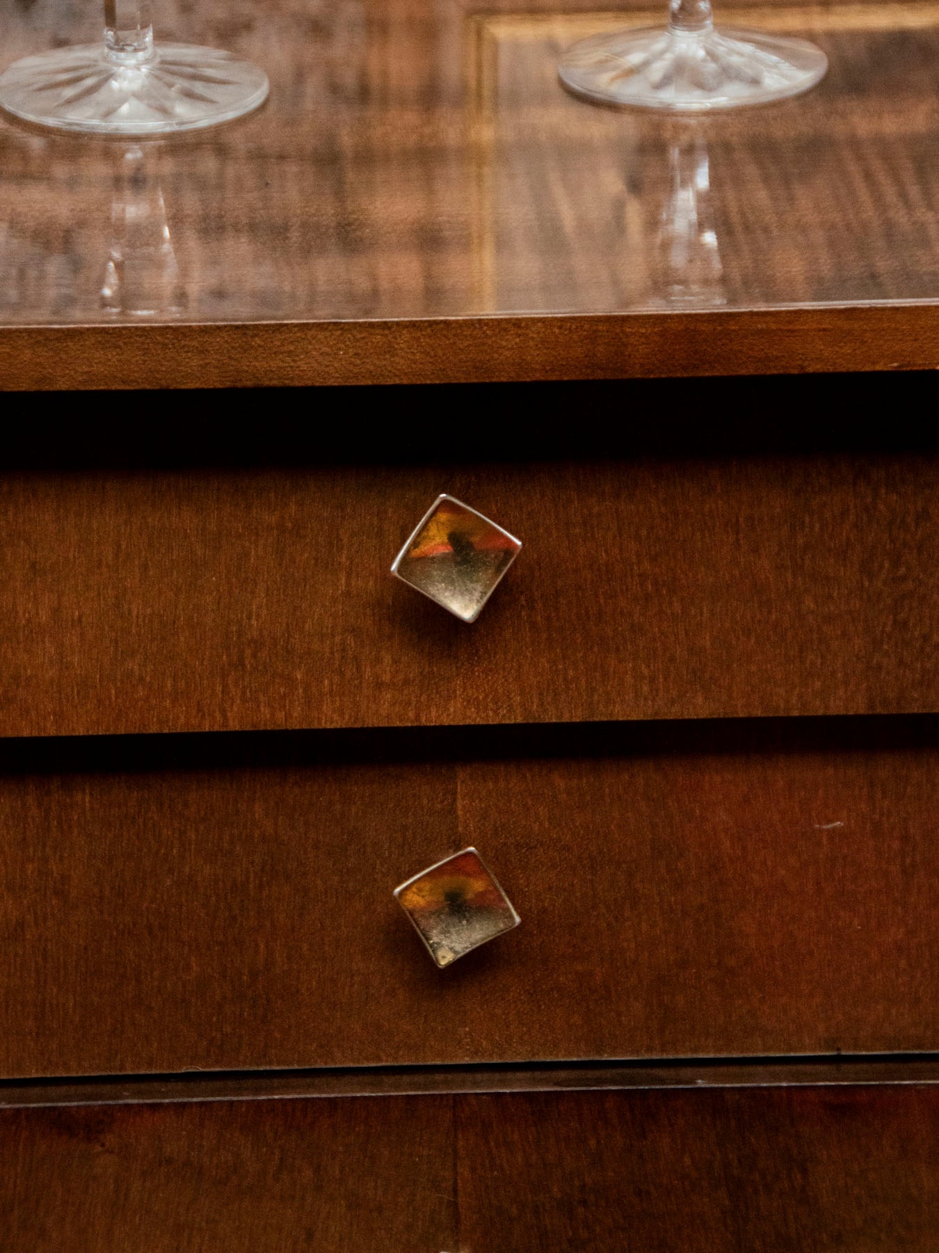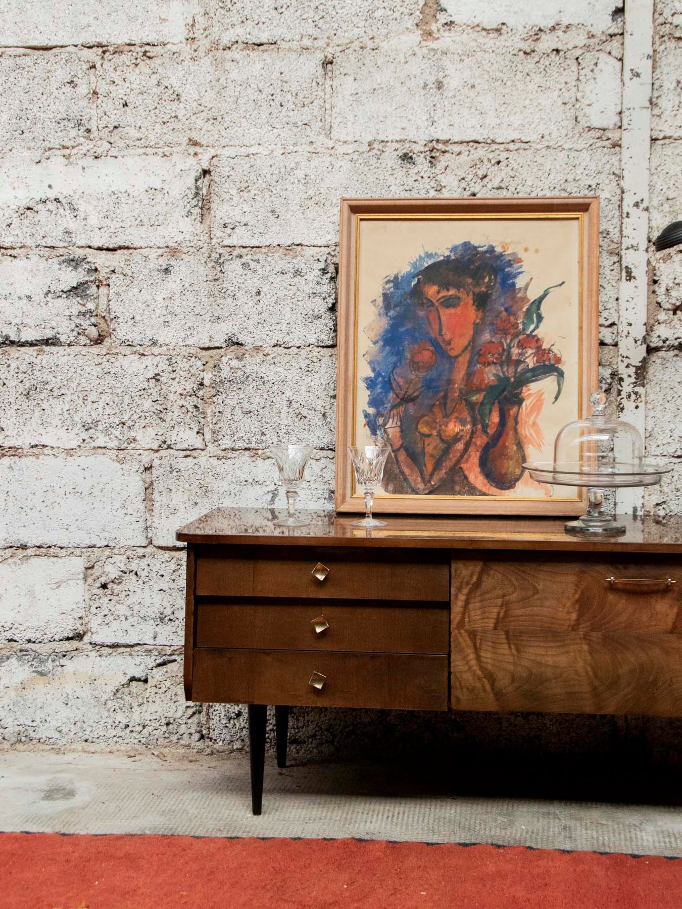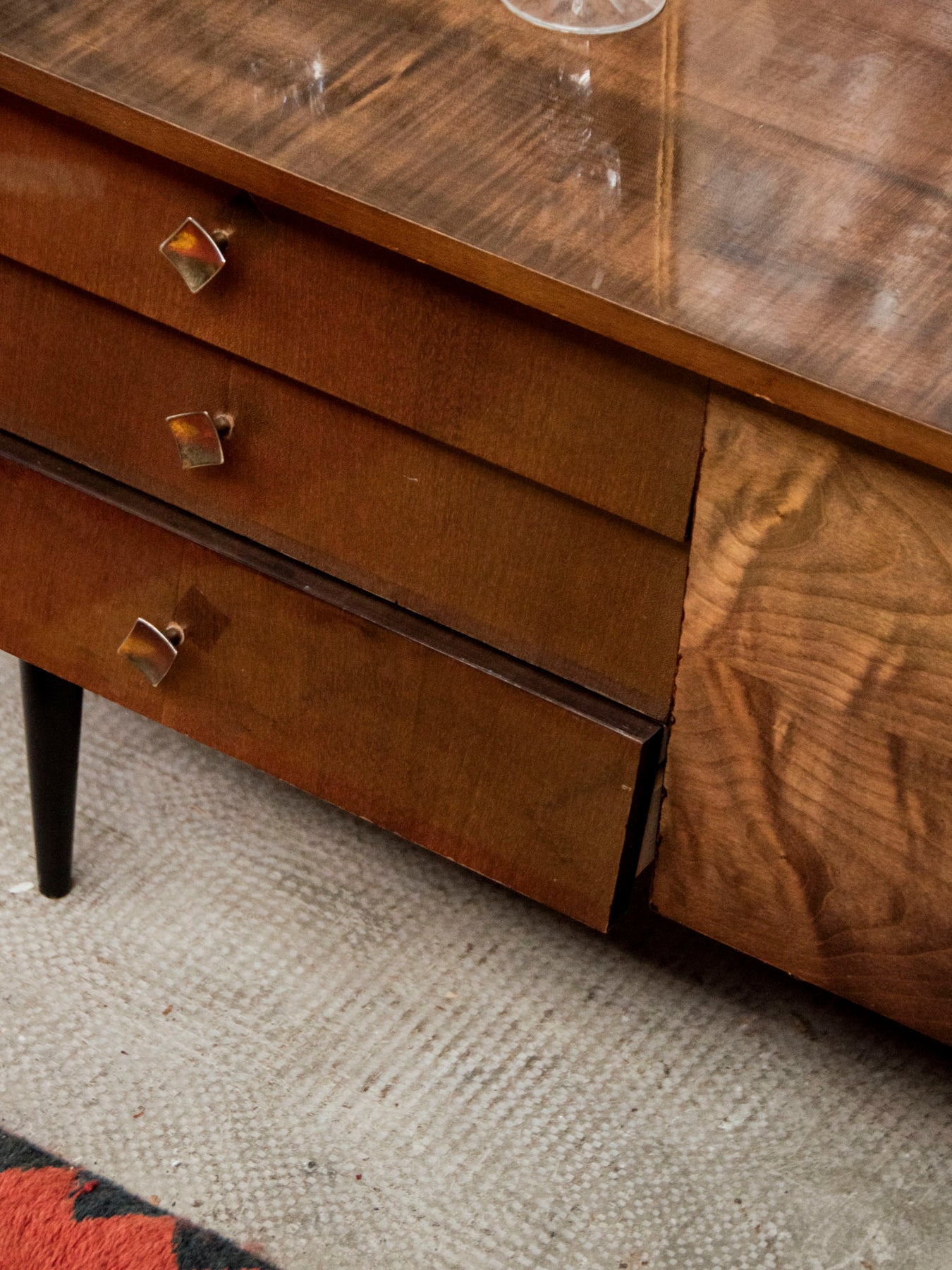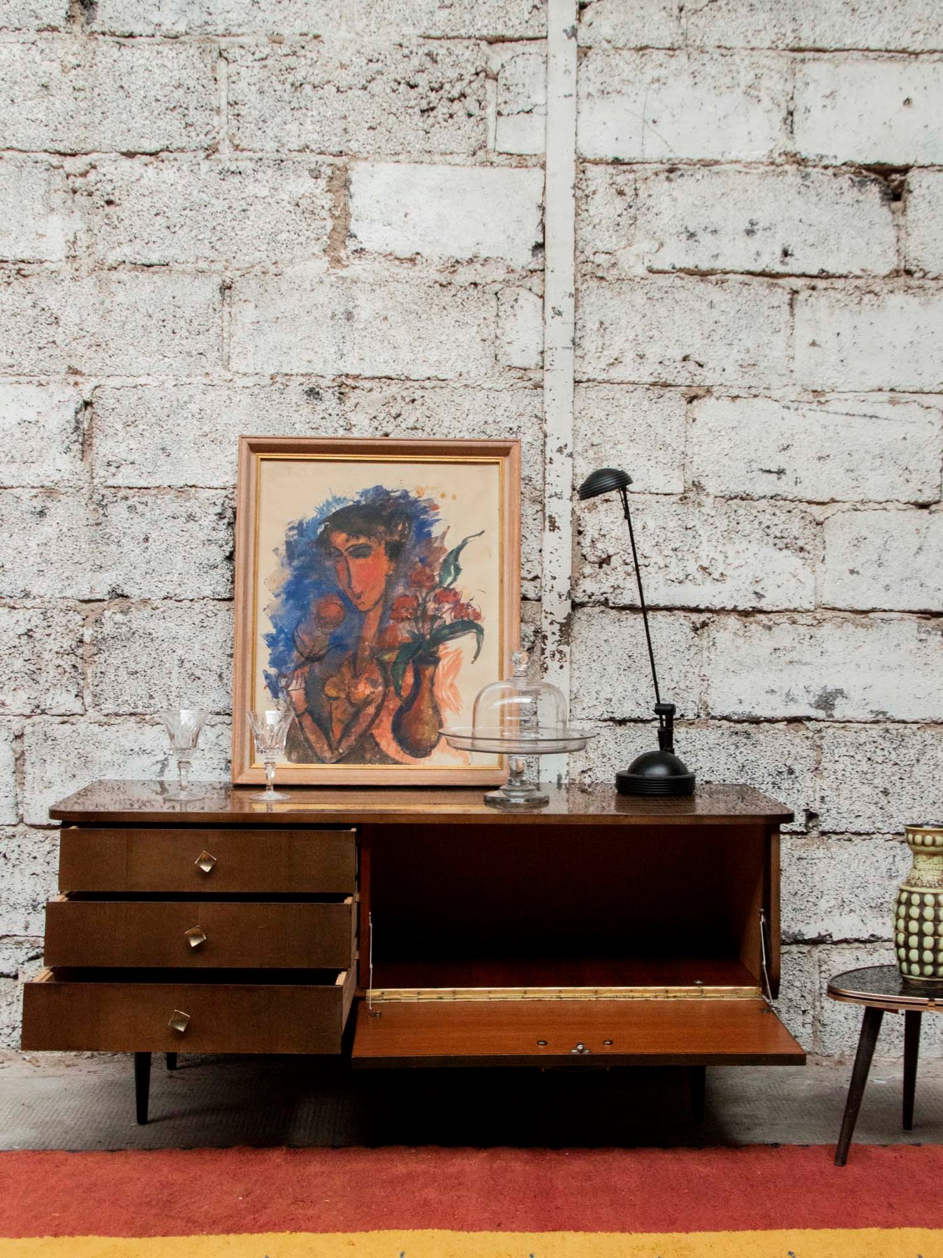 Découvrez notre petite enfilade en bois foncé, un meuble élégant et fonctionnel pour apporter du charme à votre intérieur. Dotée de trois tiroirs spacieux et d'un placard rabattant, elle offre un espace de rangement pratique tout en conservant un design raffiné. Ses petits pieds droits noris ajoutent une touche contemporaine, tandis que les poignées en métal carrées et longues apportent une finition moderne. Un choix parfait pour allier esthétisme et utilité dans votre décoration.