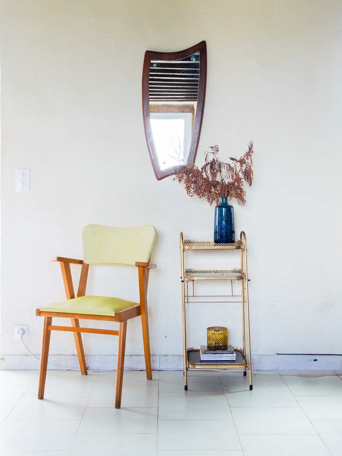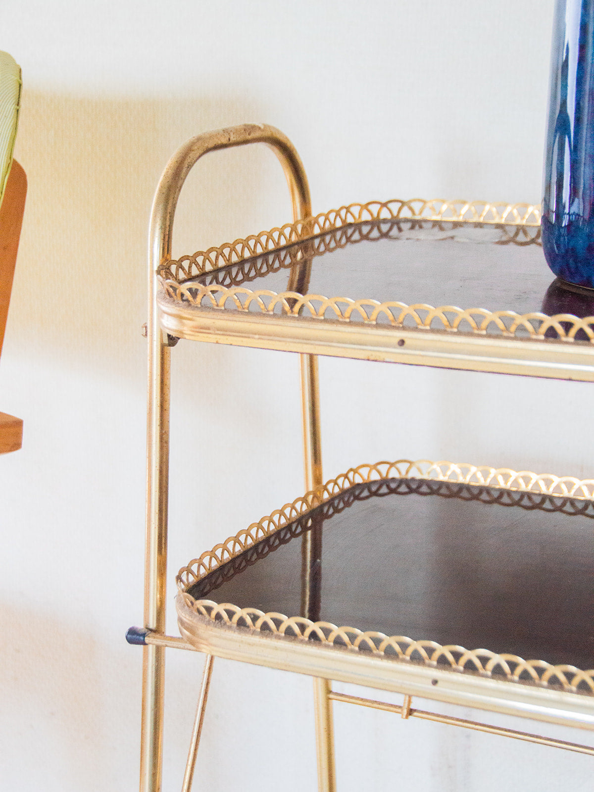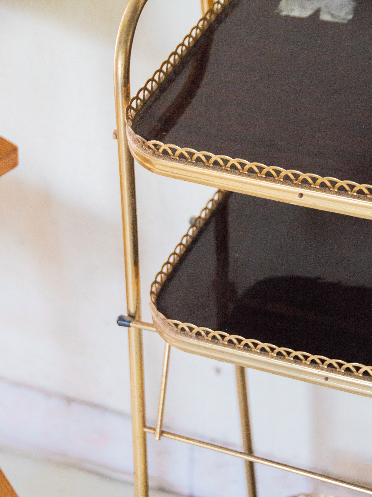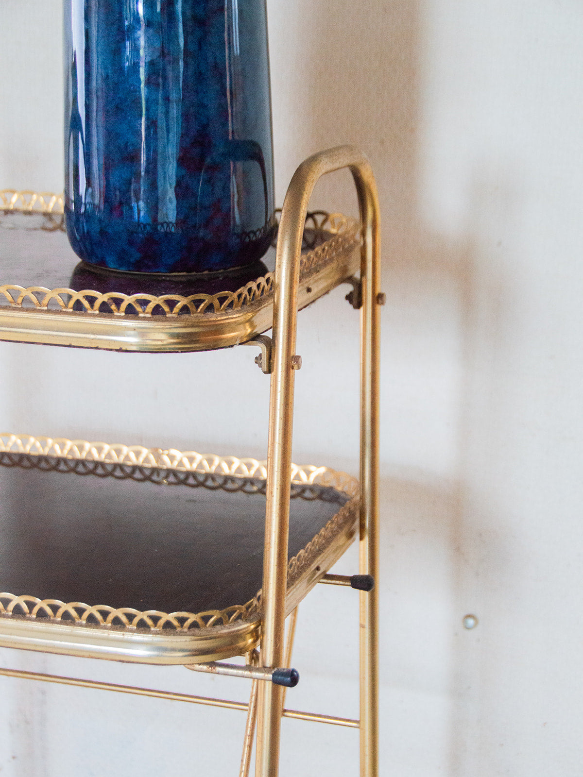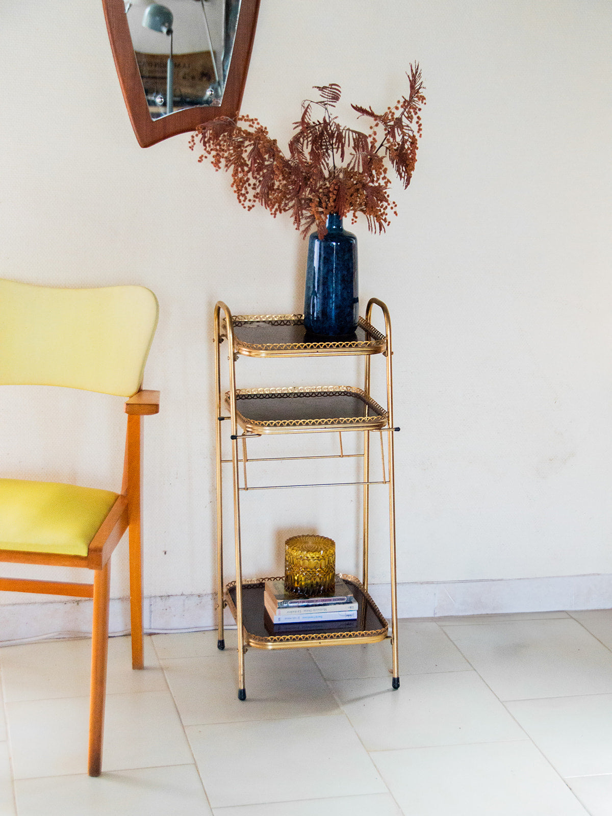 Découvrez cette petite étagère à trois étages, au design élégant et moderne. Sa structure en métal doré apporte une touche de charme à votre intérieur. Parfaite pour exposer vos objets décoratifs, livres ou plantes, elle offre à la fois praticité et style. Compacte, elle s’intègre facilement dans n’importe quelle pièce de la maison. Un meuble à la fois léger et chic pour ajouter du caractère à votre espace ! Une petite vis est manquante sur le pied avant gauche.