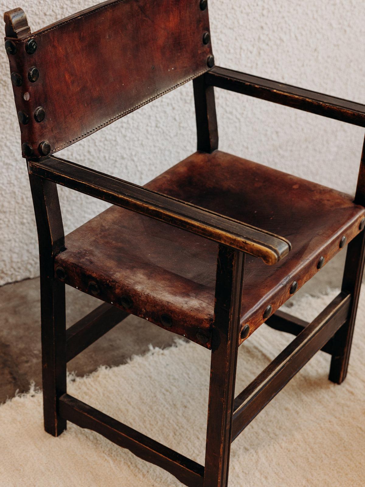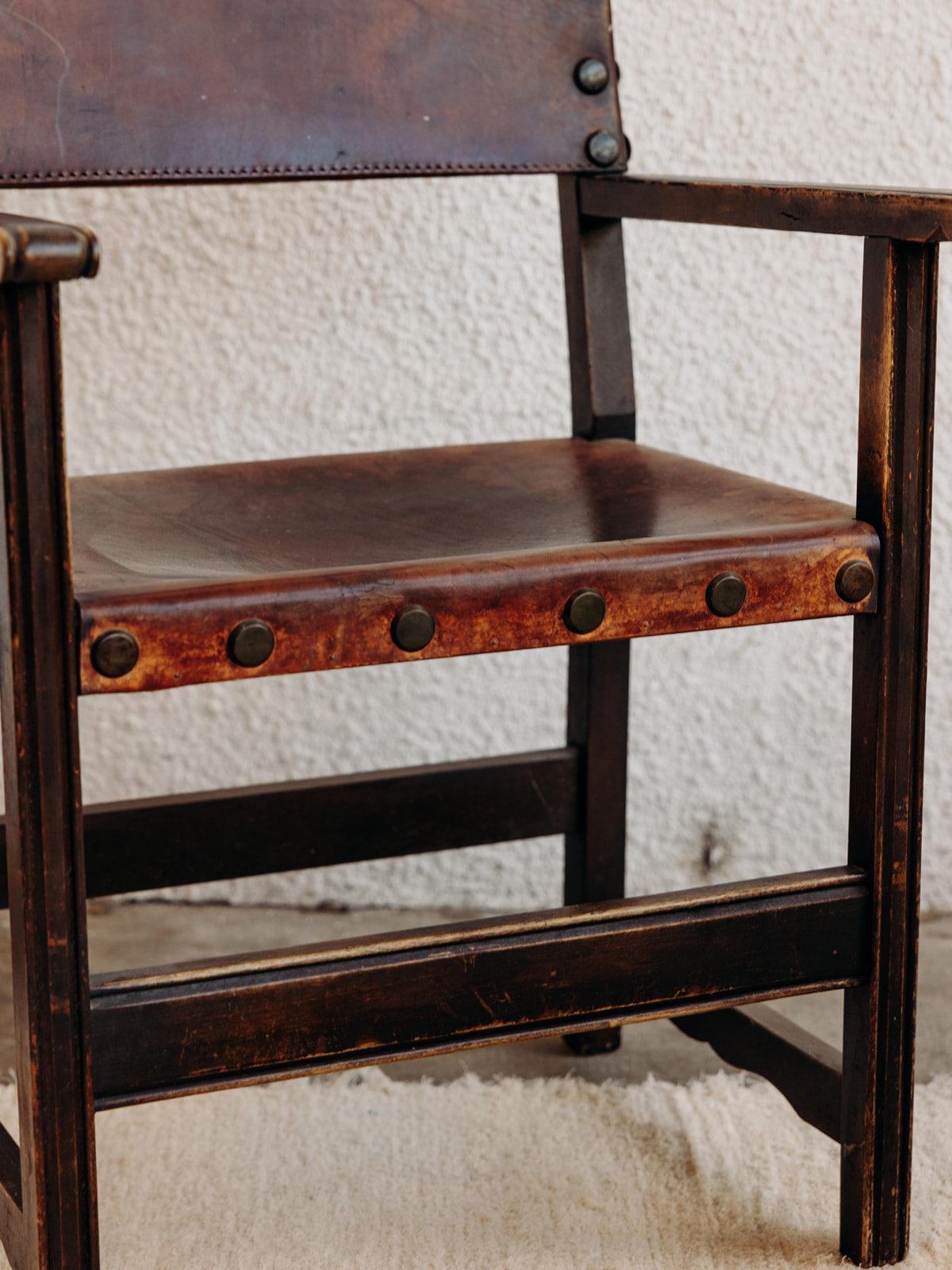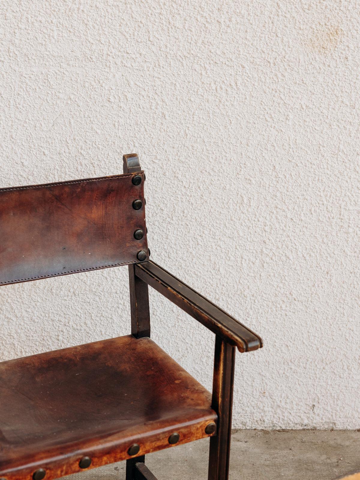 Ce fauteuil espagnol en bois et cuir, orné de clous décoratifs sur les côtés, possède un charme indéniable. Inspirées par le style de Paco Muñoz ou Chapo, il est idéal pour un intérieur au charme authentique ! Son design distinctif et ses finitions soignées apportent un caractère unique, parfait pour une salle à manger, une cuisine ou un bureau.