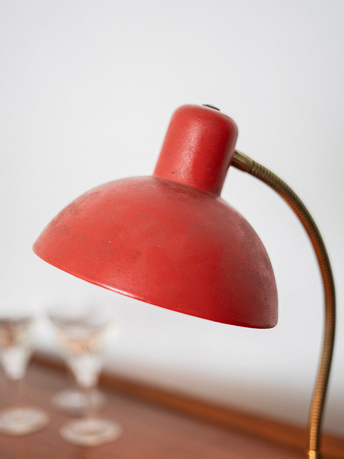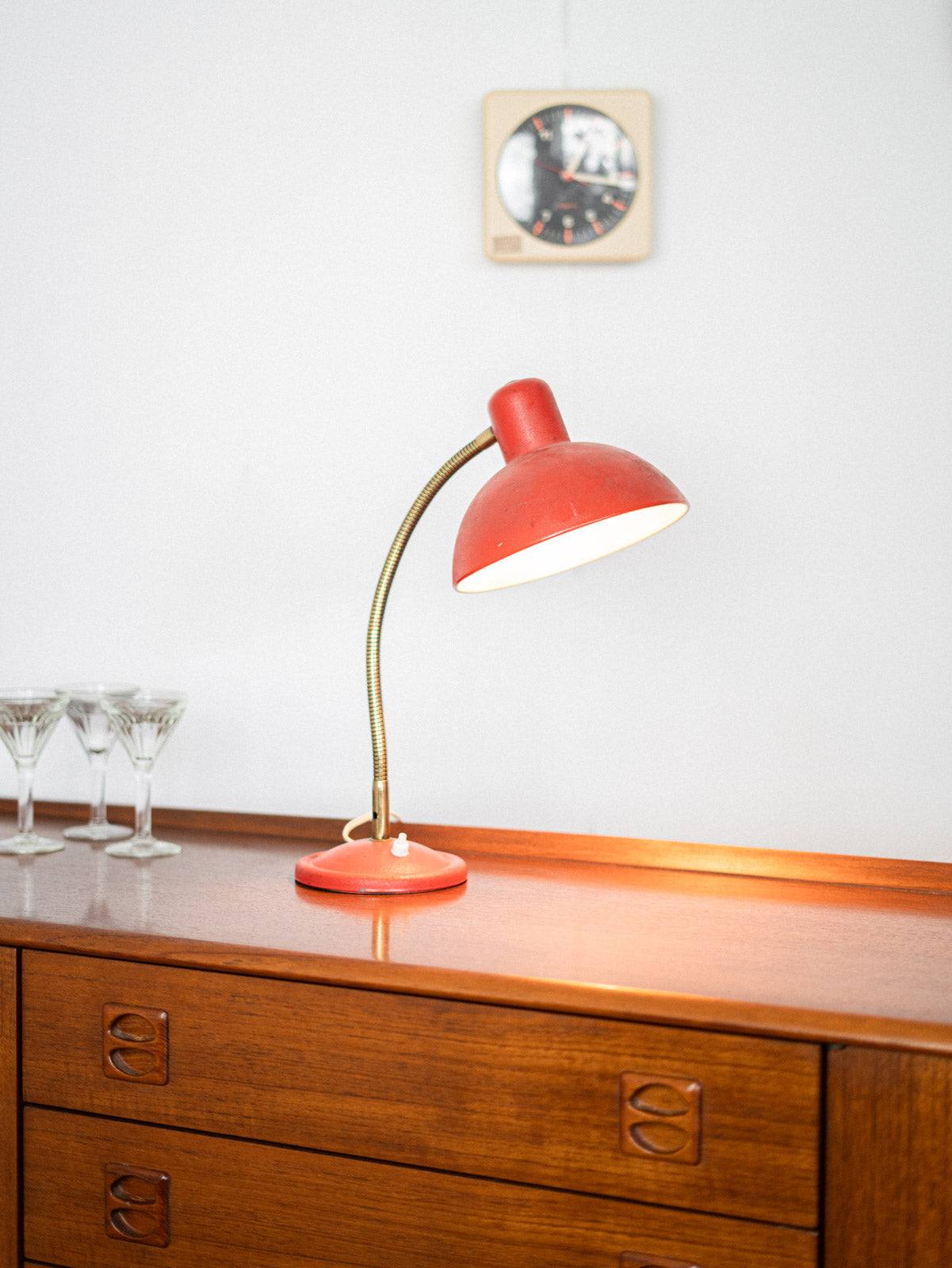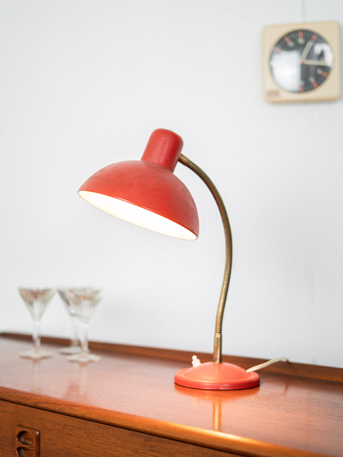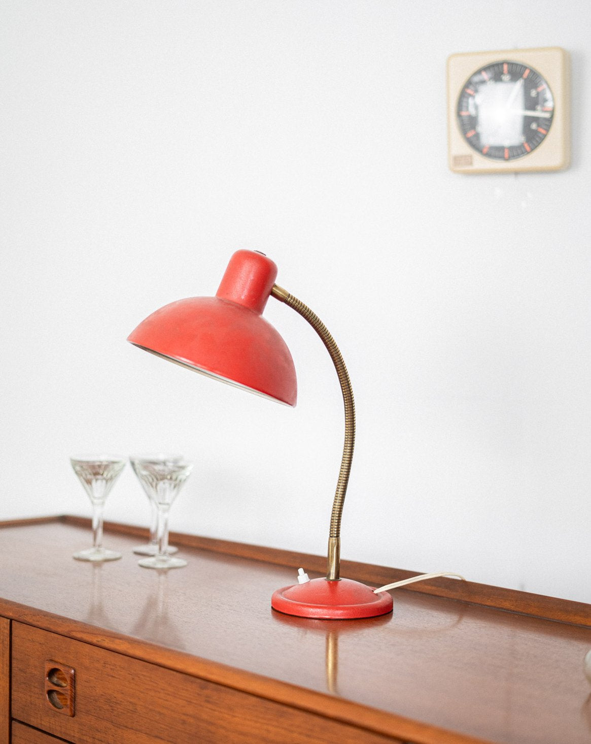 Apportez une touche rétro à votre espace de travail avec notre lampe de bureau vintage en métal rouge. Dotée d'une tige flexible en laiton, elle vous permettra d'ajuster la lumière selon vos besoins tout en ajoutant du caractère à votre décoration. Bien que présentant une légère usure d'usage, cette lampe fonctionne parfaitement avec une ampoule à baïonnette, offrant un éclairage chaleureux et séduisant pour vos heures de créativité. Redécouvrez le charme d'antan tout en profitant d'un éclairage fonctionnel et stylé.