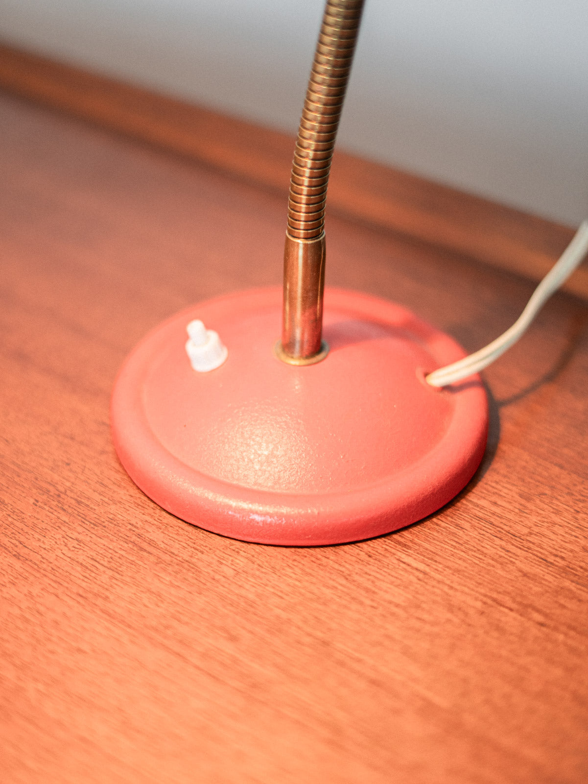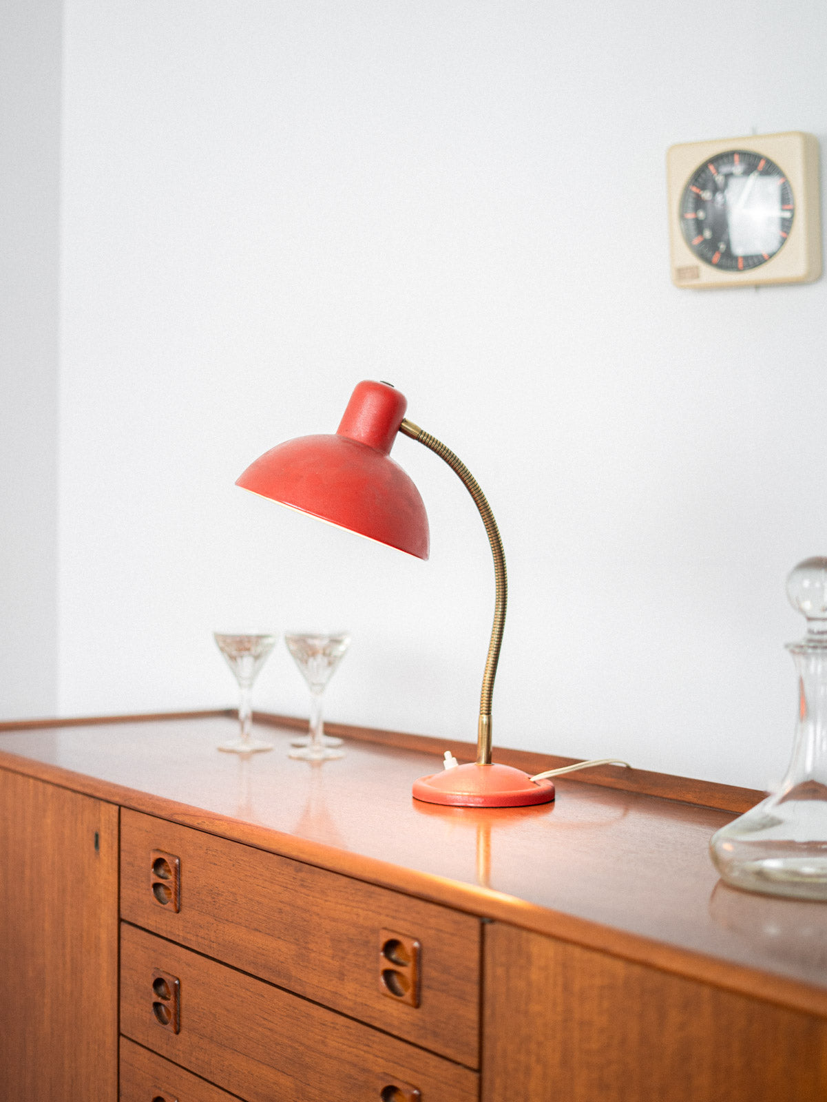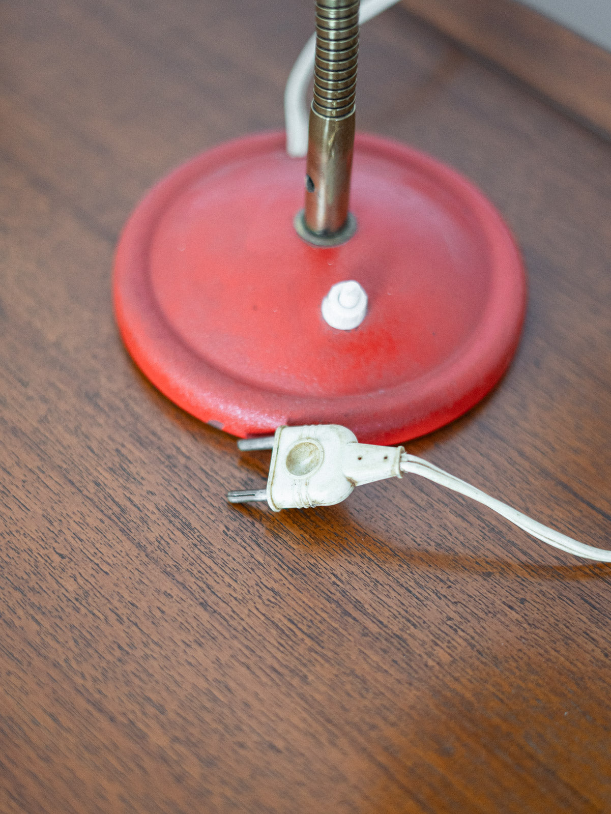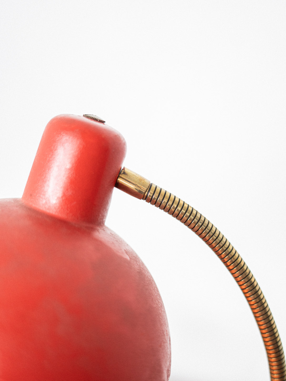 Apportez une touche rétro à votre espace de travail avec notre lampe de bureau vintage en métal rouge. Dotée d'une tige flexible en laiton, elle vous permettra d'ajuster la lumière selon vos besoins tout en ajoutant du caractère à votre décoration. Bien que présentant une légère usure d'usage, cette lampe fonctionne parfaitement avec une ampoule à baïonnette, offrant un éclairage chaleureux et séduisant pour vos heures de créativité. Redécouvrez le charme d'antan tout en profitant d'un éclairage fonctionnel et stylé.