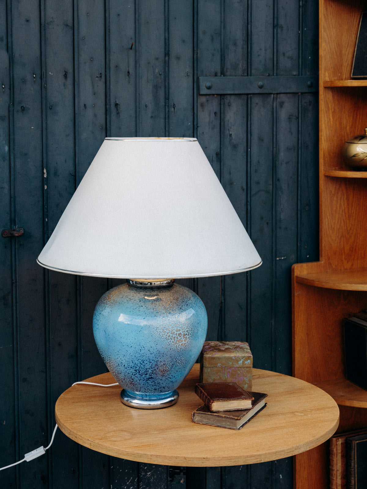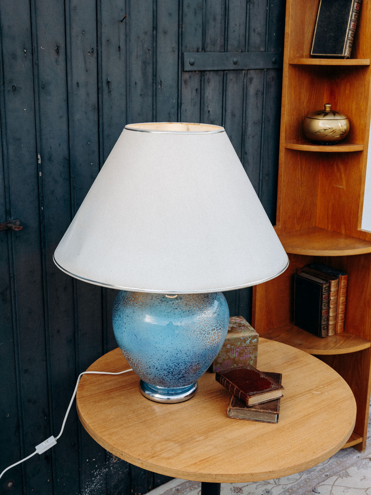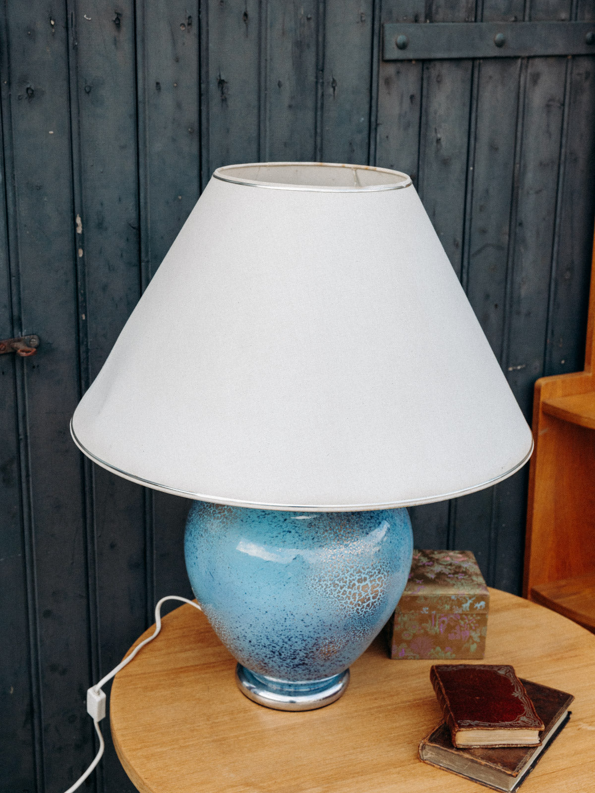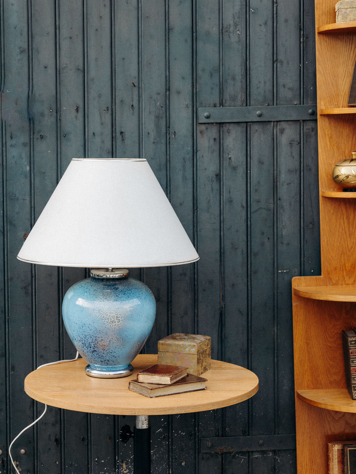 Découvrez cette magnifique lampe à poser bleue effet craquelé argenté, signée Louis Drimmer. Son pied en faïence apporte une touche d’élégance, tandis que l'abat-jour, bien qu'avec quelques marques du temps, ajoute du caractère et une patine unique à l'ensemble. Cet éclairage artistique saura illuminer vos espaces avec style et charme, faisant de chaque pièce un véritable endroit de vie.