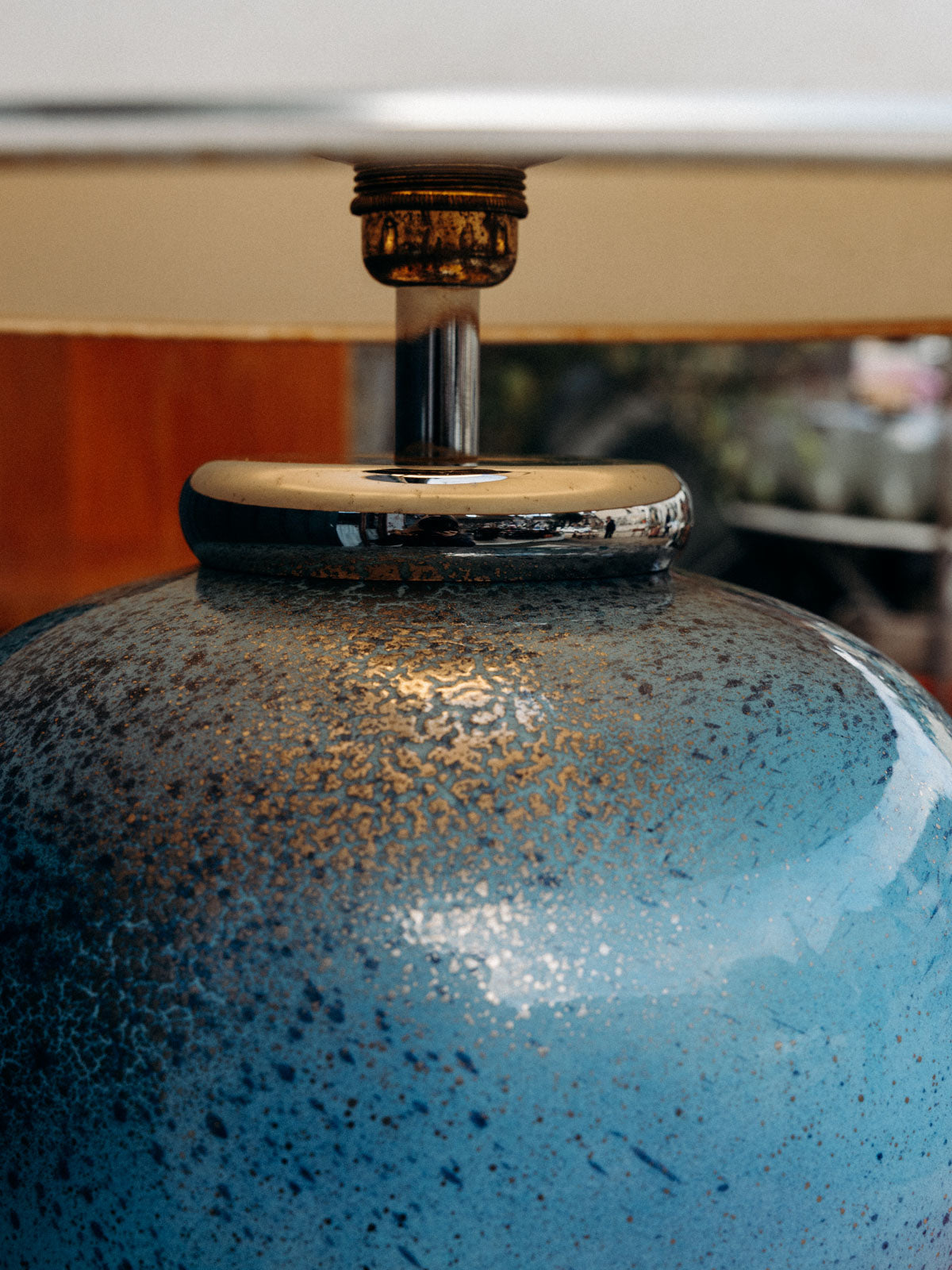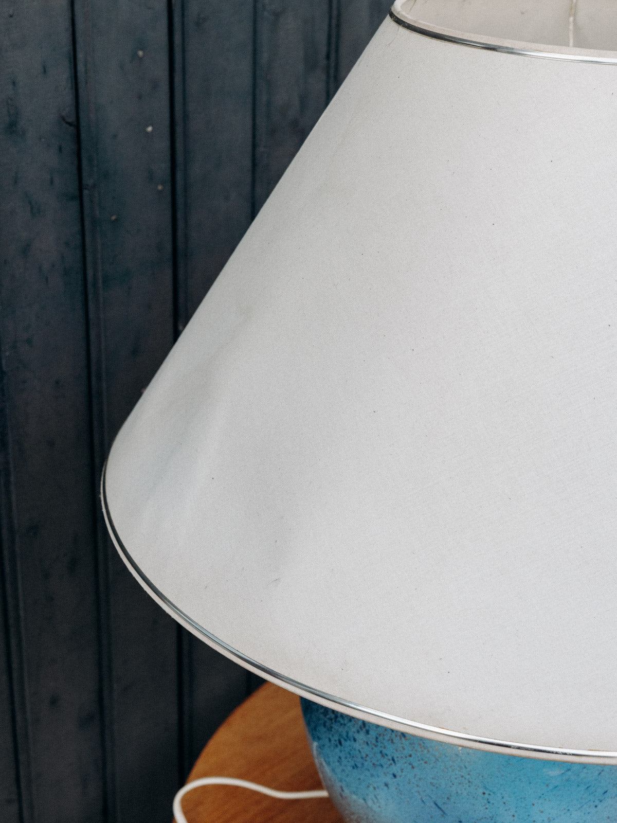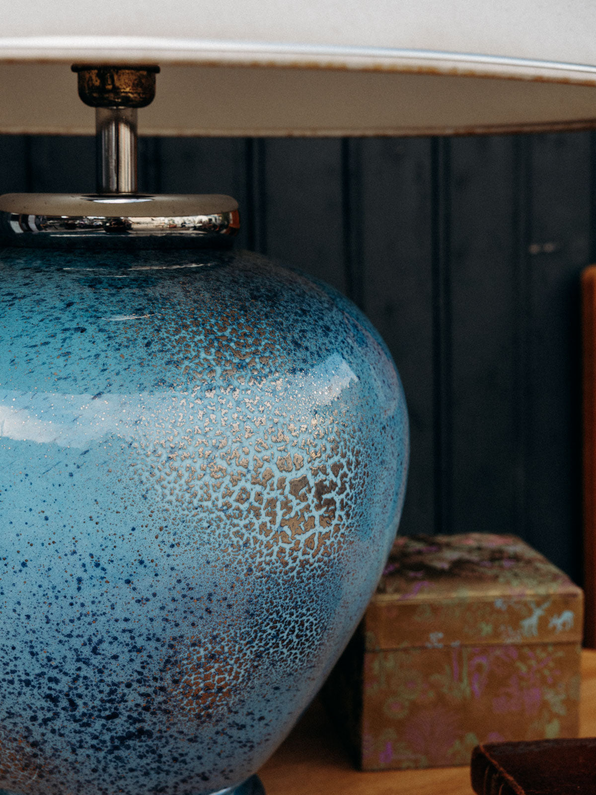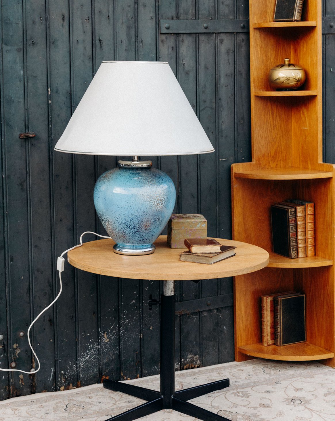 Découvrez cette magnifique lampe à poser bleue effet craquelé argenté, signée Louis Drimmer. Son pied en faïence apporte une touche d’élégance, tandis que l'abat-jour, bien qu'avec quelques marques du temps, ajoute du caractère et une patine unique à l'ensemble. Cet éclairage artistique saura illuminer vos espaces avec style et charme, faisant de chaque pièce un véritable endroit de vie.