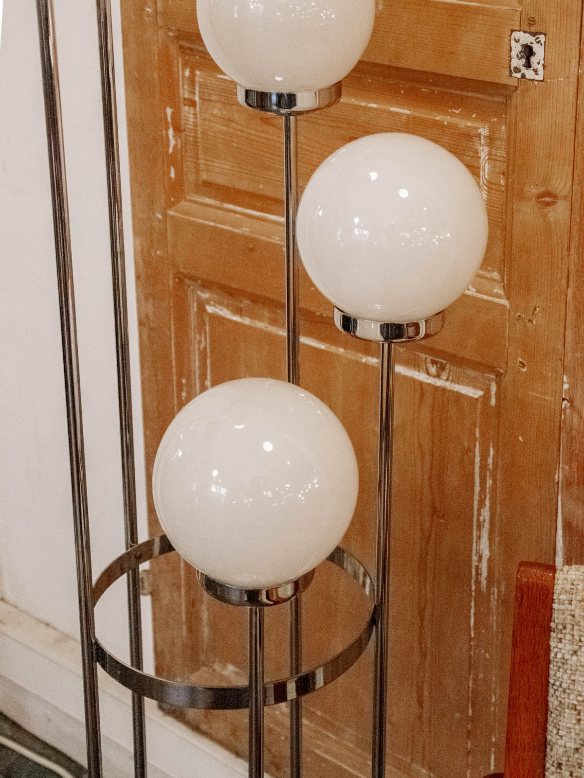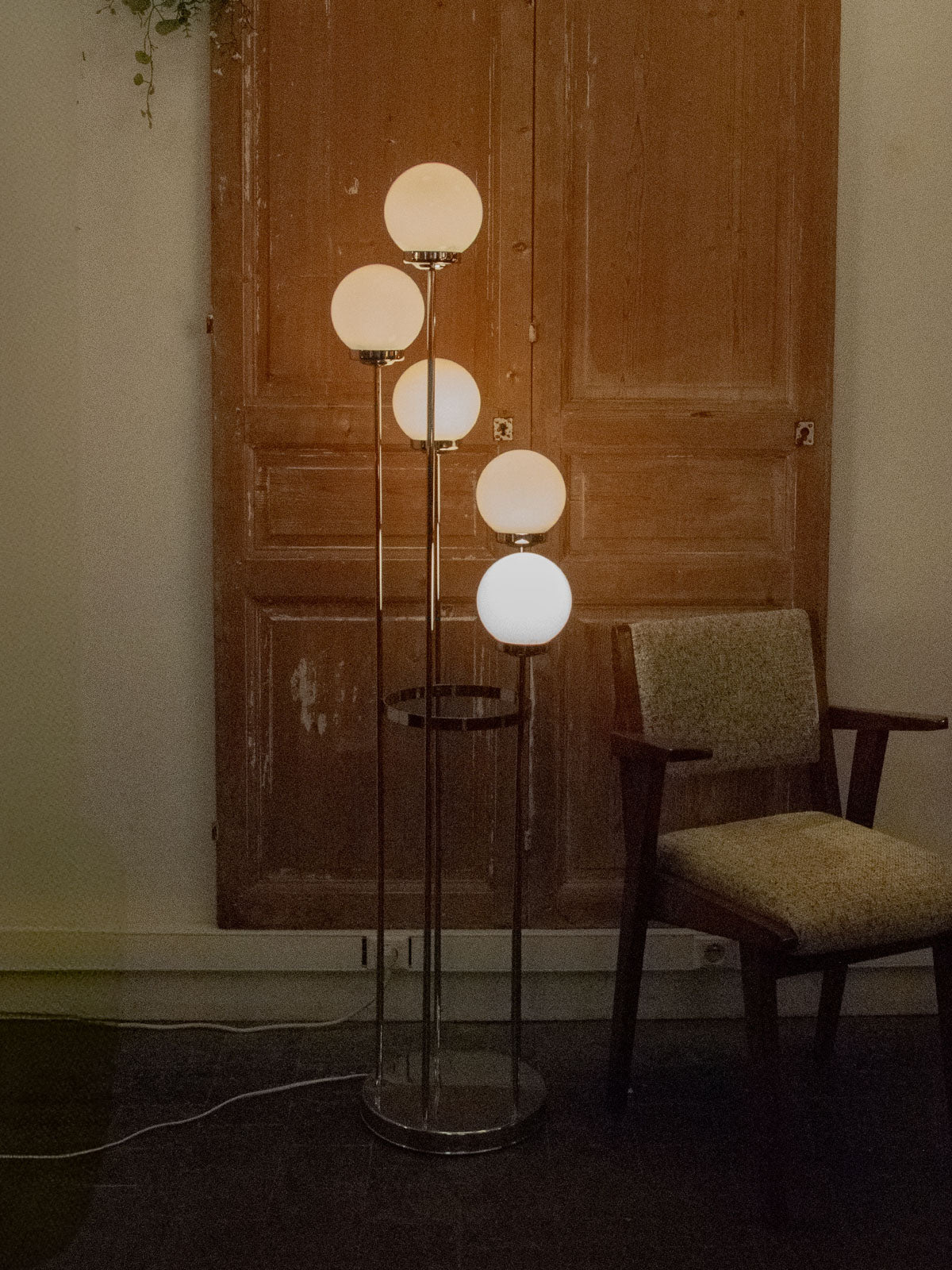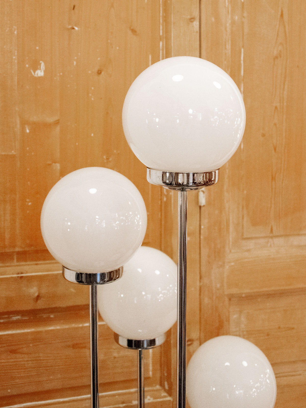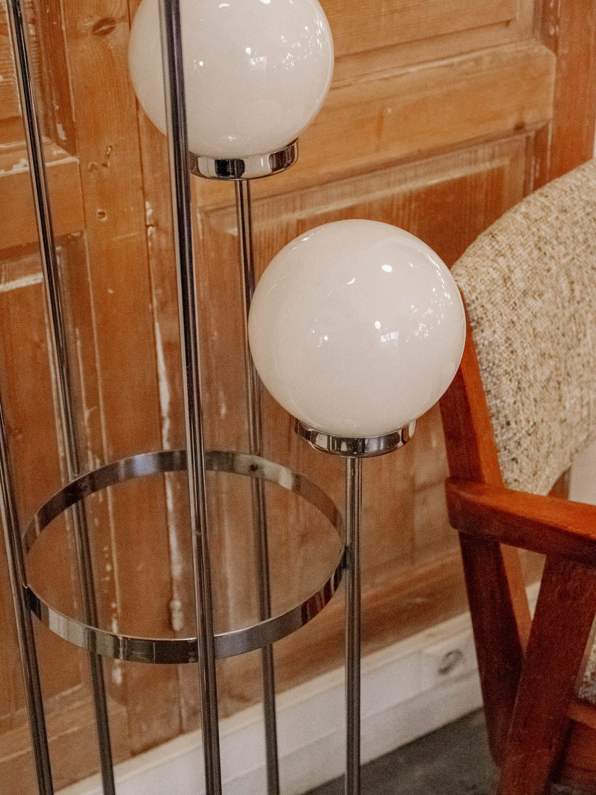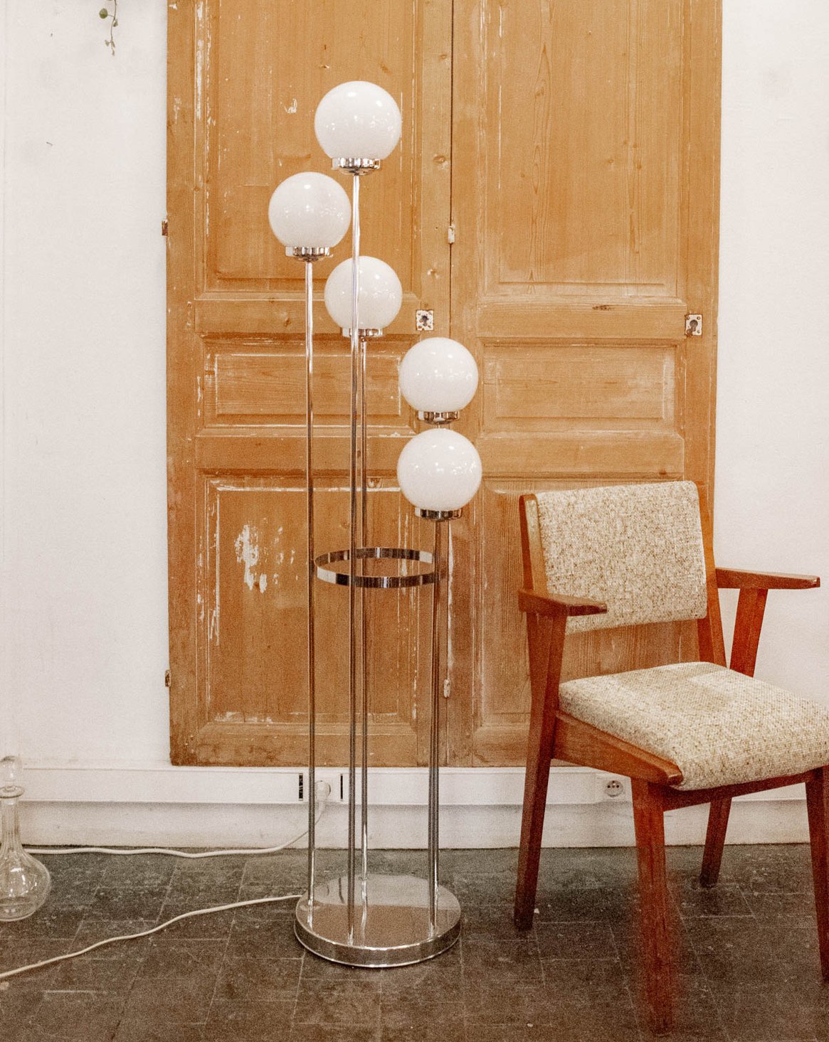 Apportez une touche d'éclat à votre intérieur avec notre lampadaire chromé doté de 5 globes blancs ronds. Conçu en métal brillant, ce luminaire élégant diffuse une lumière douce et chaleureuse, idéale pour créer une atmosphère accueillante dans votre salon ou salle à manger. Son design moderne et épuré s'intègre parfaitement dans tous les styles de décoration, tout en ajoutant une note de sophistication à votre espace. Faites de ce lampadaire le point focal de votre pièce tout en profitant d'un éclairage optimal.