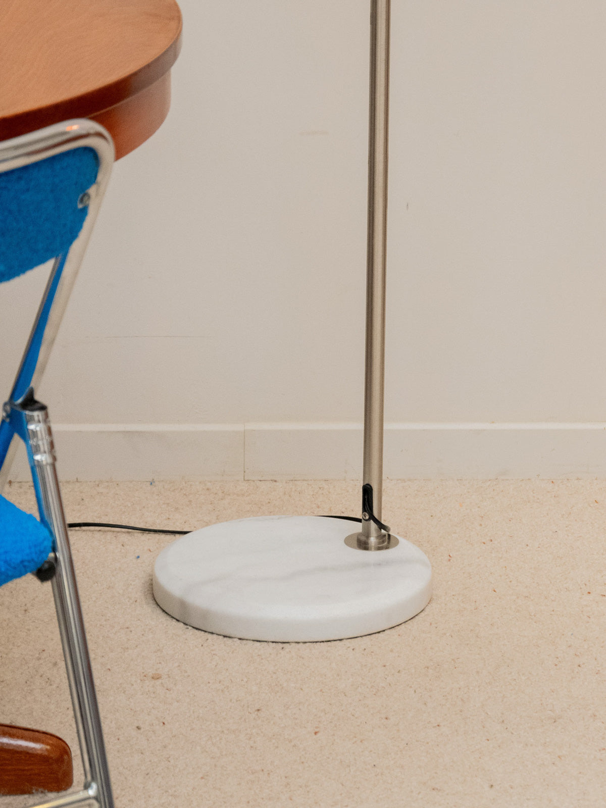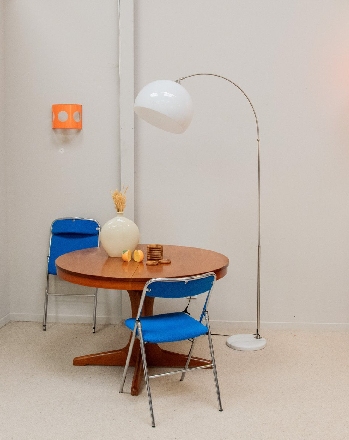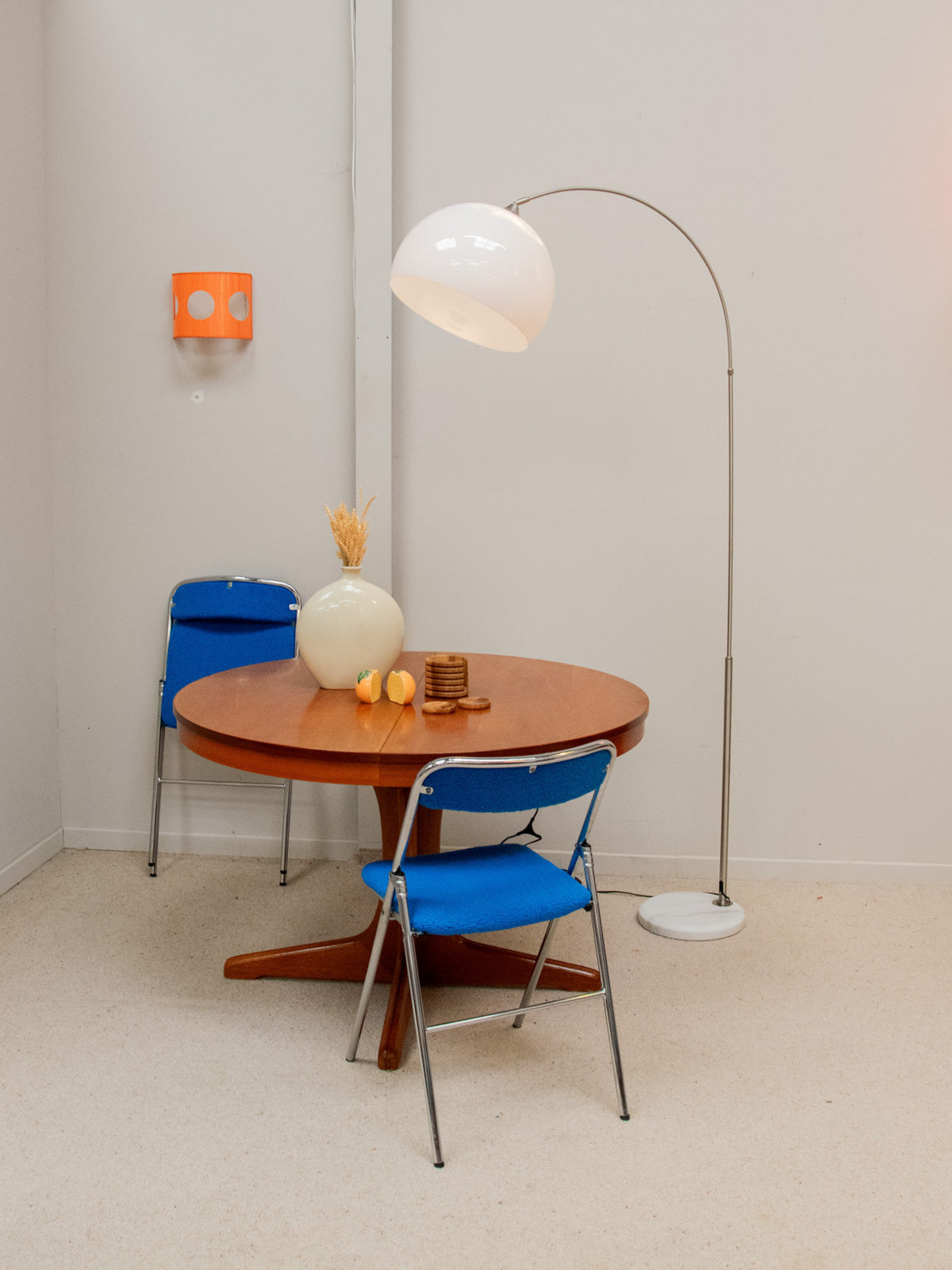 Apportez une touche rétro à votre intérieur avec ce lampadaire arrondi en globe plexi thermoformé blanc, alliant élégance et fonctionnalité. Son pied en métal brossé et sa base en marbre garantissent une stabilité optimale tout en ajoutant du caractère à votre décoration. Remis à neuf, son système électrique est doté d'un variateur d'intensité, vous permettant de créer l'ambiance parfaite pour chaque instant. Un véritable clin d'œil aux années 70, ce lampadaire saura séduire les amateurs de design vintage. Quelques usures visibles.