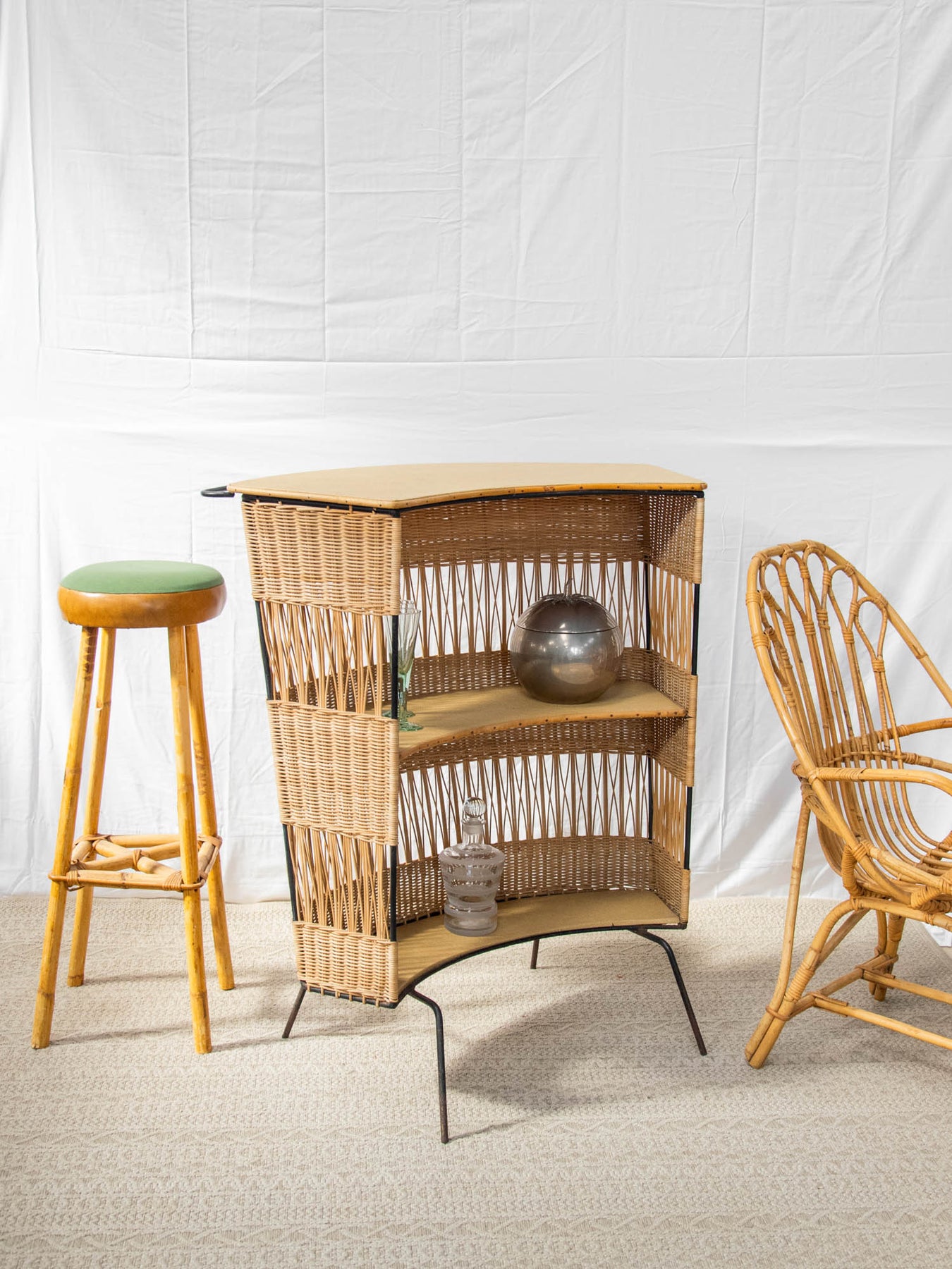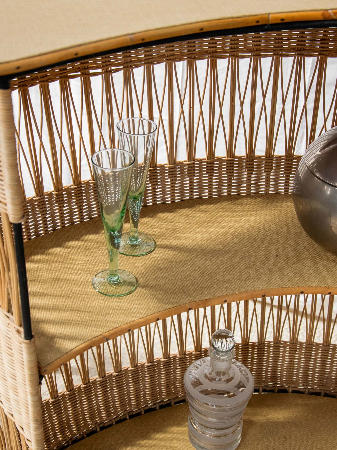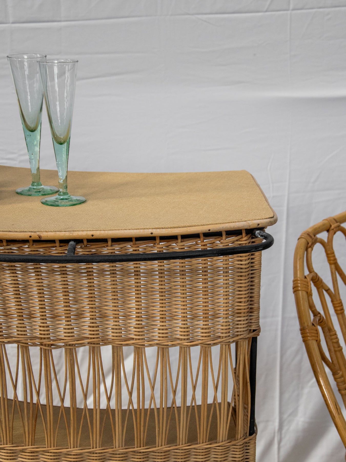 Découvrez ce bar en osier au design moderne, doté d'une élégante structure en métal noir fin. Ses deux espaces de rangement pratiques à l'intérieur vous permettent d'organiser vos bouteilles et accessoires avec style. Les grandes niches en métal, volontairement légèrement usées, ajoutent un caractère unique à ce mobilier, mêlant esthétique et fonctionnalité pour un coin bar chic et convivial. Transformez votre intérieur avec cette pièce au charme intemporel.