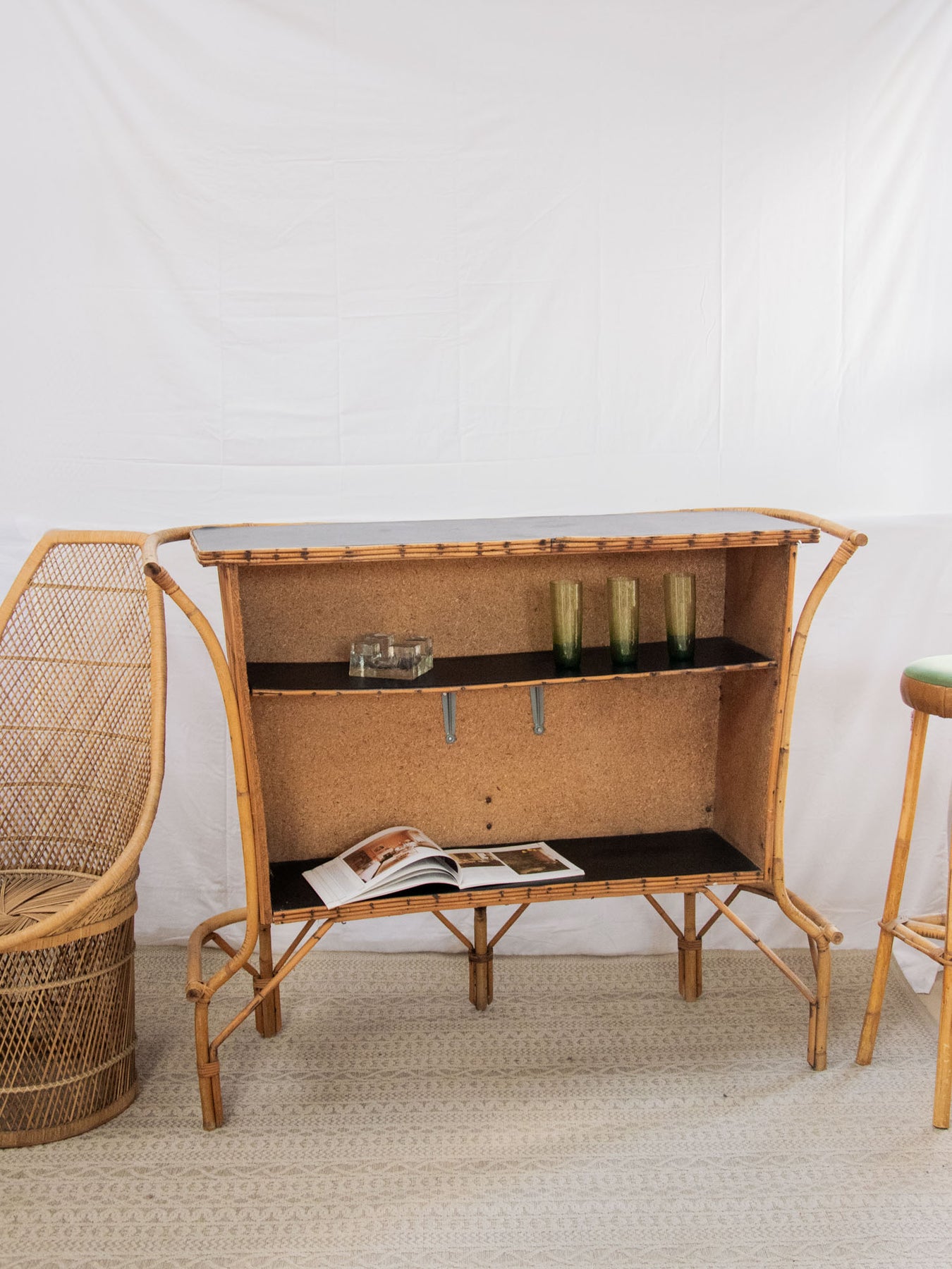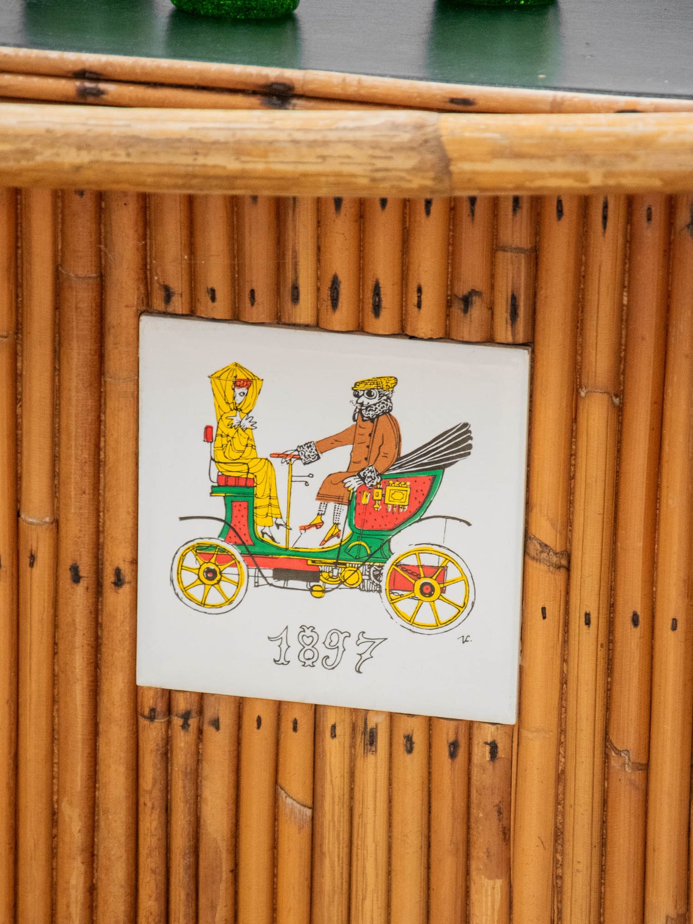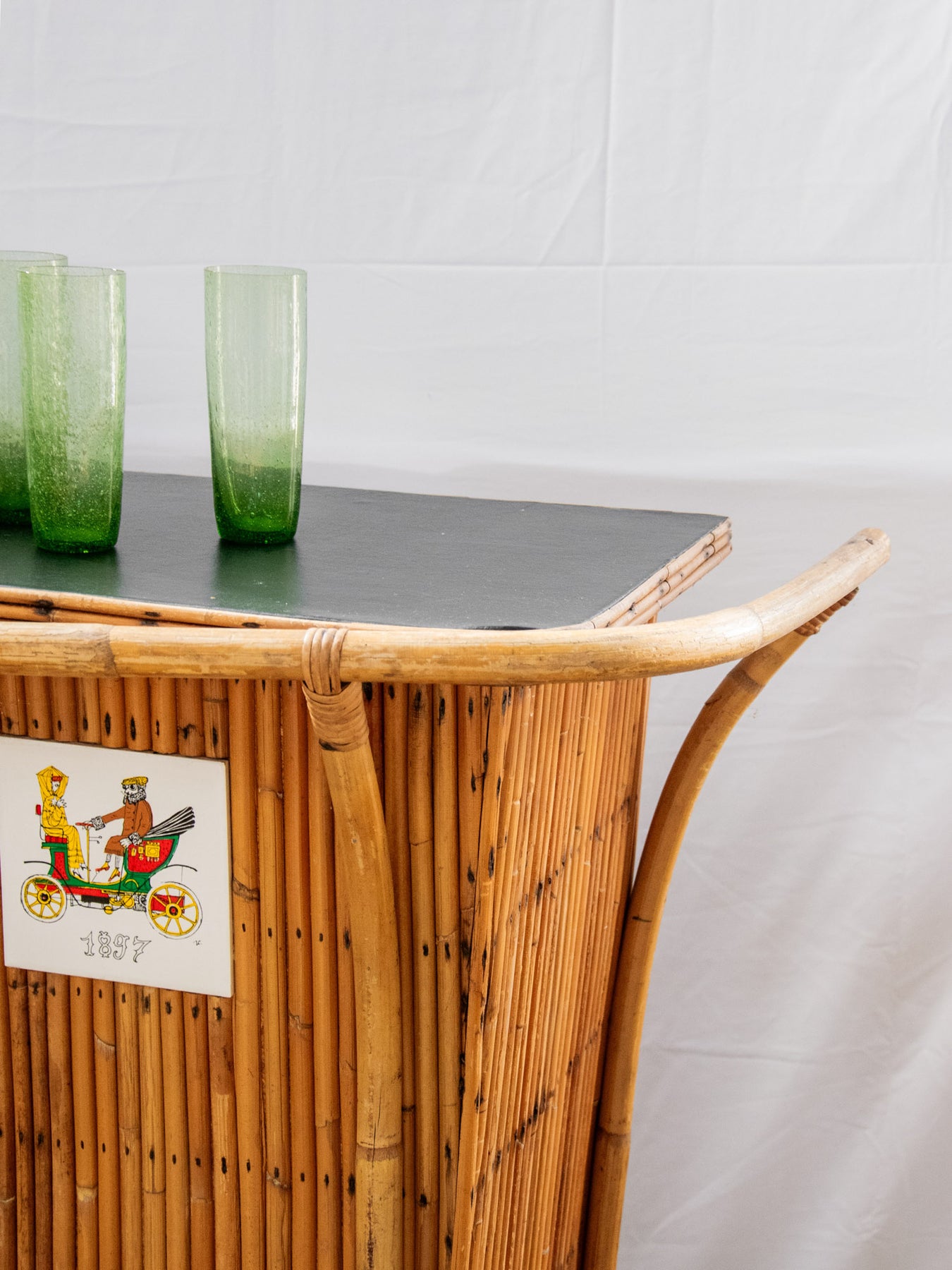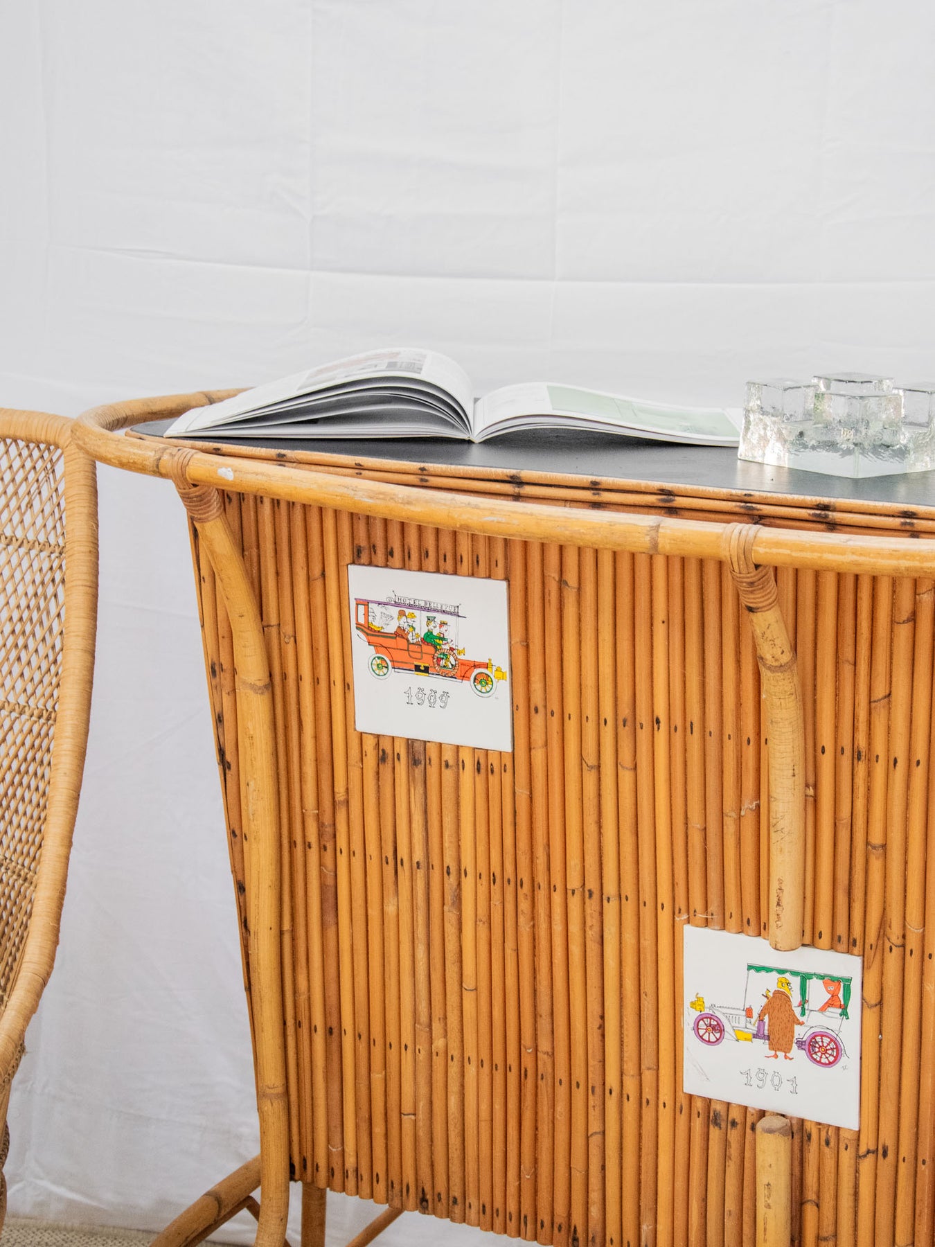 Découvrez notre élégant bar en rotin, alliant modernité et charme intemporel. Avec ses pieds fins et son plateau noir, il s'intègre parfaitement dans tout type d'intérieur. Ce meuble pratique offre deux espaces de rangement à l'intérieur, dotés de grandes niches pour accueillir vos bouteilles et accessoires. La touche finale est apportée par ses trois carreaux de faïence blancs à l'avant, ornés de délicats dessins peints, ajoutant une note artistique à votre espace. Un choix idéal pour les amateurs de décoration raffinée !