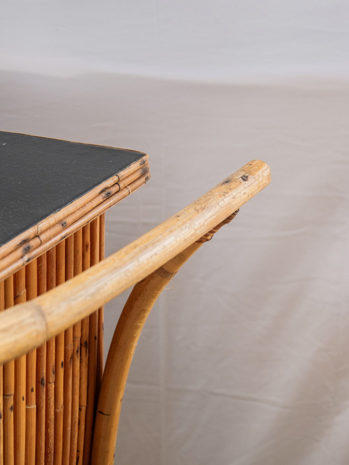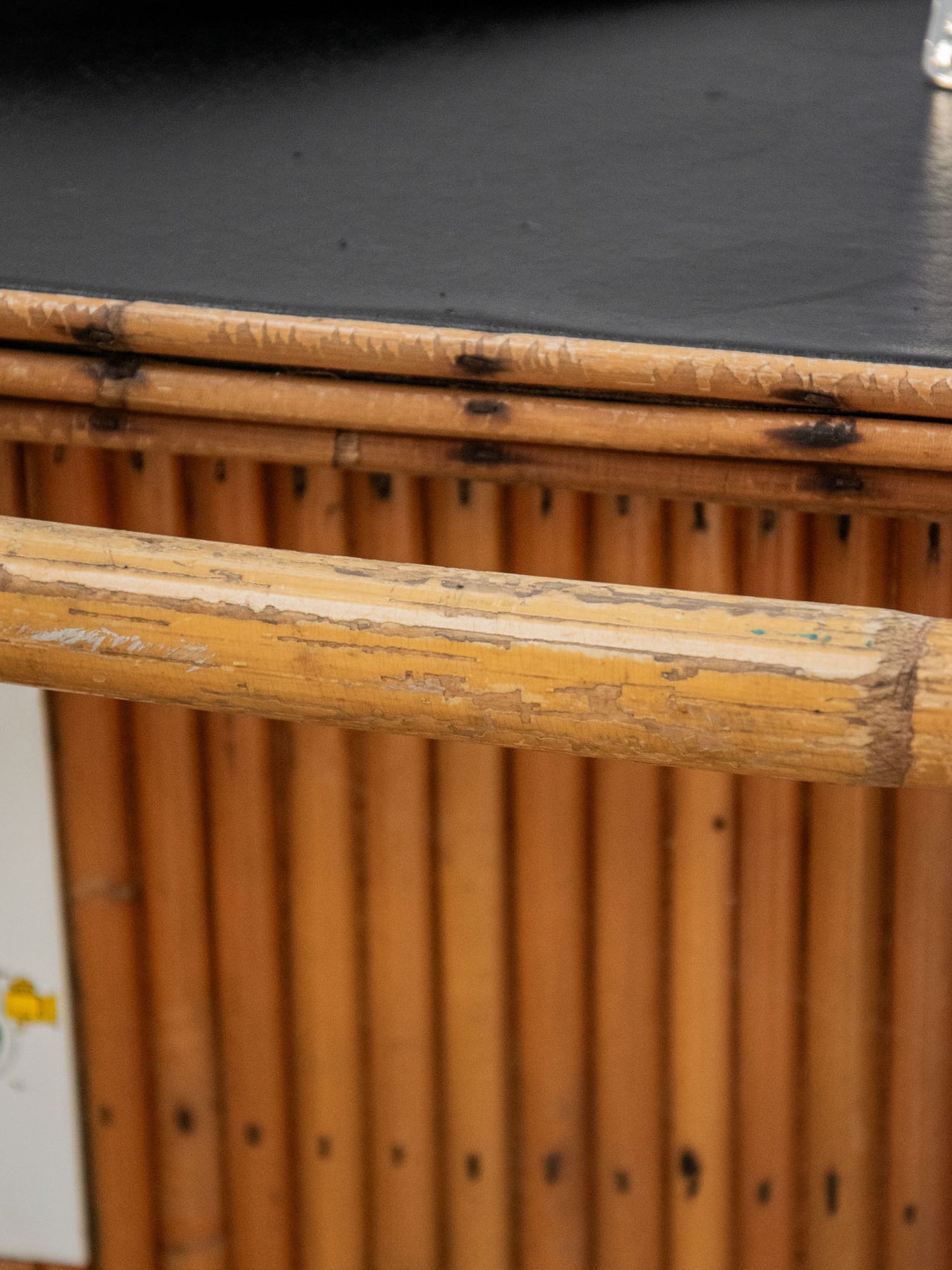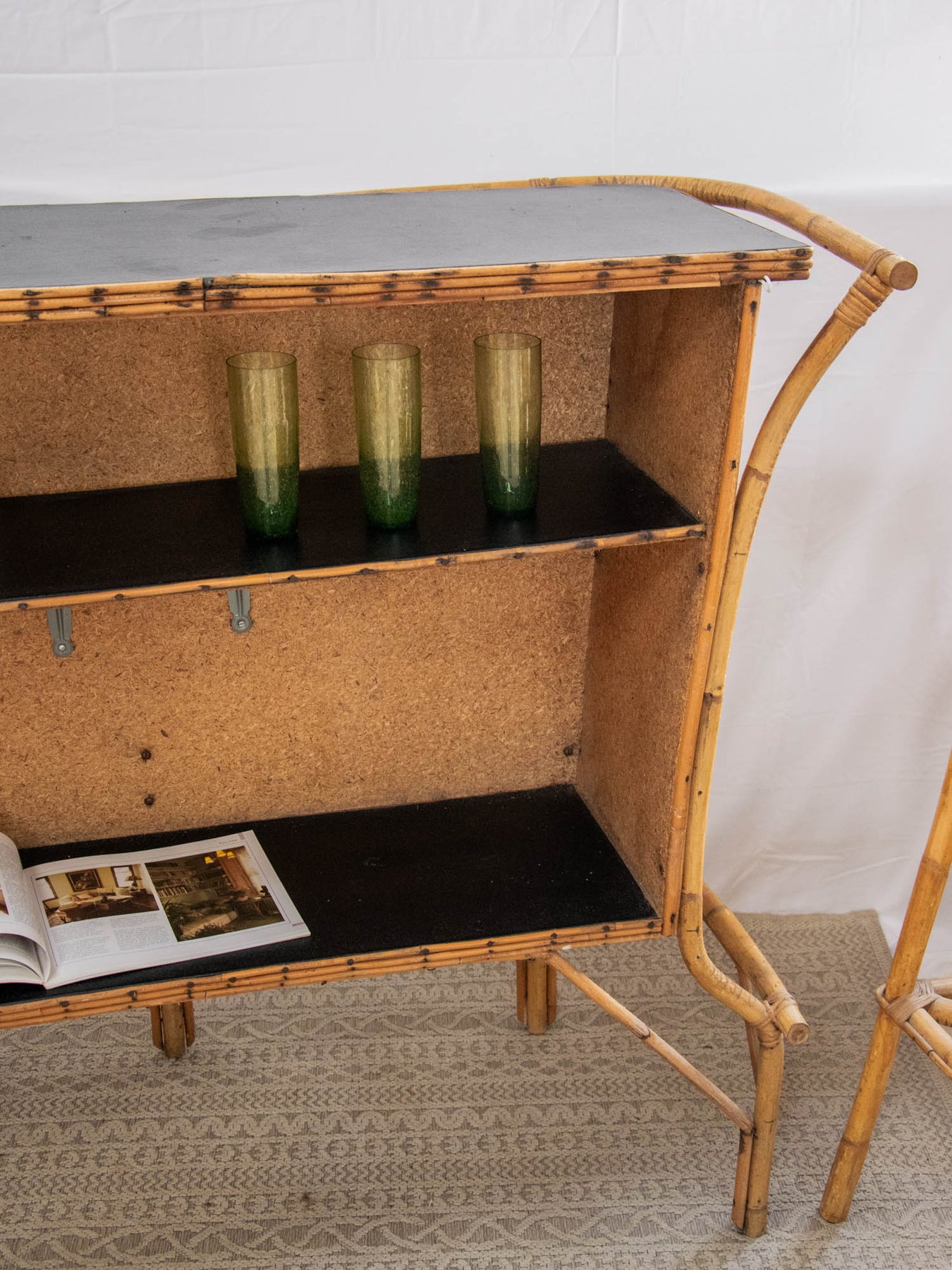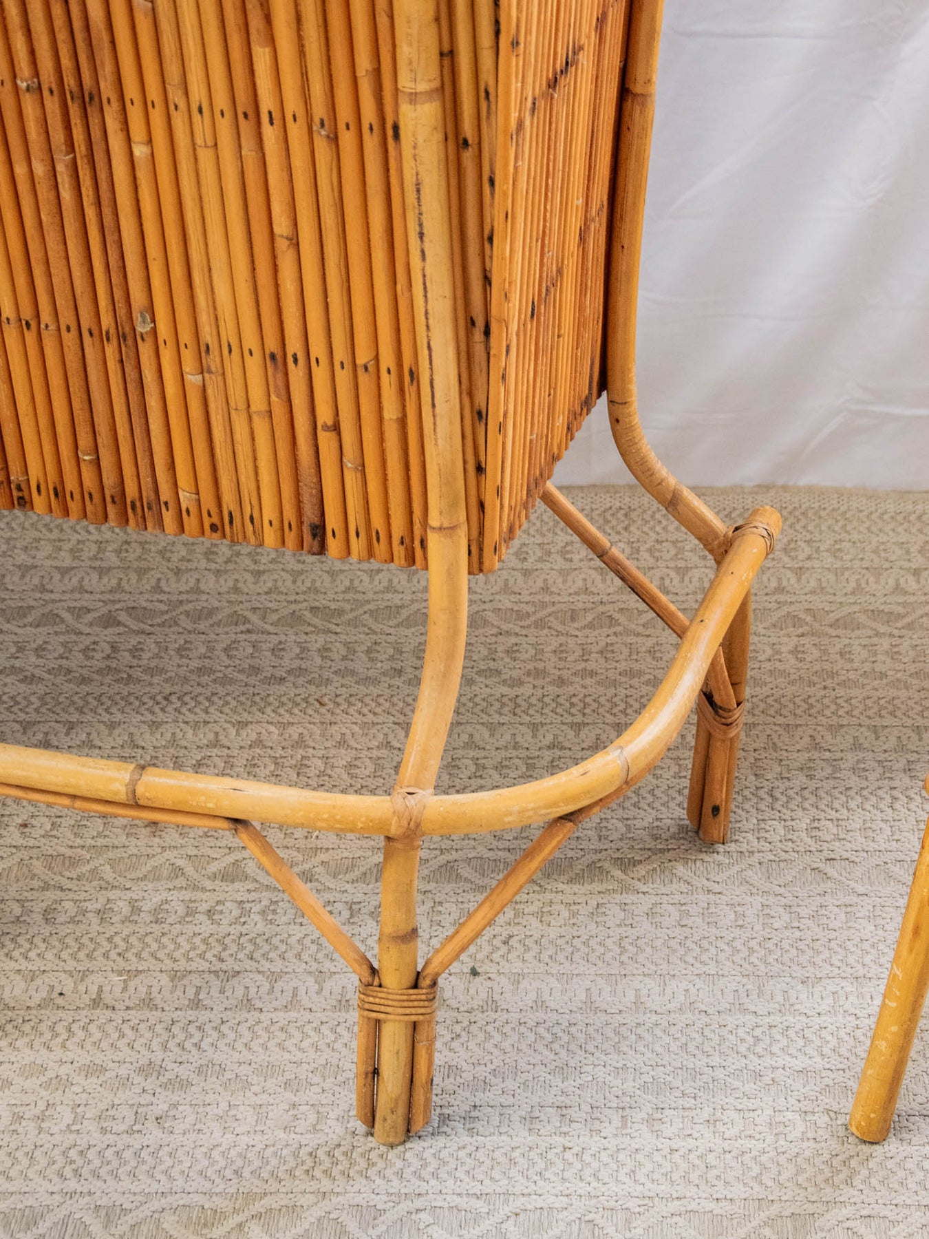 Découvrez notre élégant bar en rotin, alliant modernité et charme intemporel. Avec ses pieds fins et son plateau noir, il s'intègre parfaitement dans tout type d'intérieur. Ce meuble pratique offre deux espaces de rangement à l'intérieur, dotés de grandes niches pour accueillir vos bouteilles et accessoires. La touche finale est apportée par ses trois carreaux de faïence blancs à l'avant, ornés de délicats dessins peints, ajoutant une note artistique à votre espace. Un choix idéal pour les amateurs de décoration raffinée !