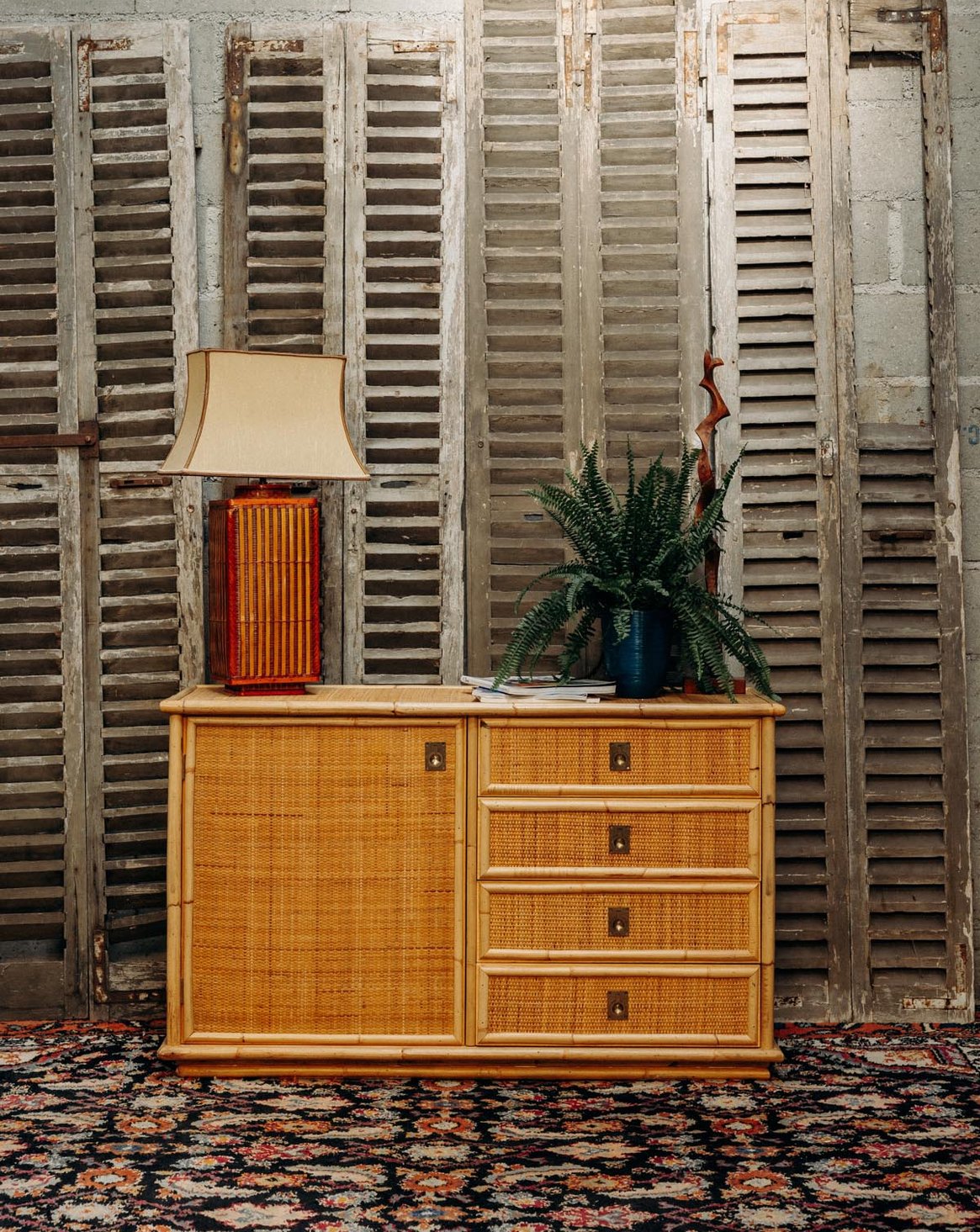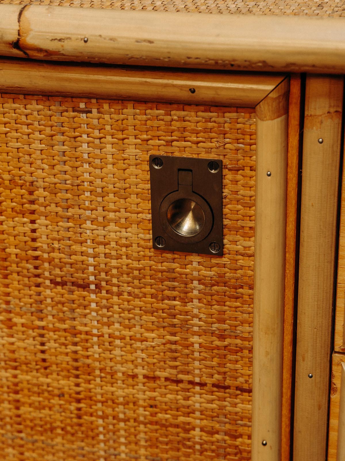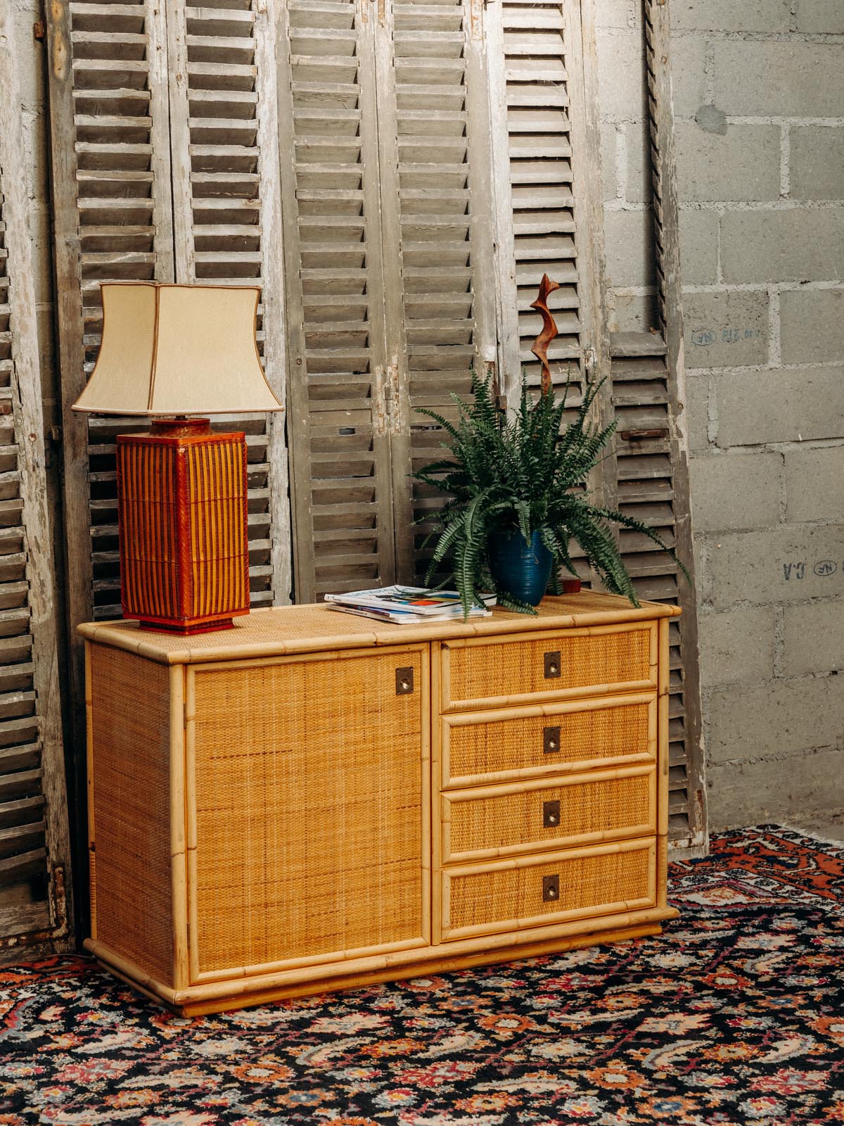 Découvrez cette commode en rotin à 4 tiroirs et 1 placard, un meuble emblématique du design Italien de 1979. Son esthétique chic et intemporelle est sublimée par des poignées en métal au style contemporain. Pratique et élégante, elle offre un espace de rangement généreux tout en ajoutant une touche chaleureuse à votre intérieur. Apportez une note d’authenticité et de charme à votre décoration avec cette pièce unique.