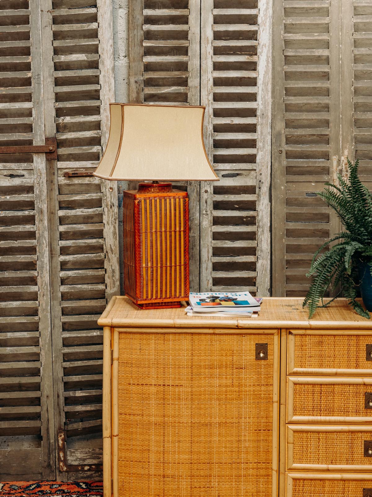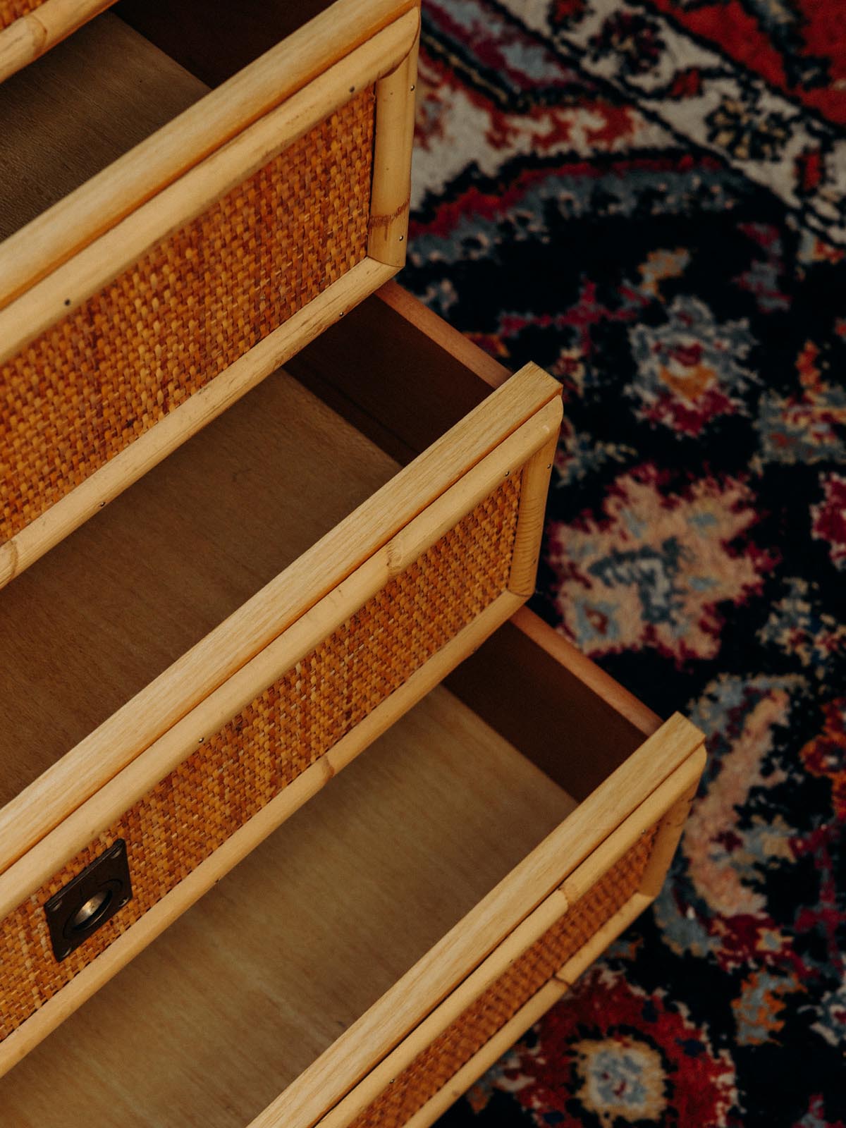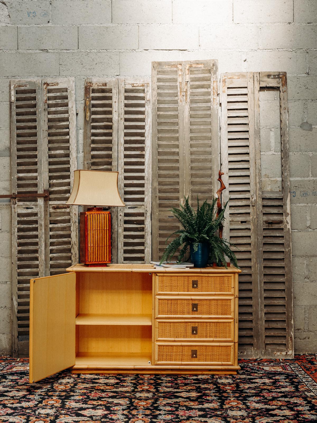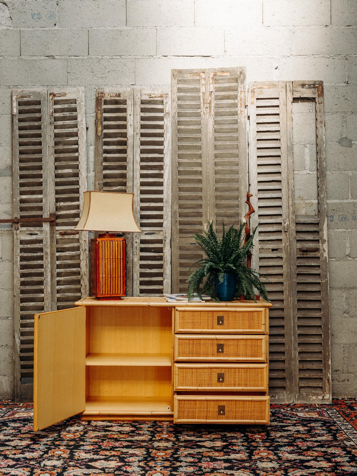 Découvrez cette commode en rotin à 4 tiroirs et 1 placard, un meuble emblématique du design Italien de 1979. Son esthétique chic et intemporelle est sublimée par des poignées en métal au style contemporain. Pratique et élégante, elle offre un espace de rangement généreux tout en ajoutant une touche chaleureuse à votre intérieur. Apportez une note d’authenticité et de charme à votre décoration avec cette pièce unique.