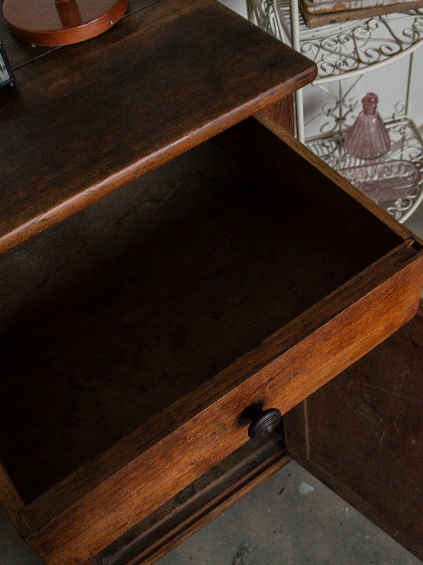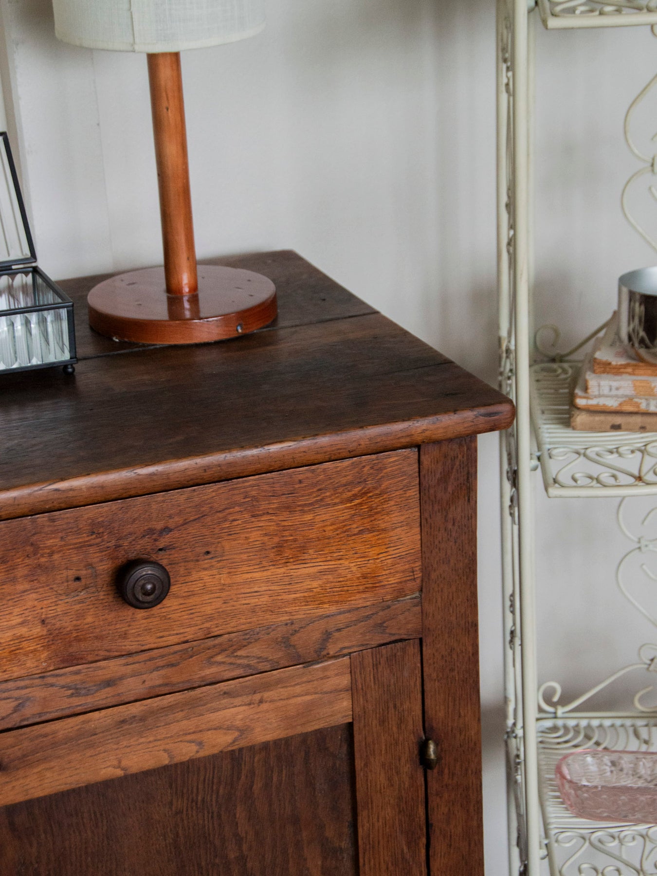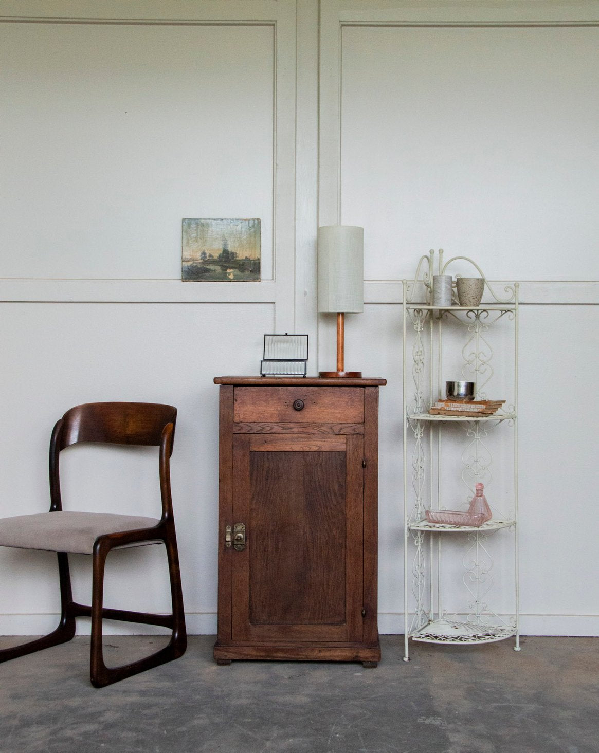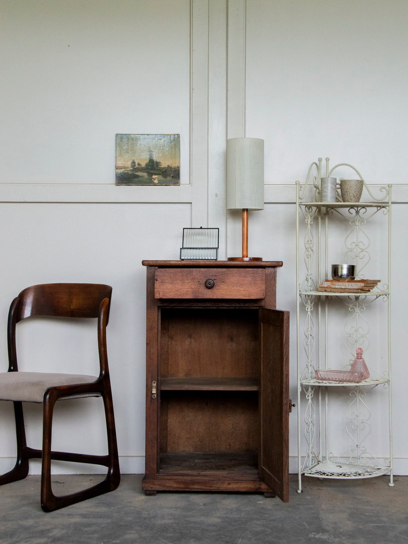 Buffet fin, aux dimensions d’un gros chevet, au style simple et fonctionnel. Il dispose d’un tiroir et d’un placard en bois foncé, offrant un rangement discret et pratique. La poignée ronde en bois apporte une touche naturelle et harmonieuse au meuble. Pièce de seconde main soigneusement sélectionnée, idéale pour compléter un intérieur avec charme et sobriété.